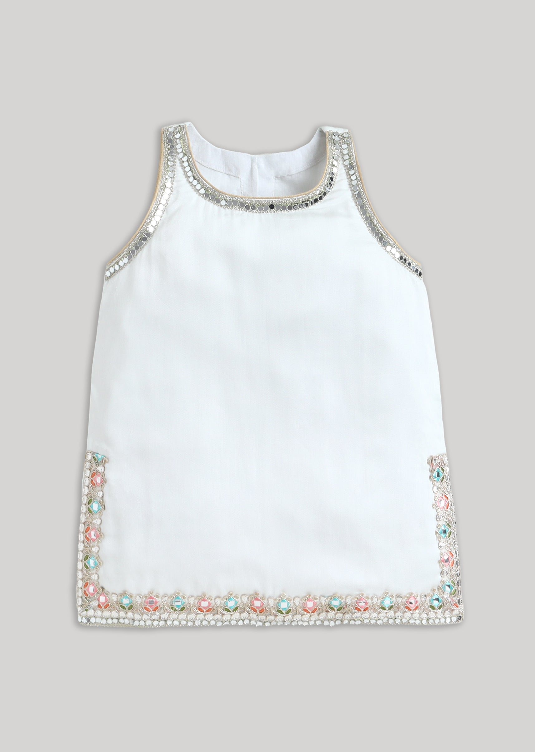 This girl’s salwar kameez set comes in a soft off-white base with multicolour accents that feel fresh and celebration-ready. Crafted in breathable muslin, it’s light on the skin and easy for kids to move around in through long functions. Mirror detailing adds just the right festive sparkle without looking heavy. Comes with a matching dupatta, making it a complete traditional outfit for weddings, family gatherings, and festivals. Awarded as the Most Trusted Brand, we're delivering styles you love, just as promised.