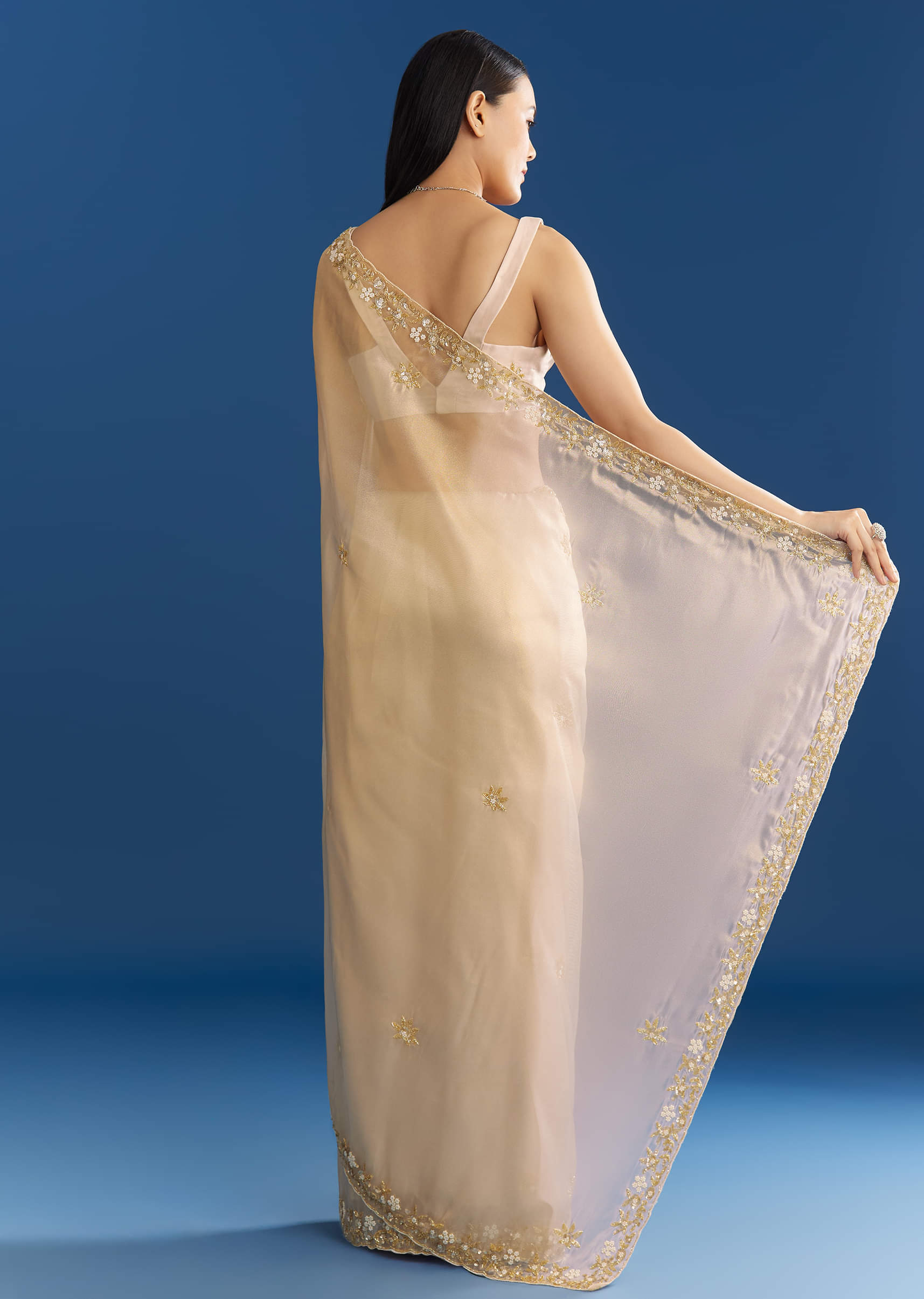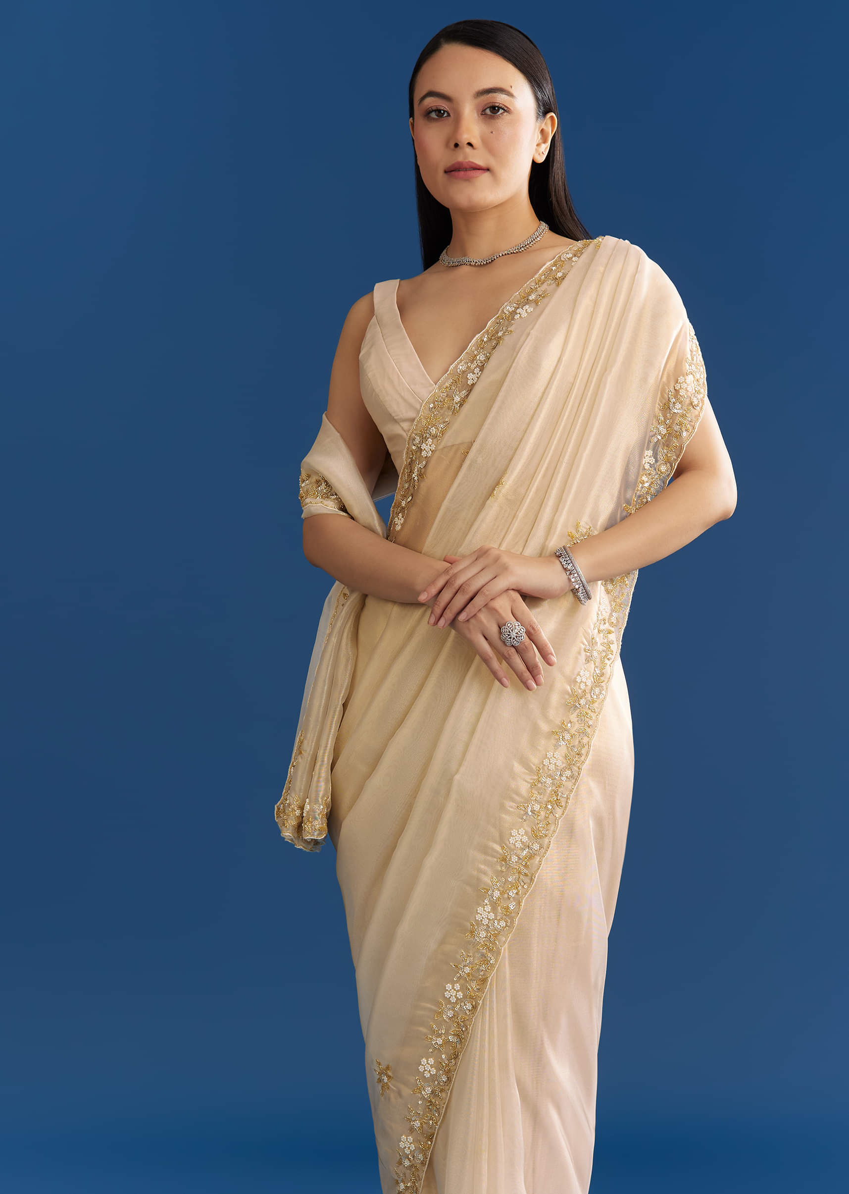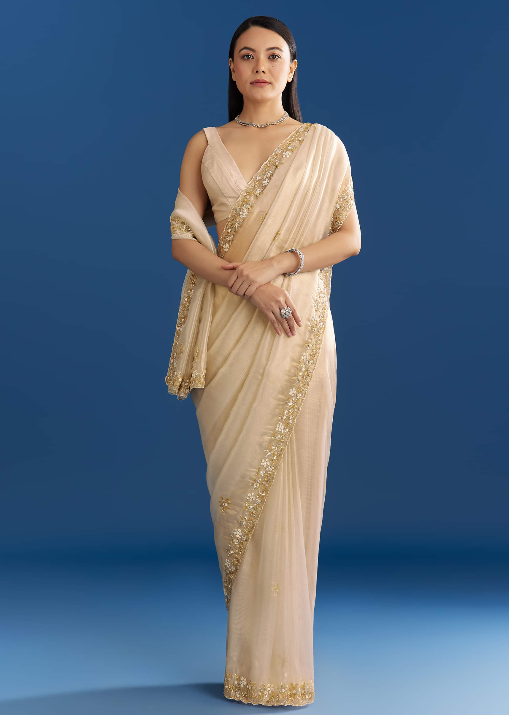 This off white organza tissue saree glistens with a fine scallop border embroidered using cutdana and beads. It feels like wearing a gentle breeze woven in moonlight. Awarded as the Most Trusted Brand, we're delivering styles you love, just as promised.