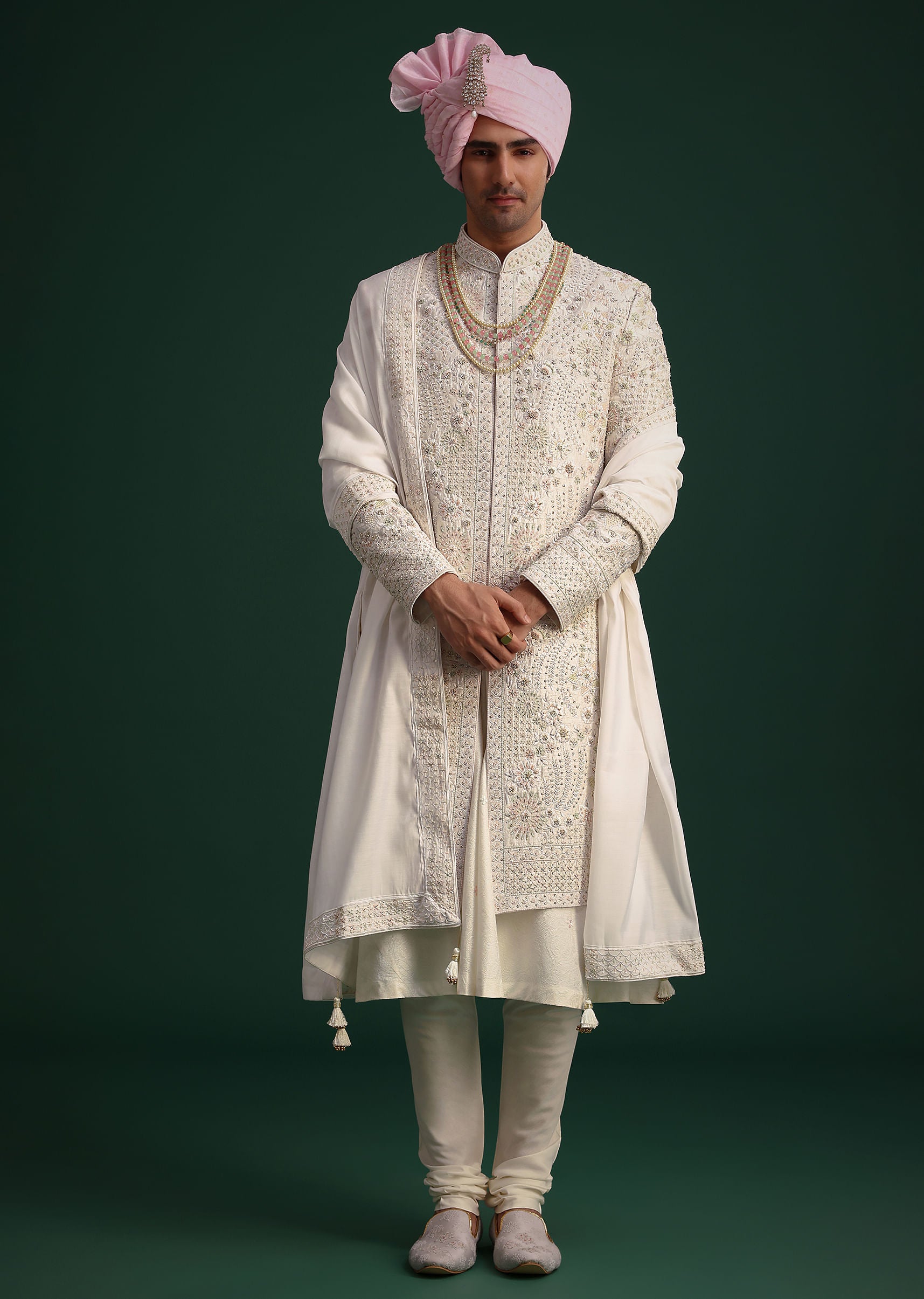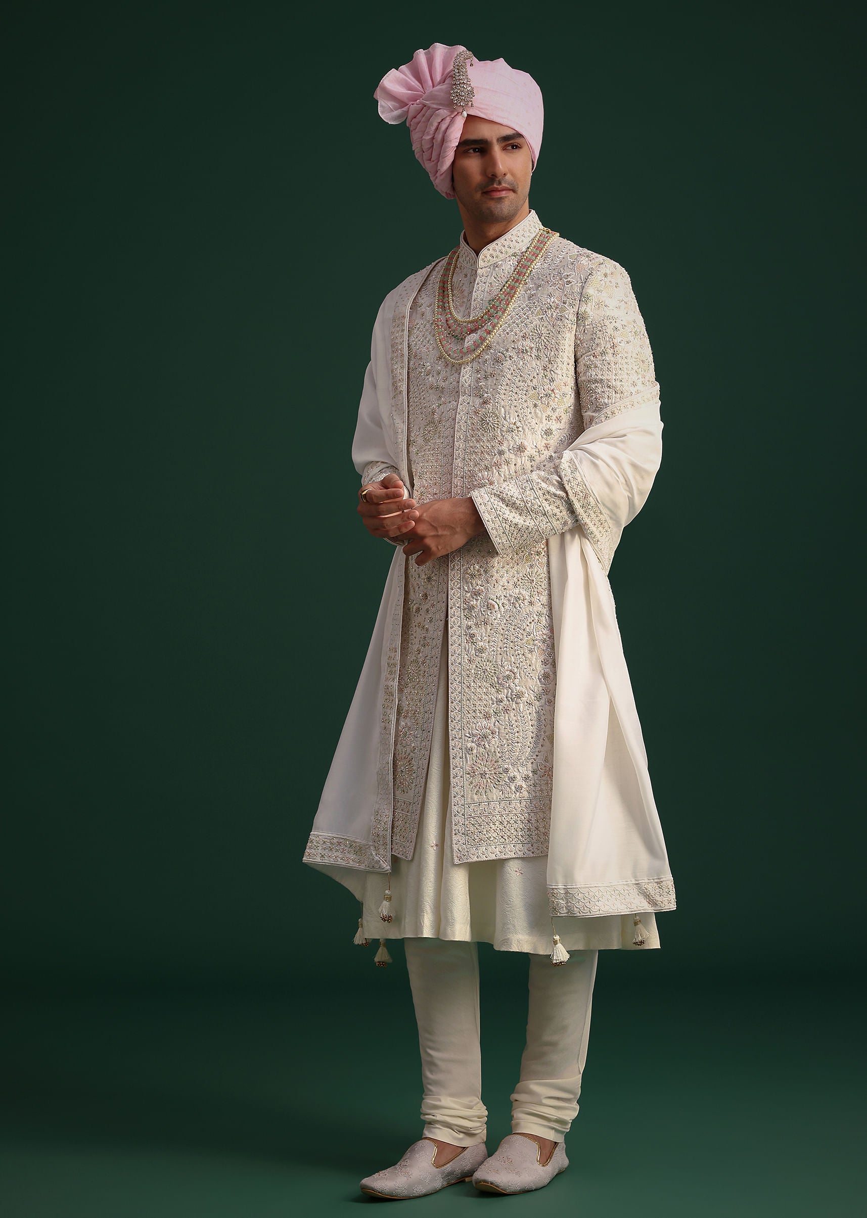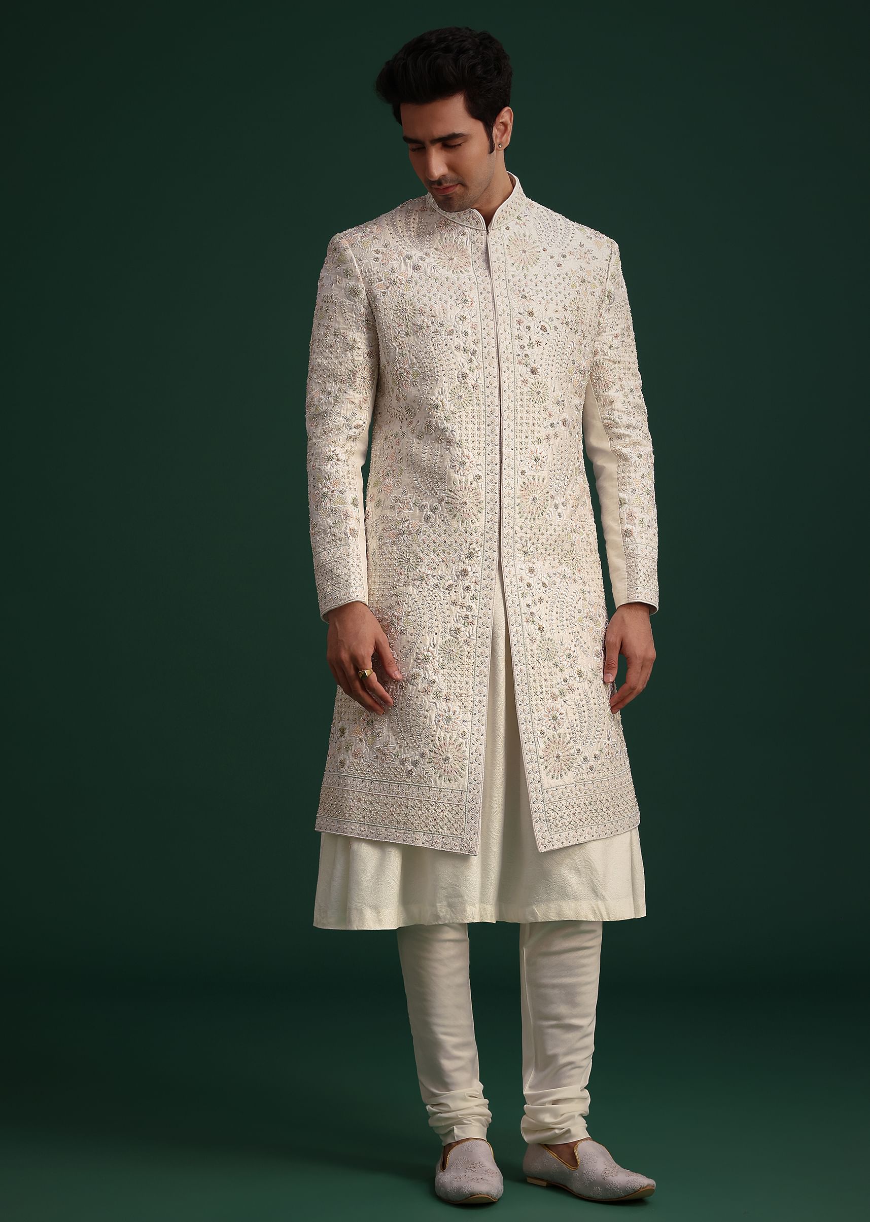 Fit Tips:Ensure the sherwani fits comfortably around the chest and shoulders with a slightly tapered waist for a flattering silhouette. The sleeves should sit just above the wrists while the dupatta should cascade elegantly over the shoulder for a majestic finish.