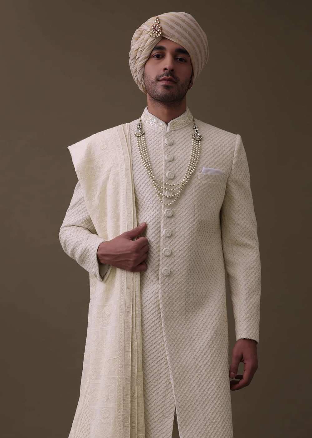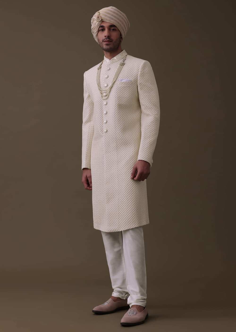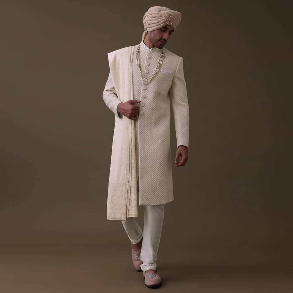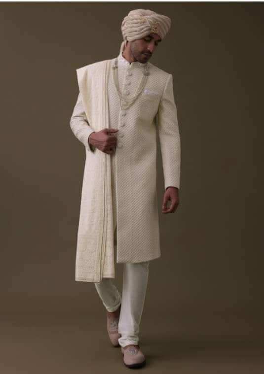 - Introducing our exquisite off-white sherwani set.