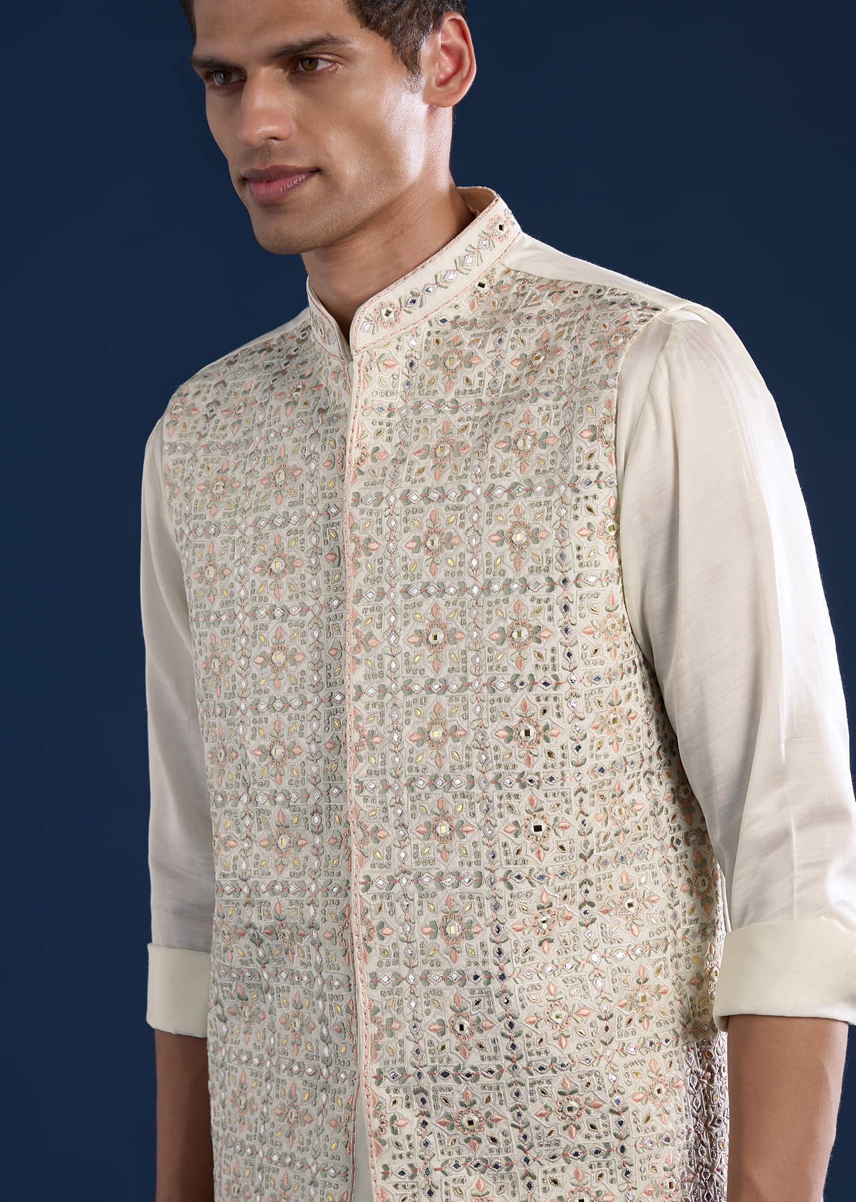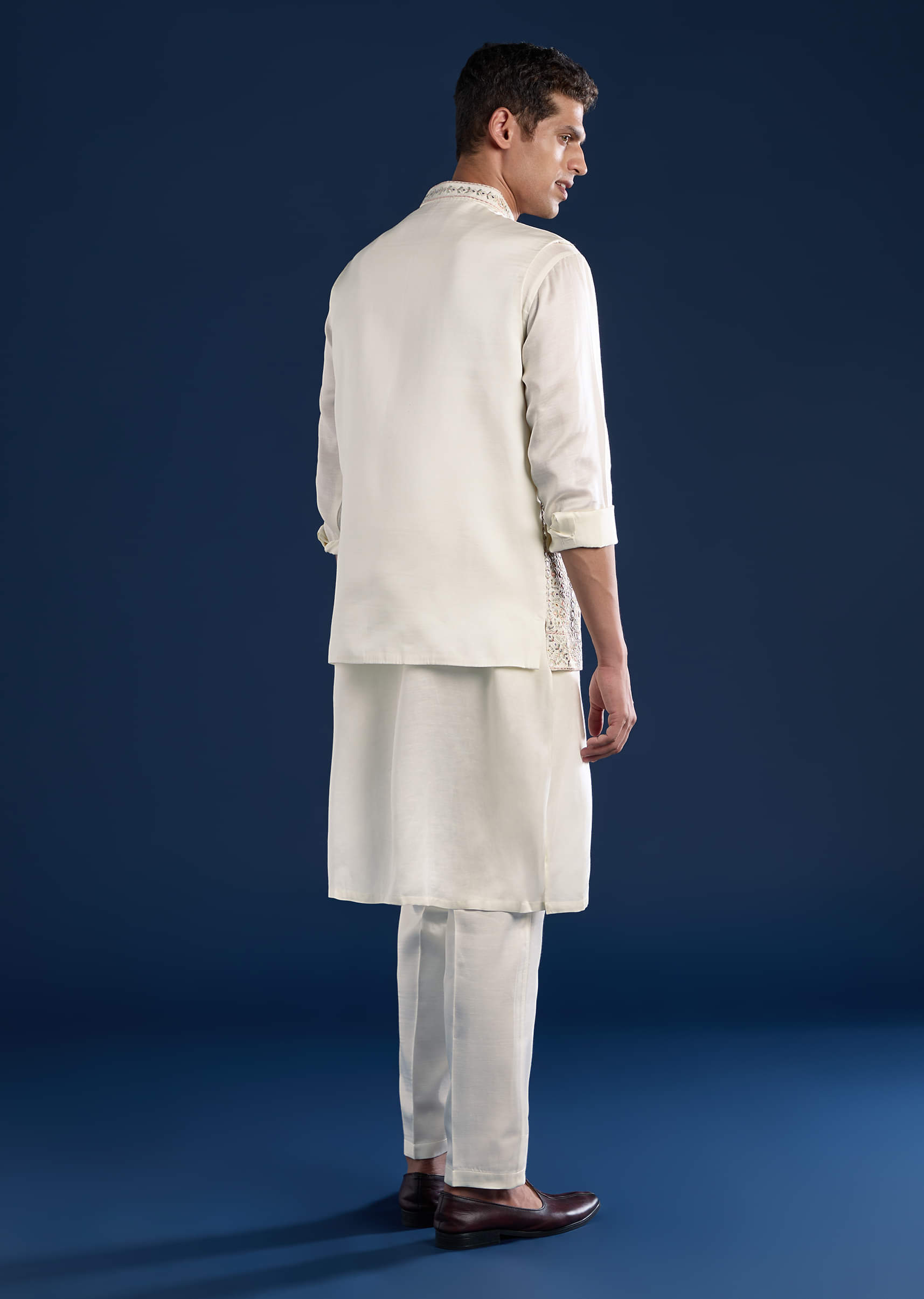A refined expression of traditional artistry, this off-white silk jacket and kurta set with matching pants exudes timeless sophistication. The ensemble is intricately adorned with mirror, thread, and gotta work... More Product Details
