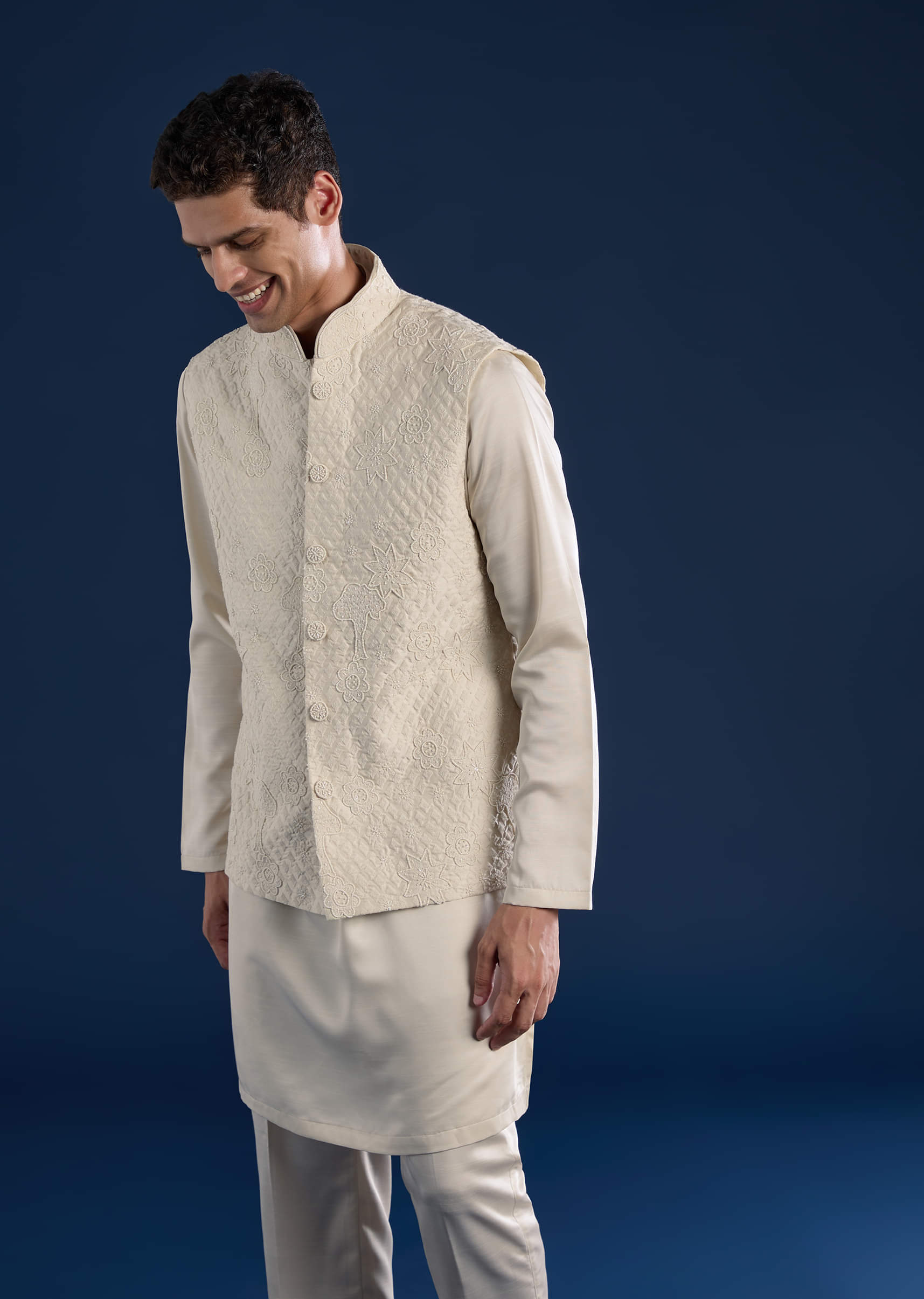 Embodying timeless elegance, this off-white silk jacket and kurta set with matching pants reflects refined craftsmanship and subtle luxury. The delicate moti work adds a soft shimmer, enhancing the natural... More Product Details