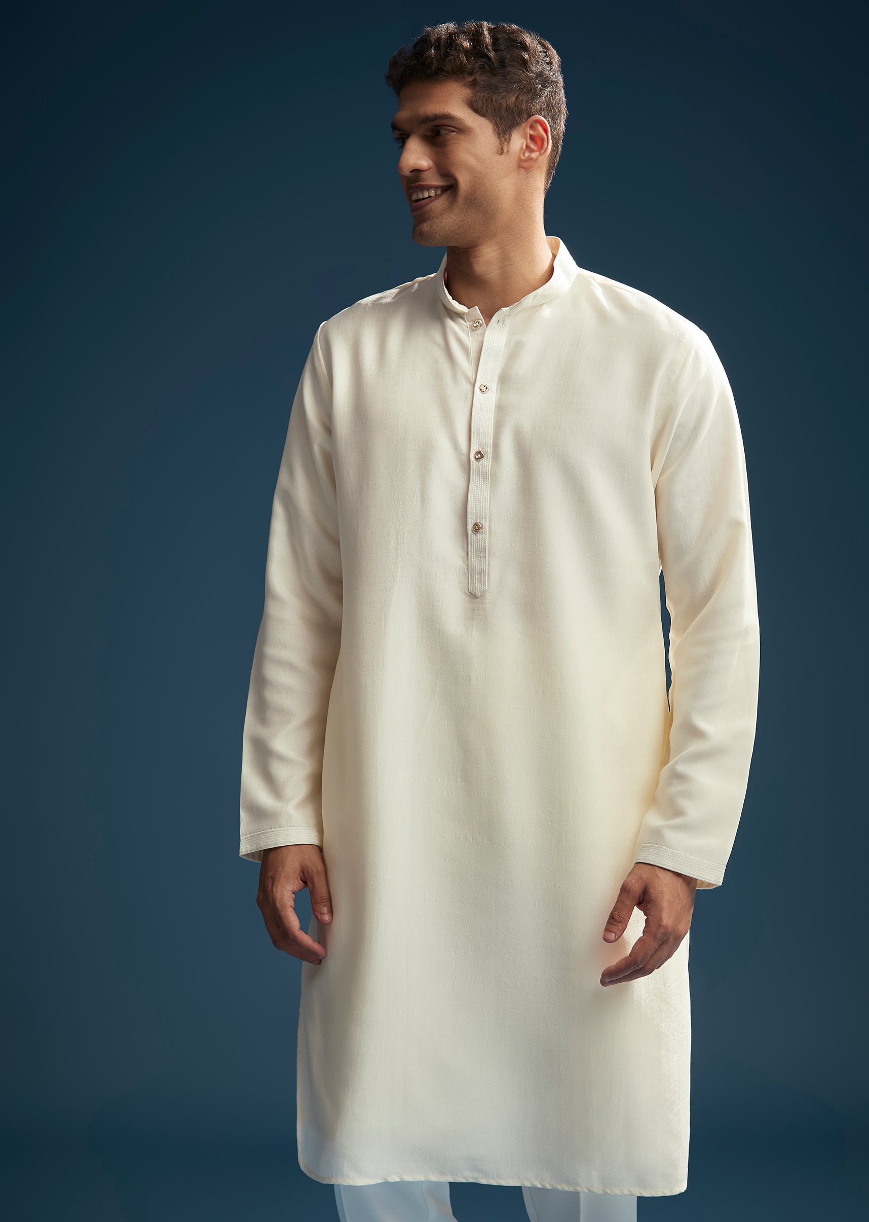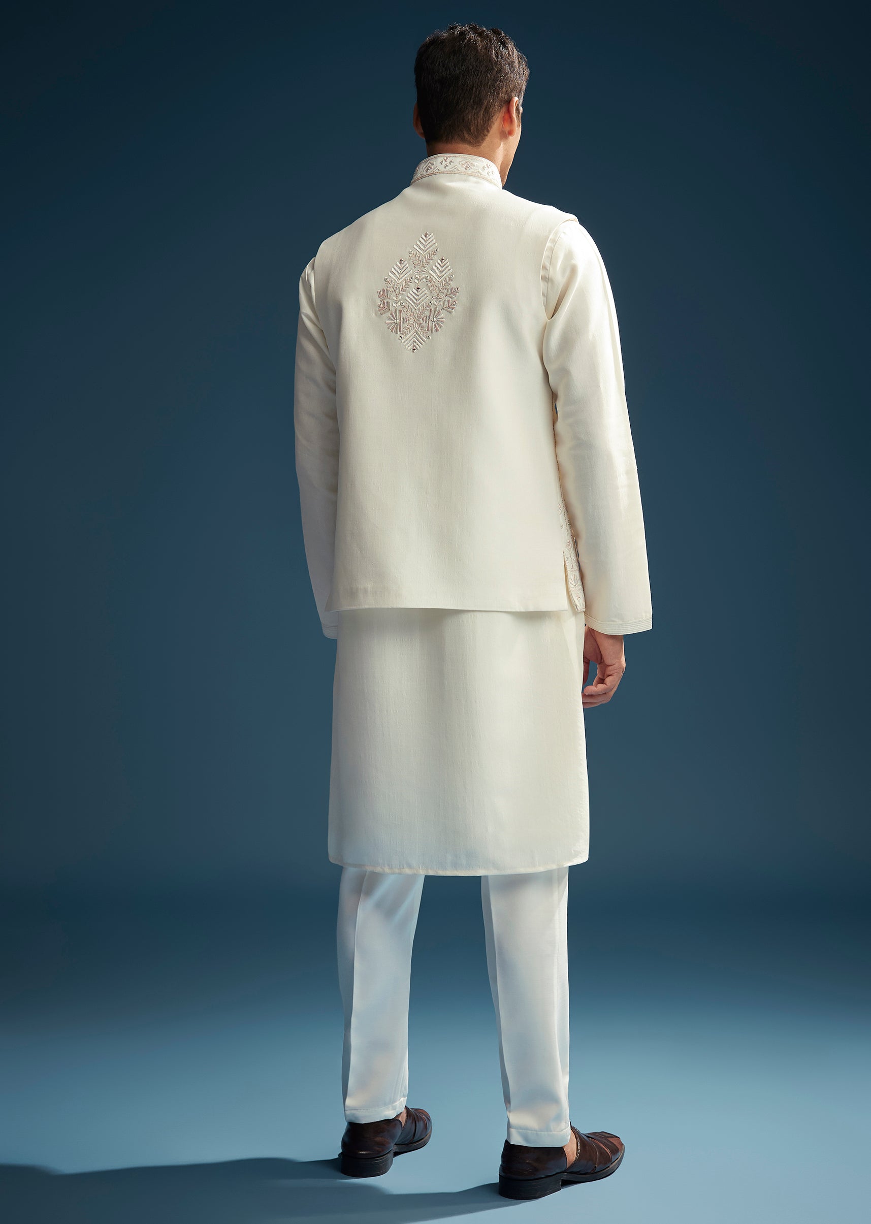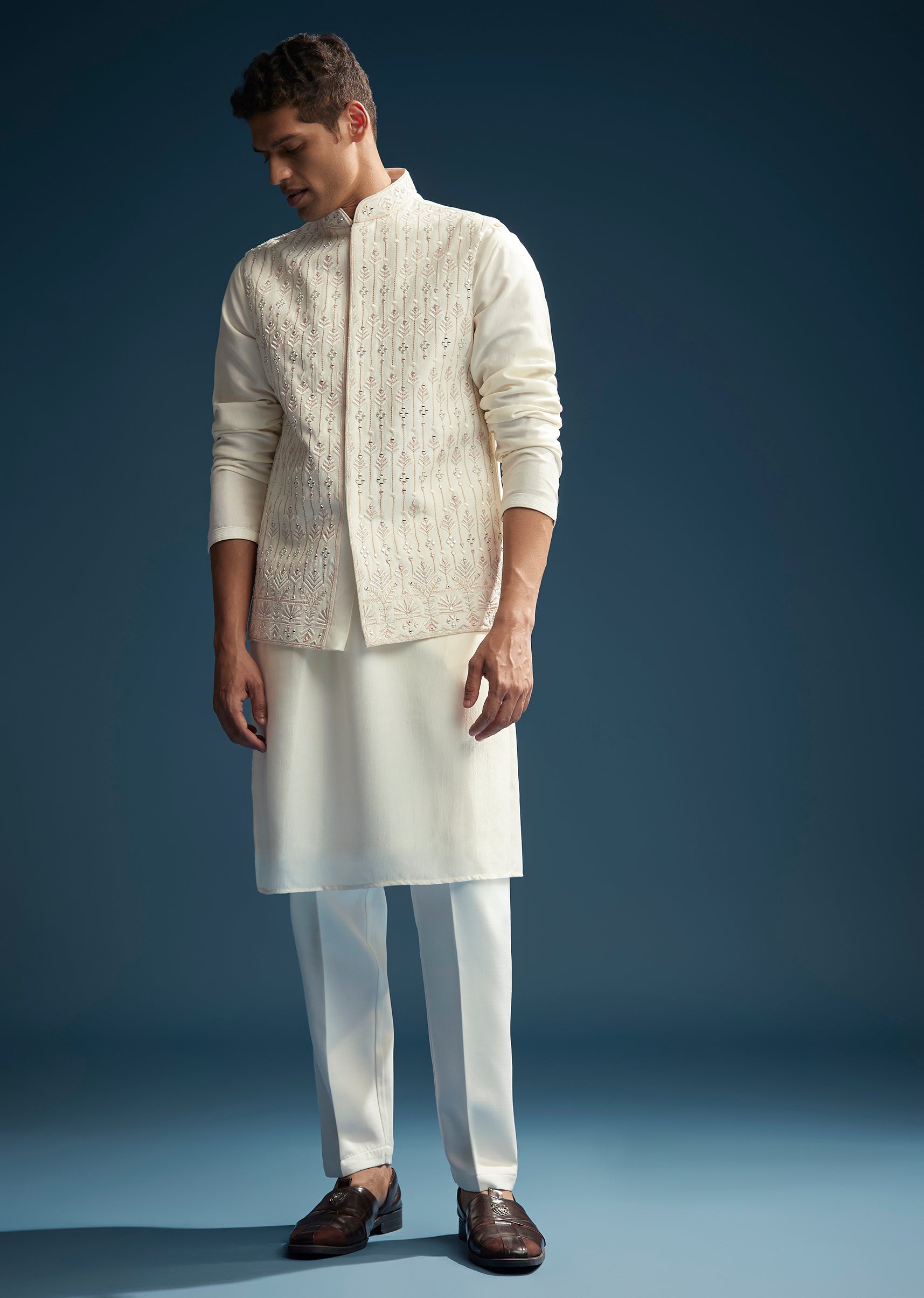 Off White Silk Kurta Jacket Set For Men With Mirror Embroidery