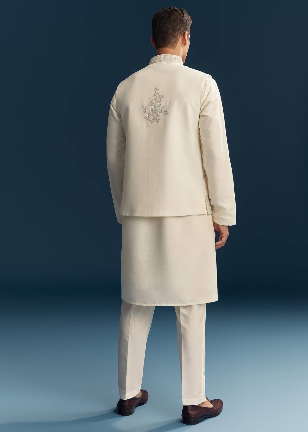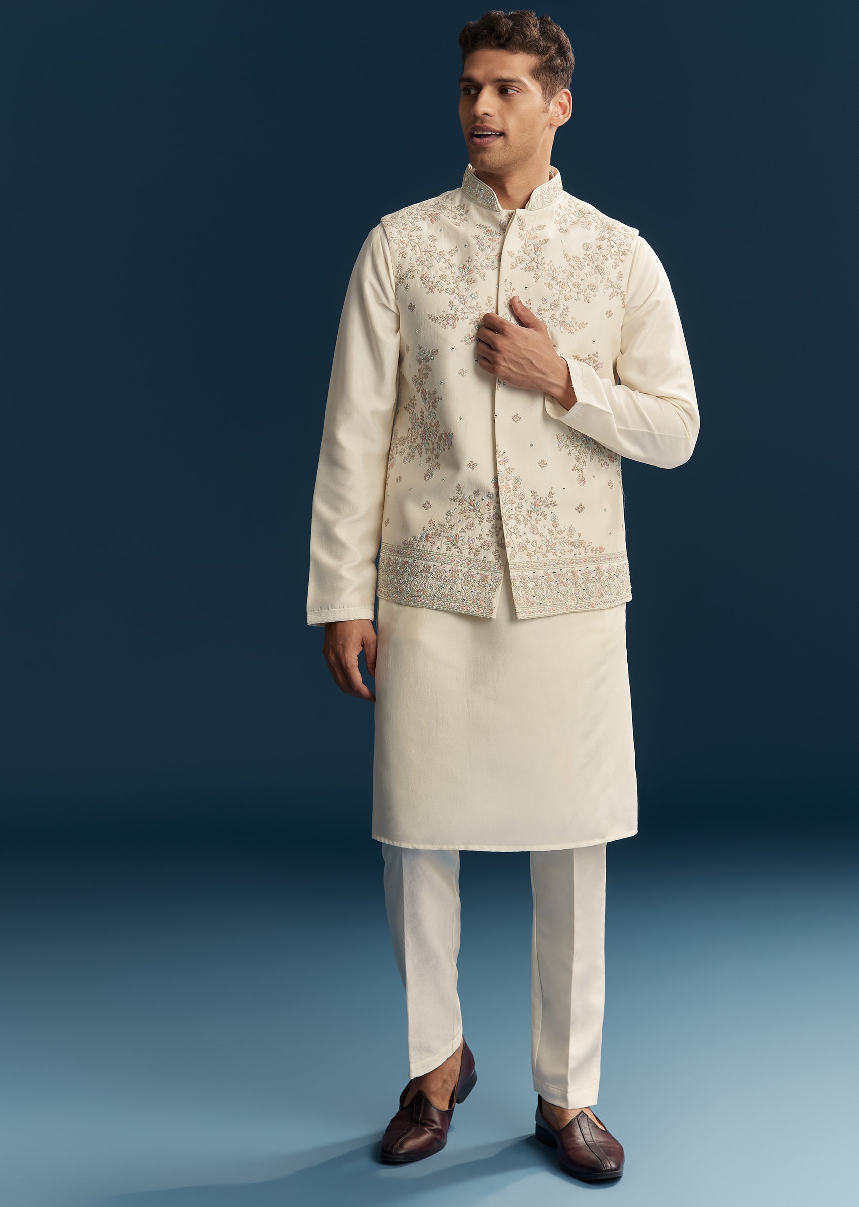 Elegant and understated, this off white kurta jacket set is perfect for festive receptions and wedding celebrations. Crafted in smooth silk fabric, it features detailed thread work that adds subtle texture and traditional charm. The mandarin collar and full sleeves create a structured and polished silhouette, making it ideal for wedding guests who want a refined and stylish look. Designed for comfort and sophistication, this ensemble ensures a graceful and standout presence during special occasions. Awarded as the Most Trusted Brand, we're delivering styles you love, just as promised.