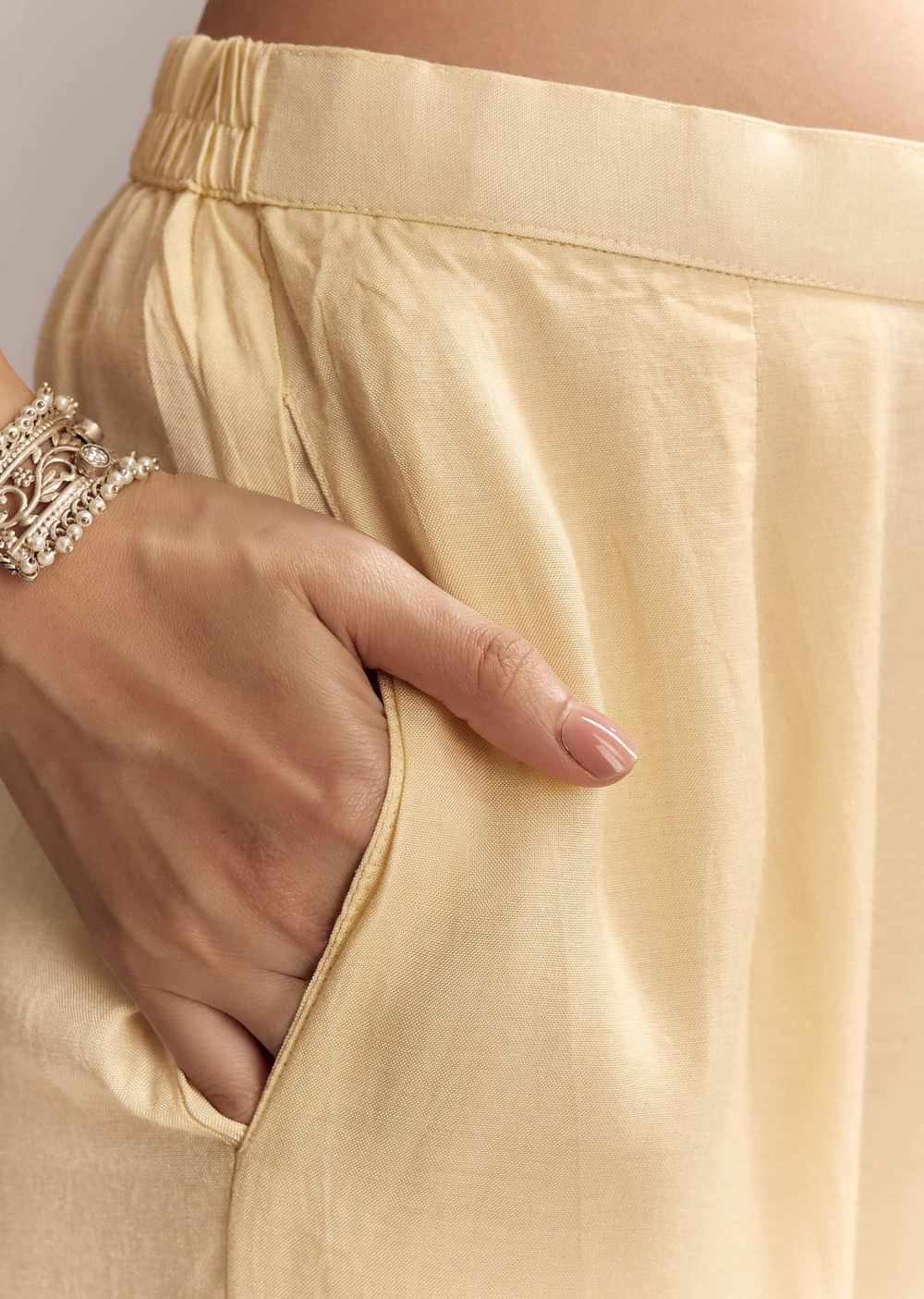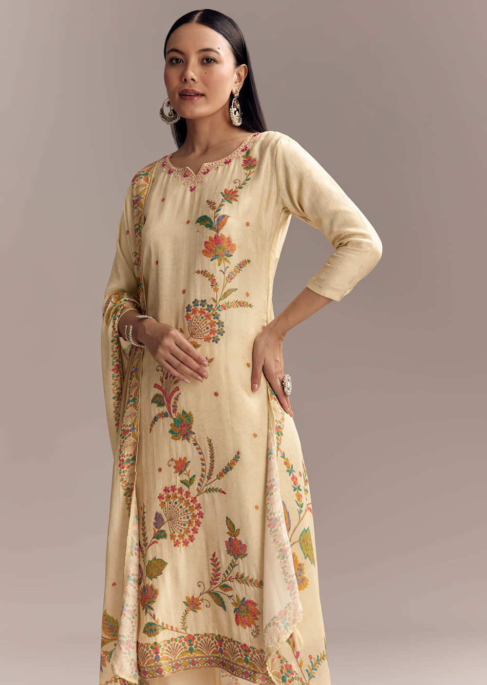 Easy and effortless, this off white silk kurta set keeps the mood relaxed yet polished. A soft floral print adds gentle colour with a neat, day-friendly finish. Perfect for casual... More Product Details