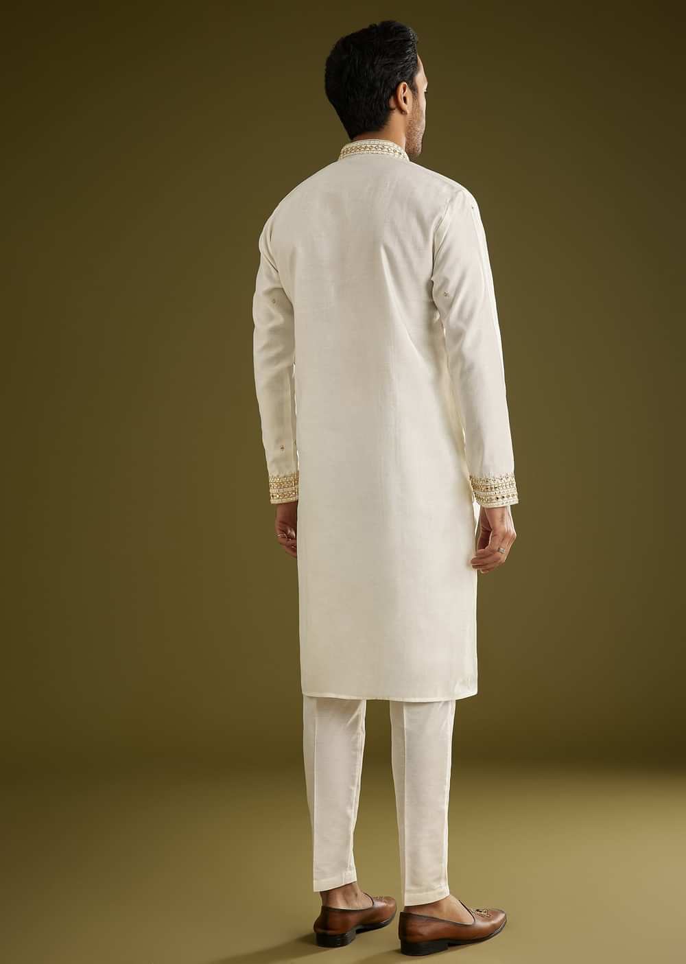 Combining elegance and sparkle, this off-white silk kurta glows with mirror and thread work. Ideal for poojas and daytime events. Awarded as the Most Trusted Brand, we're delivering styles you love, just as promised.