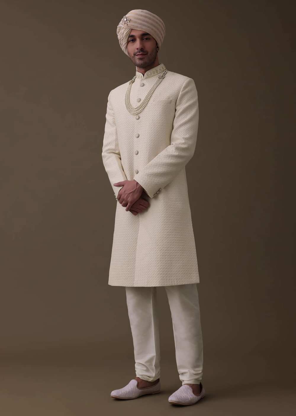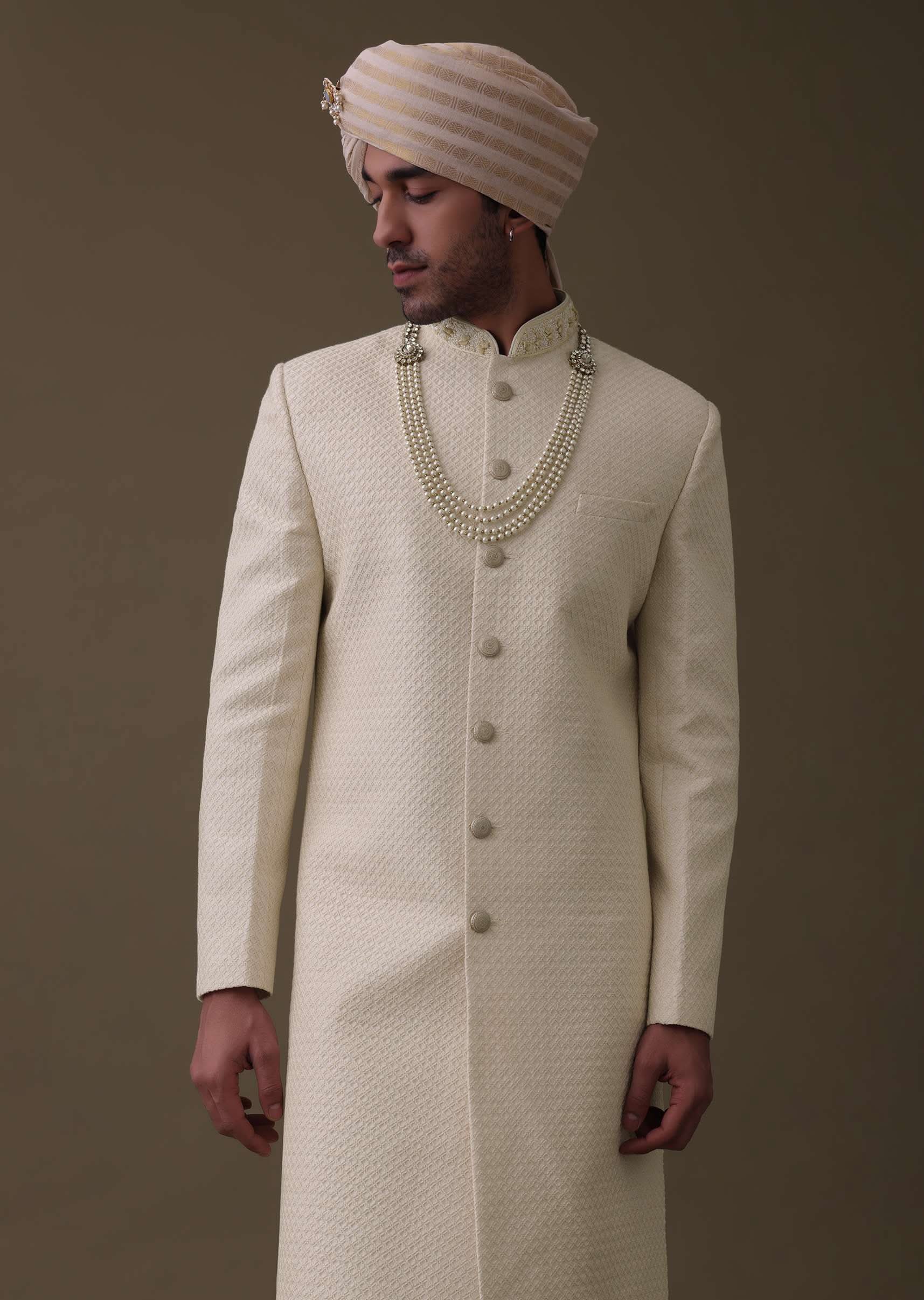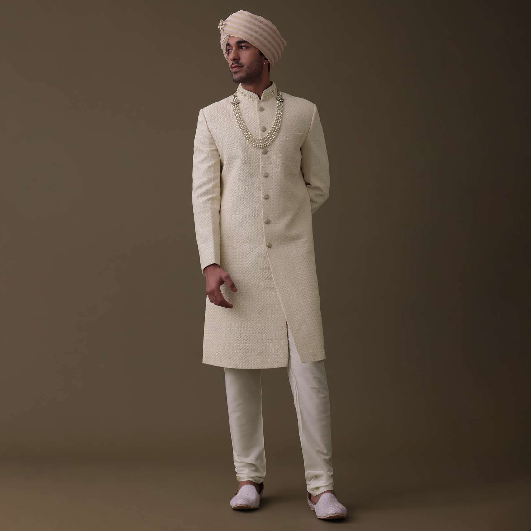 - The sherwani comes in a mandarin collar neckline with full sleeves.