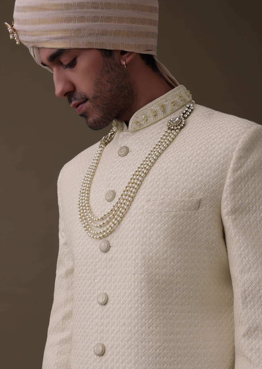 Off White Silk Sherwani Set With Lucknowi Embroidery And Mala
