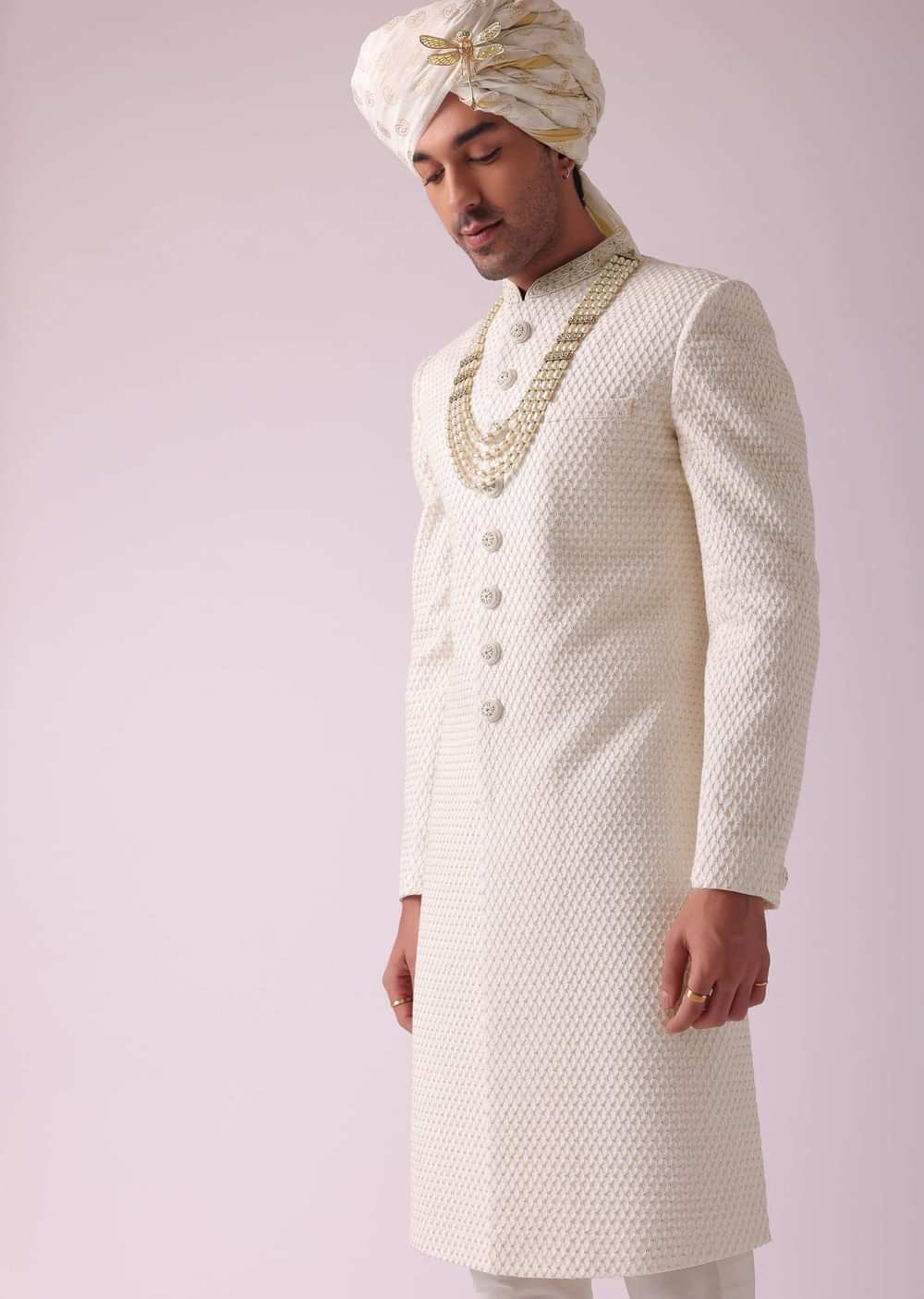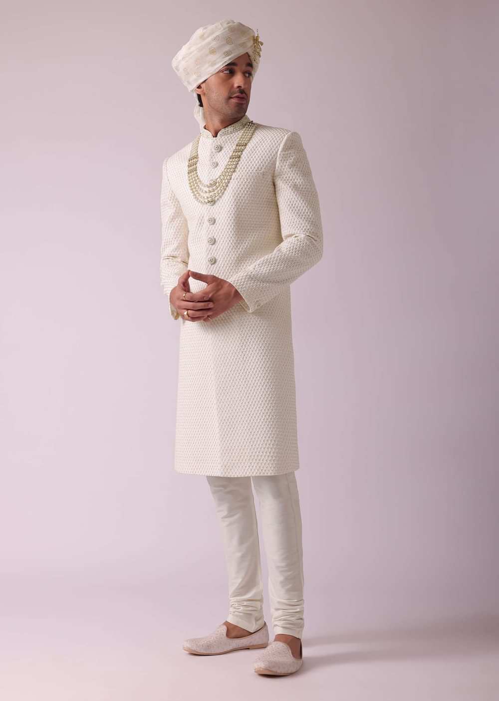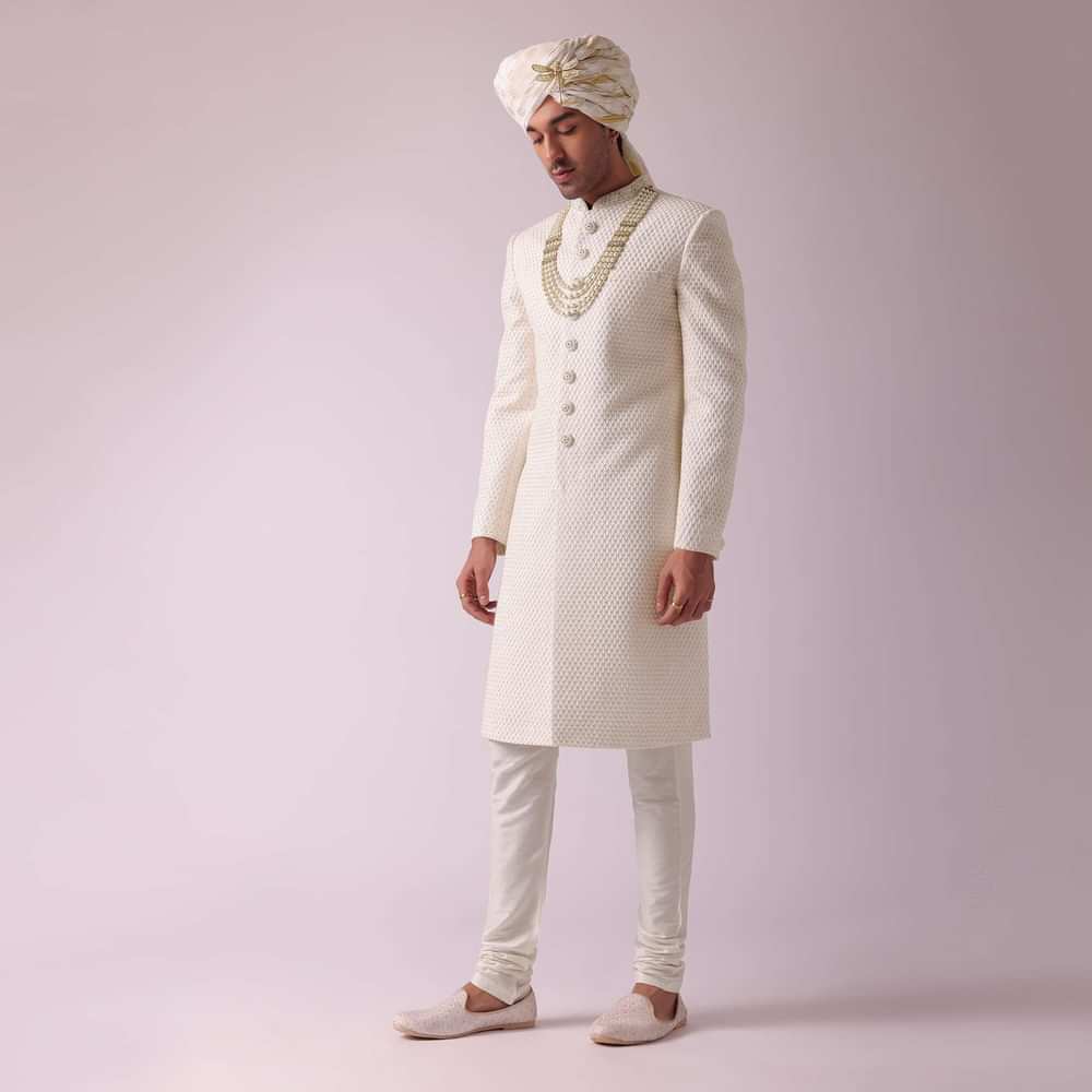 - Introducing our exquisite off-white thread embroidered sherwani set in georgette a fusion of sophistication and intricate detailing.
