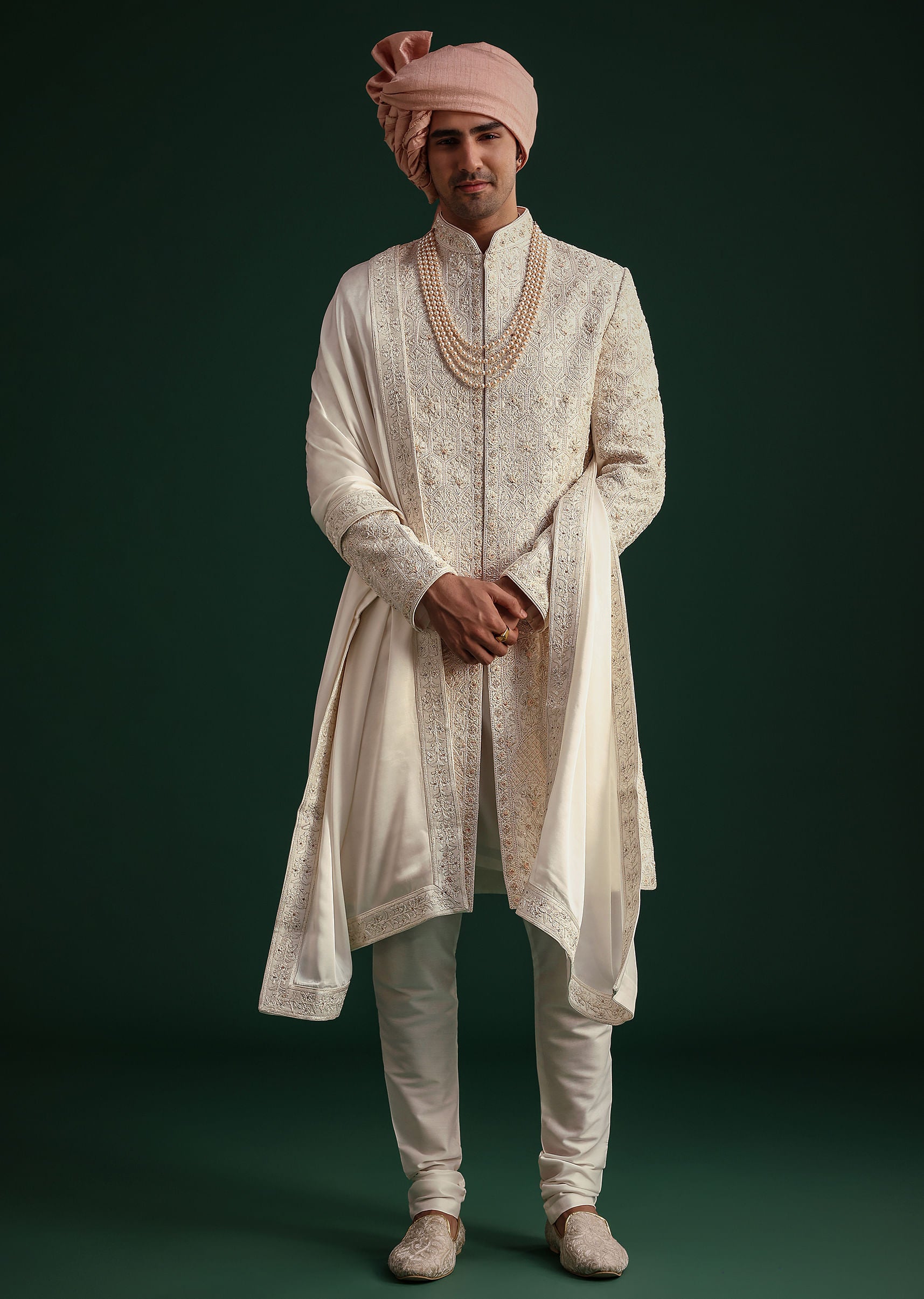 Off White Zari Embroidered Sherwani Set With Mala And Dupatta