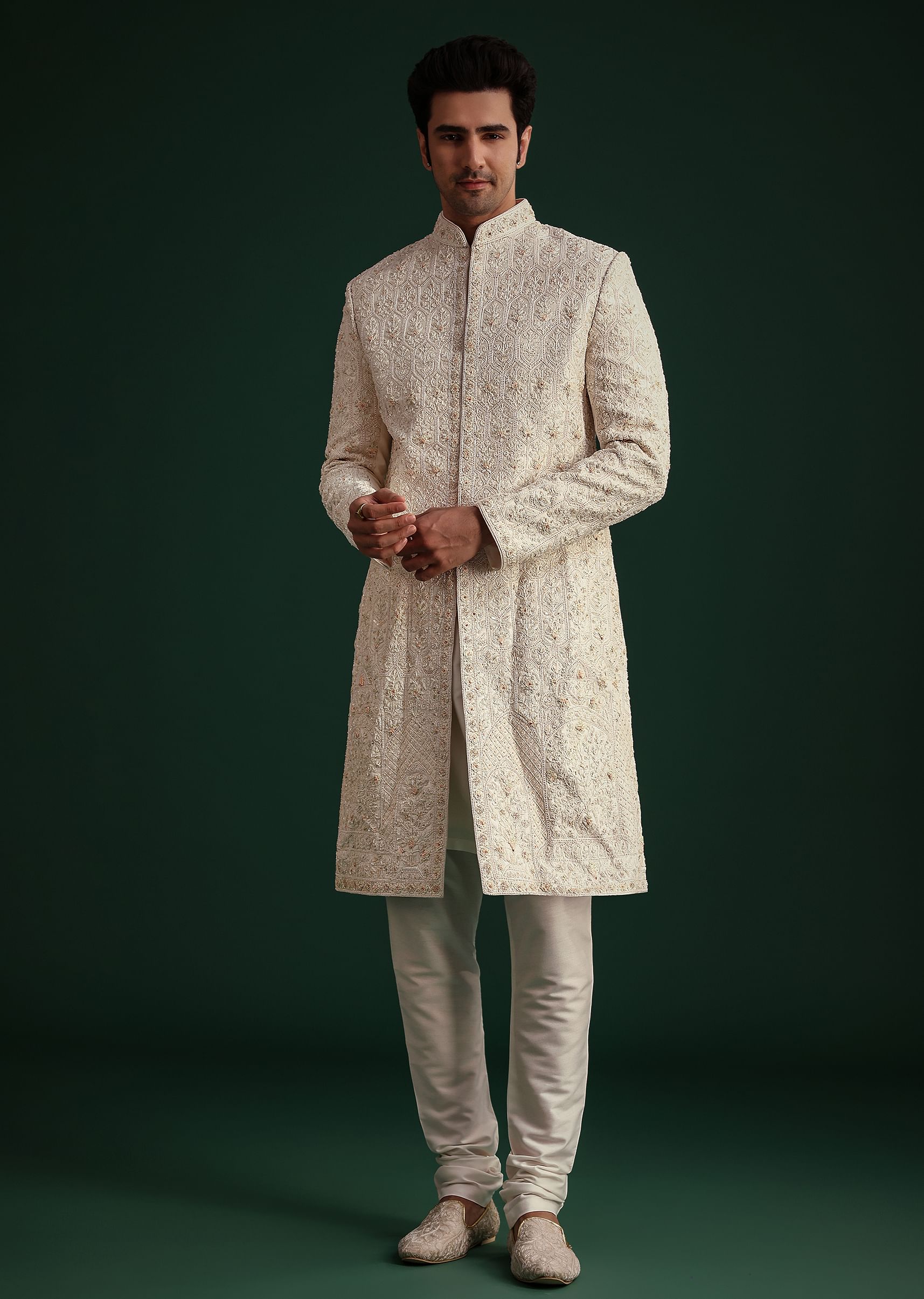 A masterpiece of craftsmanship. Adorned with intricate dori work pearl detailing and stone accents this sherwani features a harmonious blend of green and peach touches complemented by shimmering sequence and... More Product Details