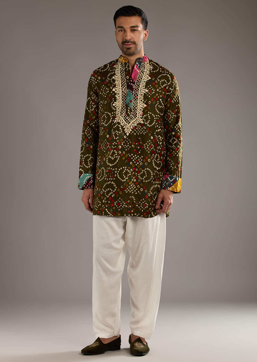 Olive Cotton Silk Kurta Set For Men With Hand Dyed Bandhani Print