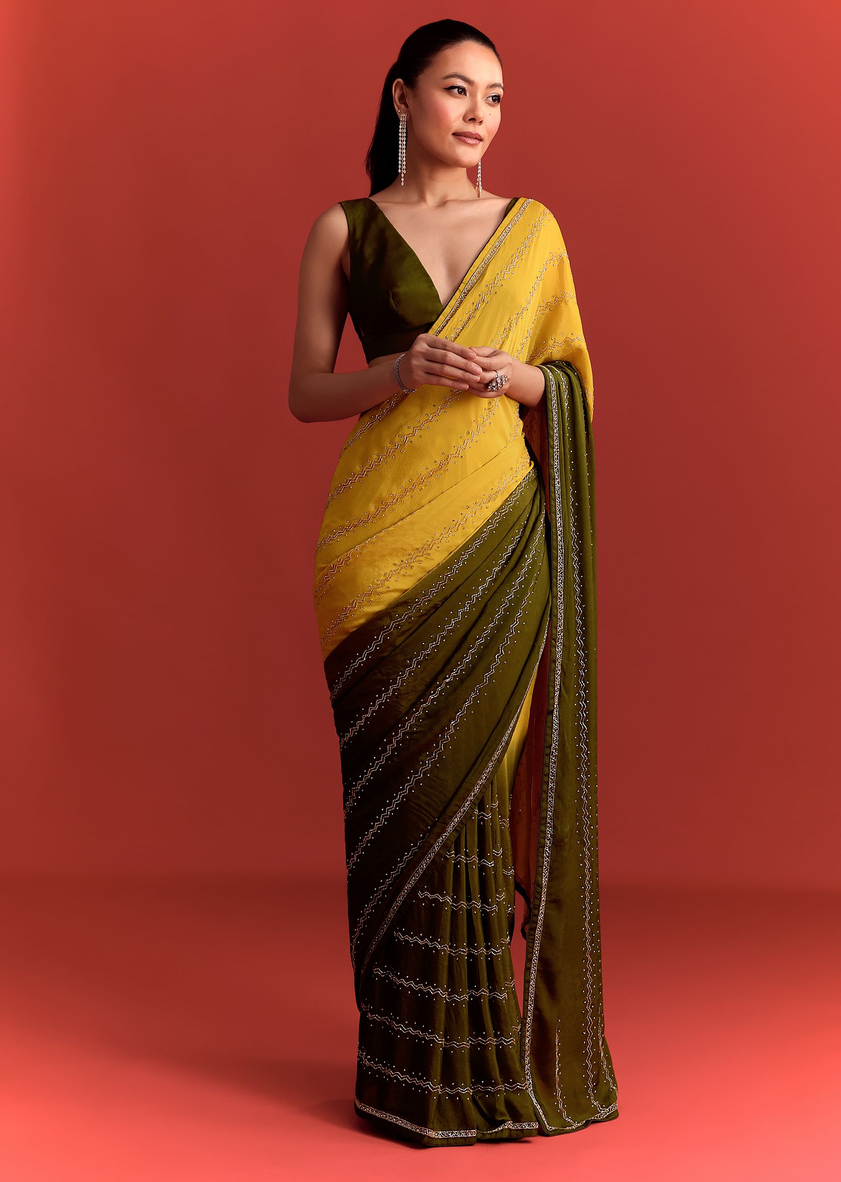 Olive Green Dual Shaded Chinon Saree With Cutdana Work