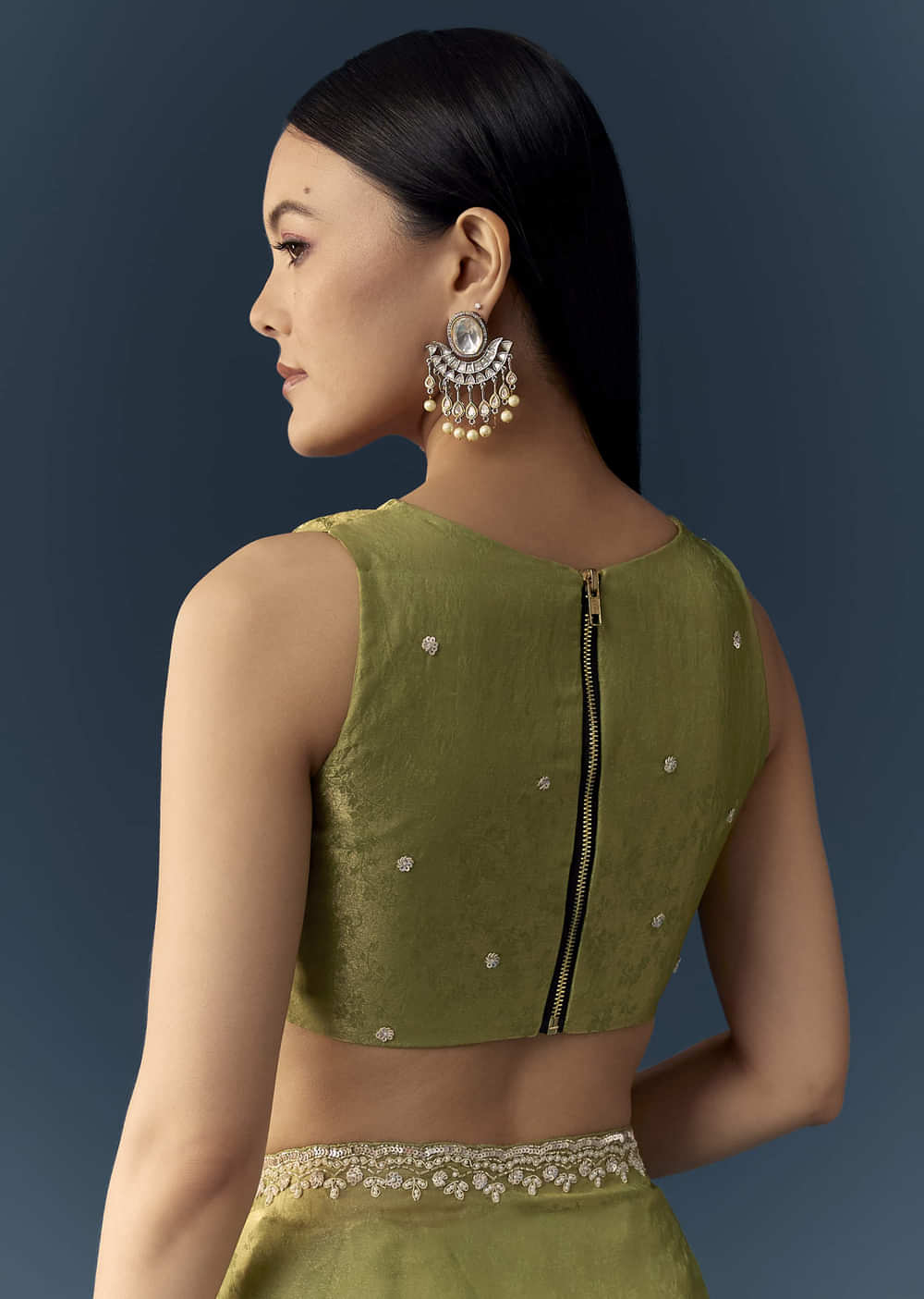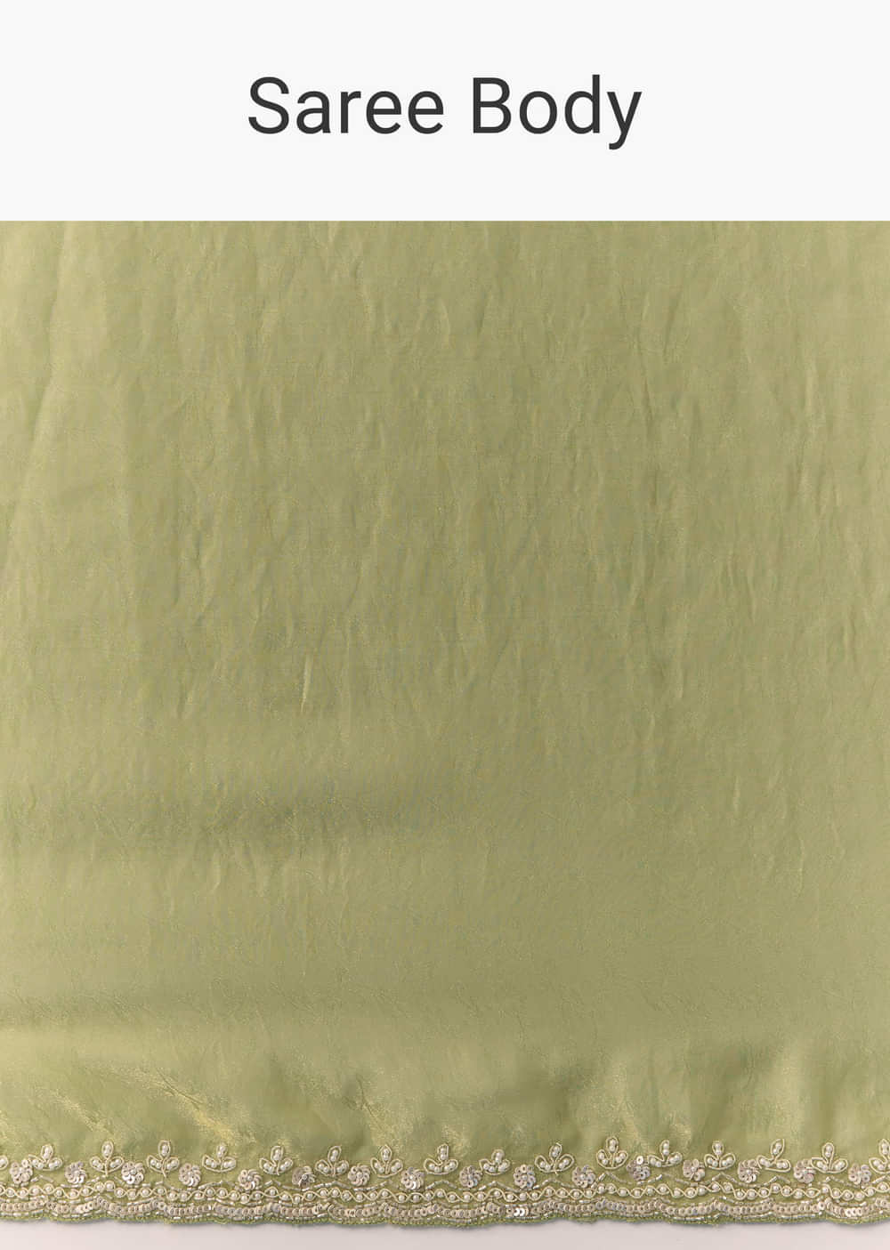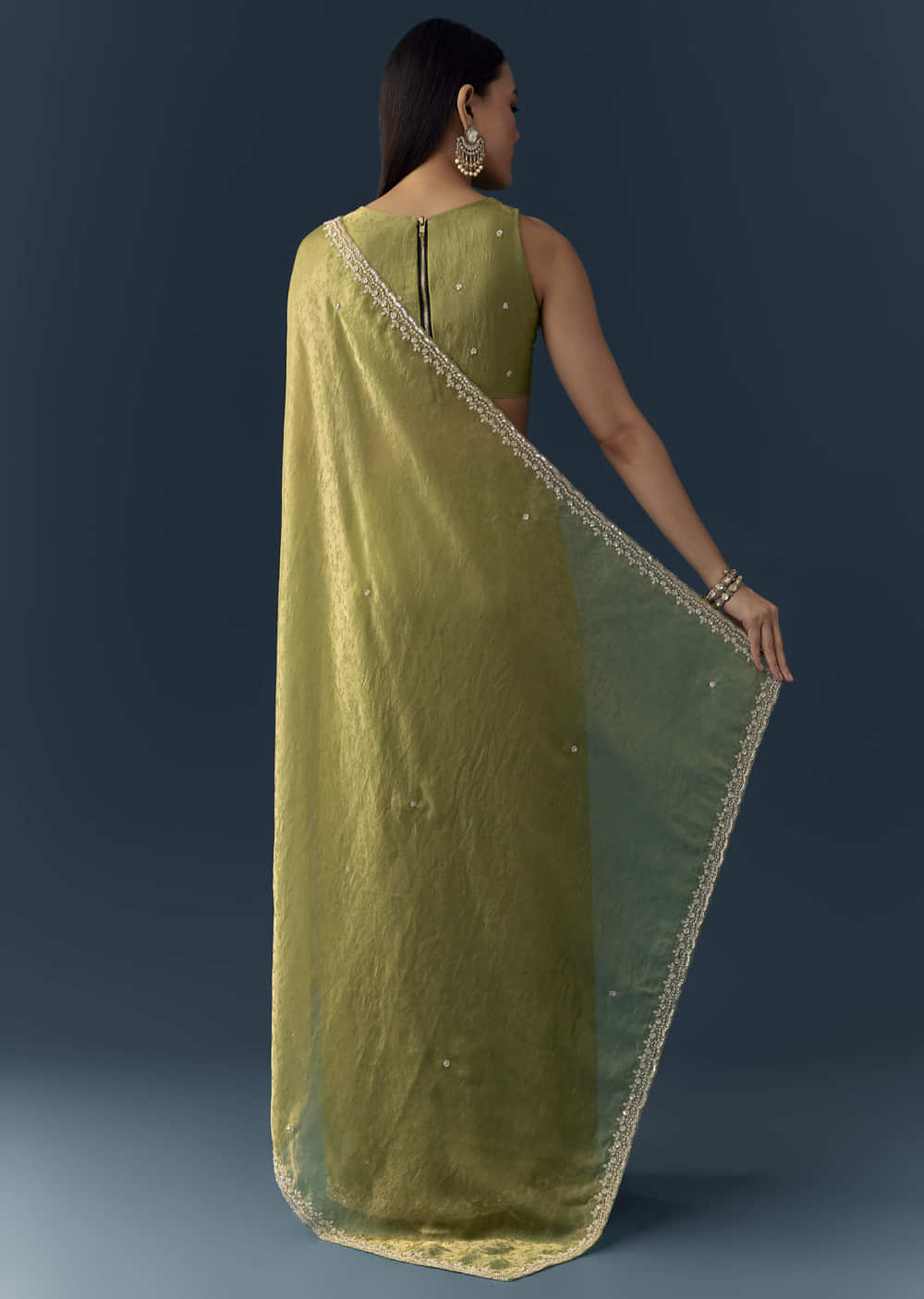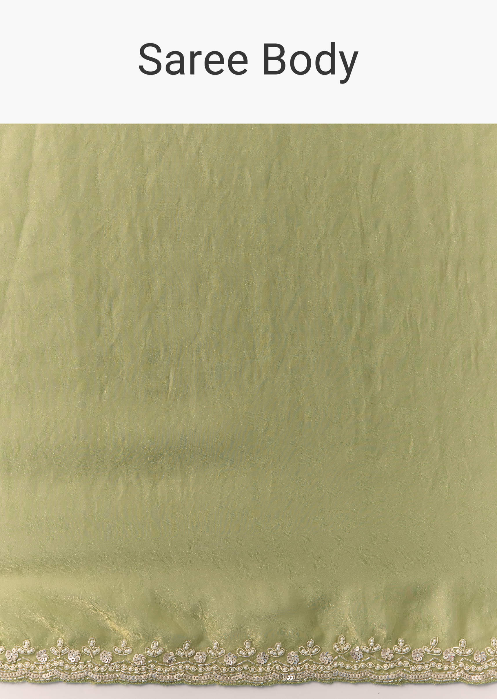 Olive Green Jacquard Printed Tissue Saree with Unstitched Blouse