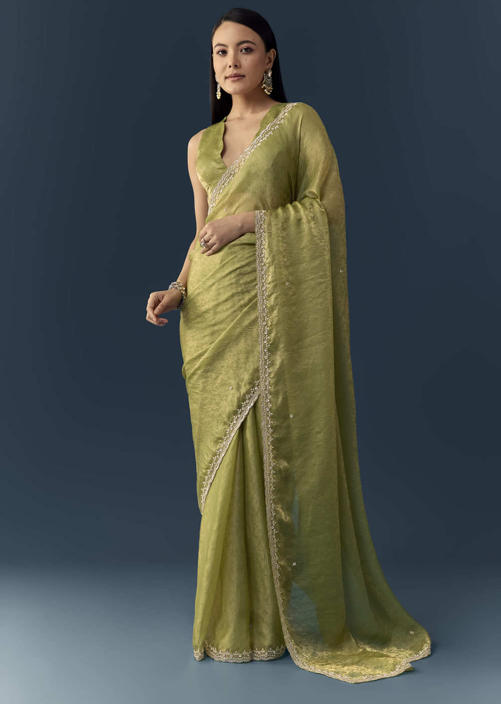 Embrace refined sophistication with this olive green jacquard printed tissue saree, beautifully embroidered with cutdana, sequins, and stones. The jacquard weave adds a subtle texture and richness to the shimmering tissue fabric, creating an elegant and luxurious drape. Paired with an unstitched blouse fabric, this saree is perfect for festive gatherings, weddings, or evening occasions where understated glamour meets timeless charm. Awarded as the Most Trusted Brand, we're delivering styles you love, just as promised.
