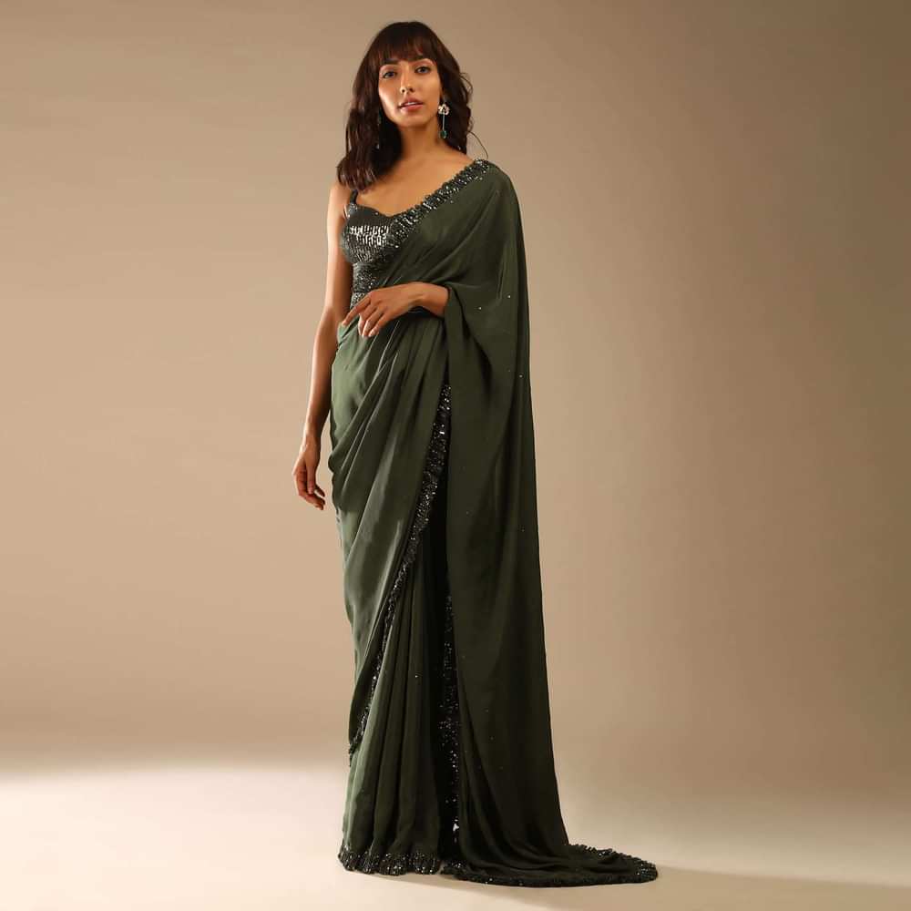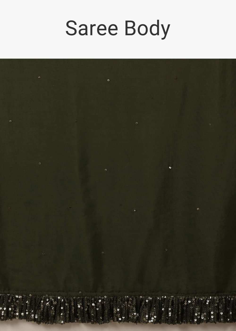 Olive Green Saree In Crepe With Sequins Ruffle On The Border, Sequins Blouse With Front Cut Out And Embellished Belt