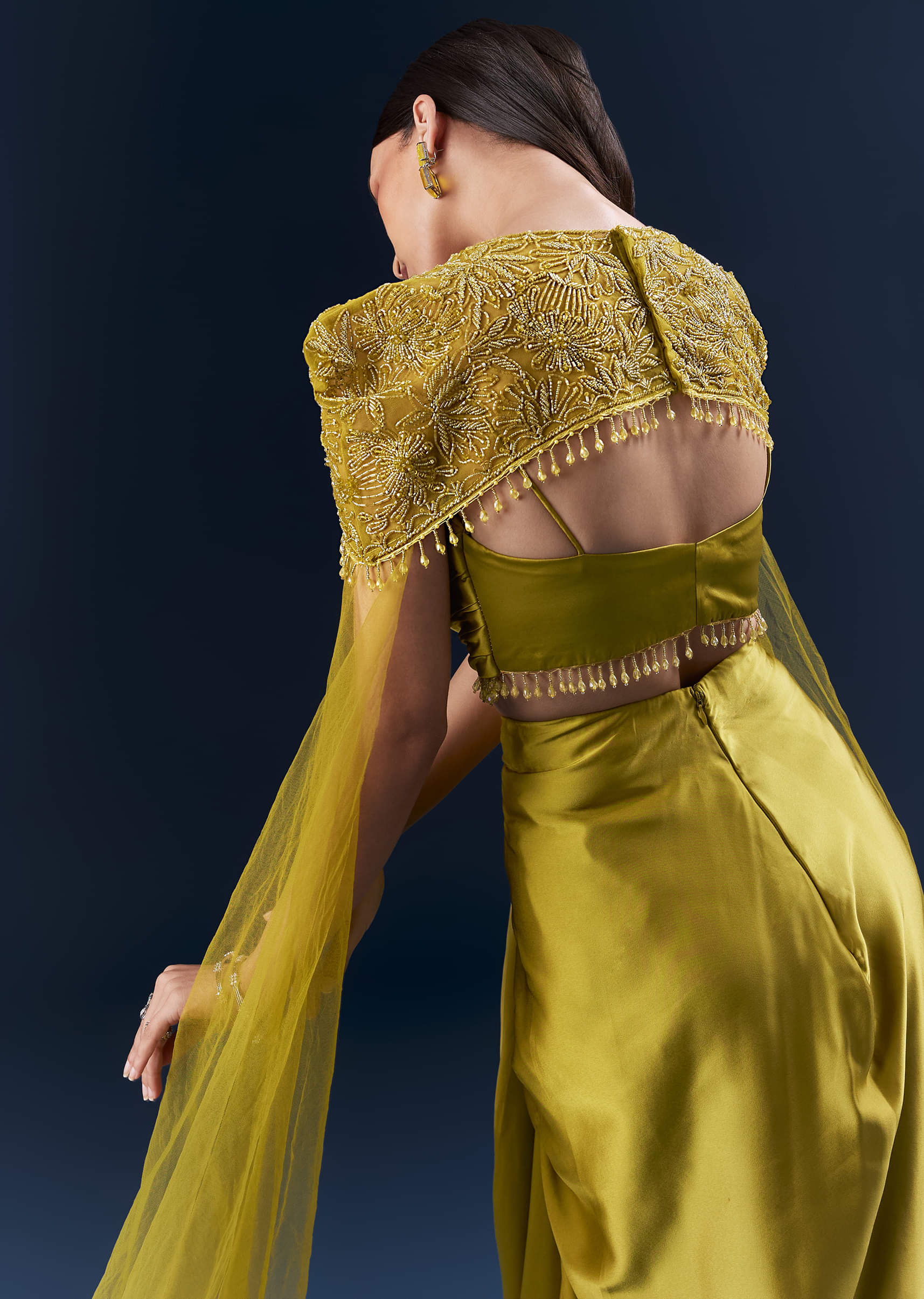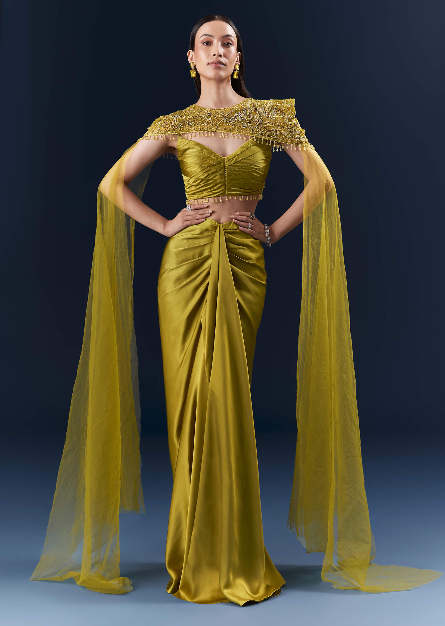 For colour that reads editorial, this olive green satin crop top and drape skirt set pairs a sculpted wrap skirt with a precisely embroidered blouse and a minimalist cape. Cutdana... More Product Details