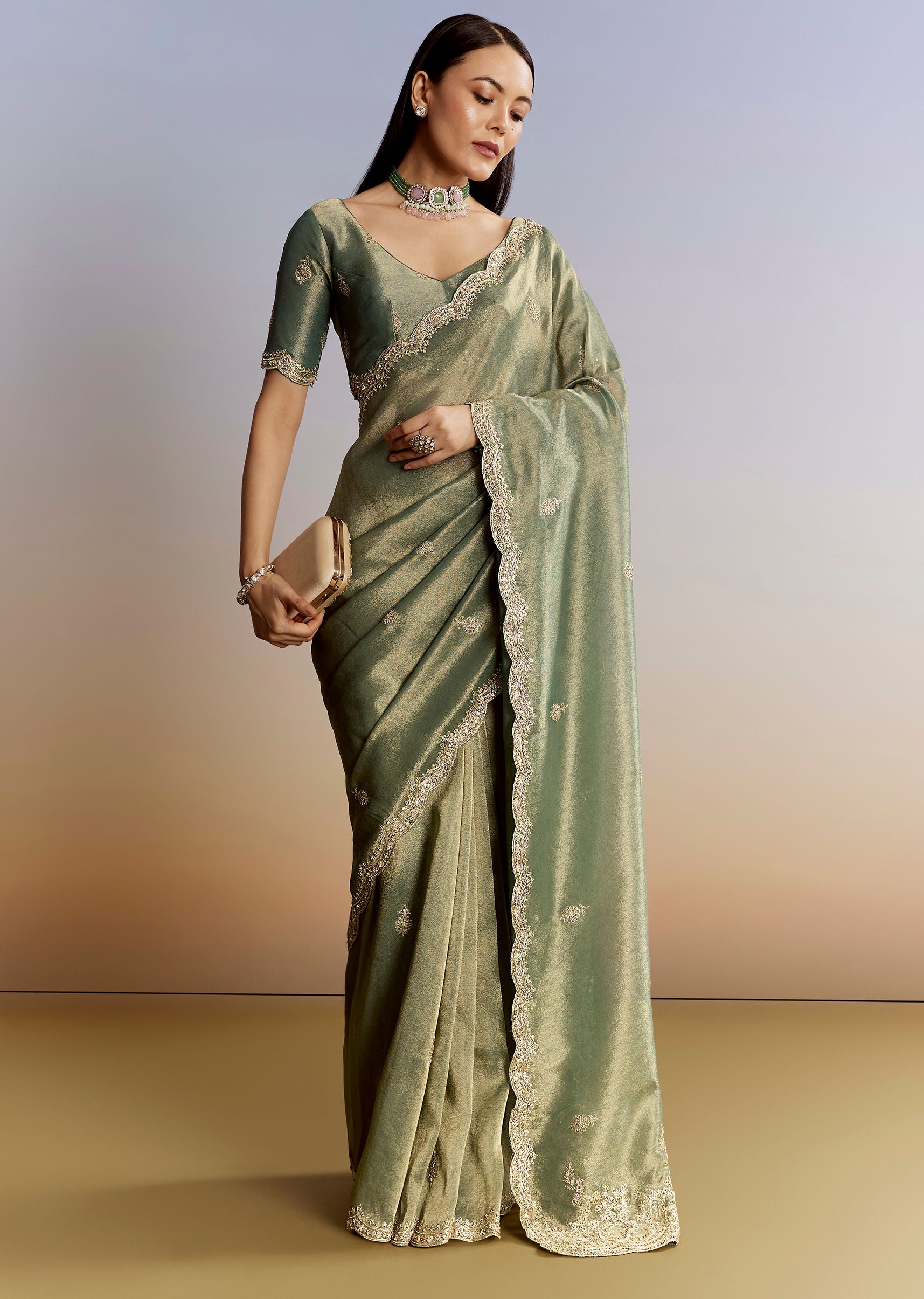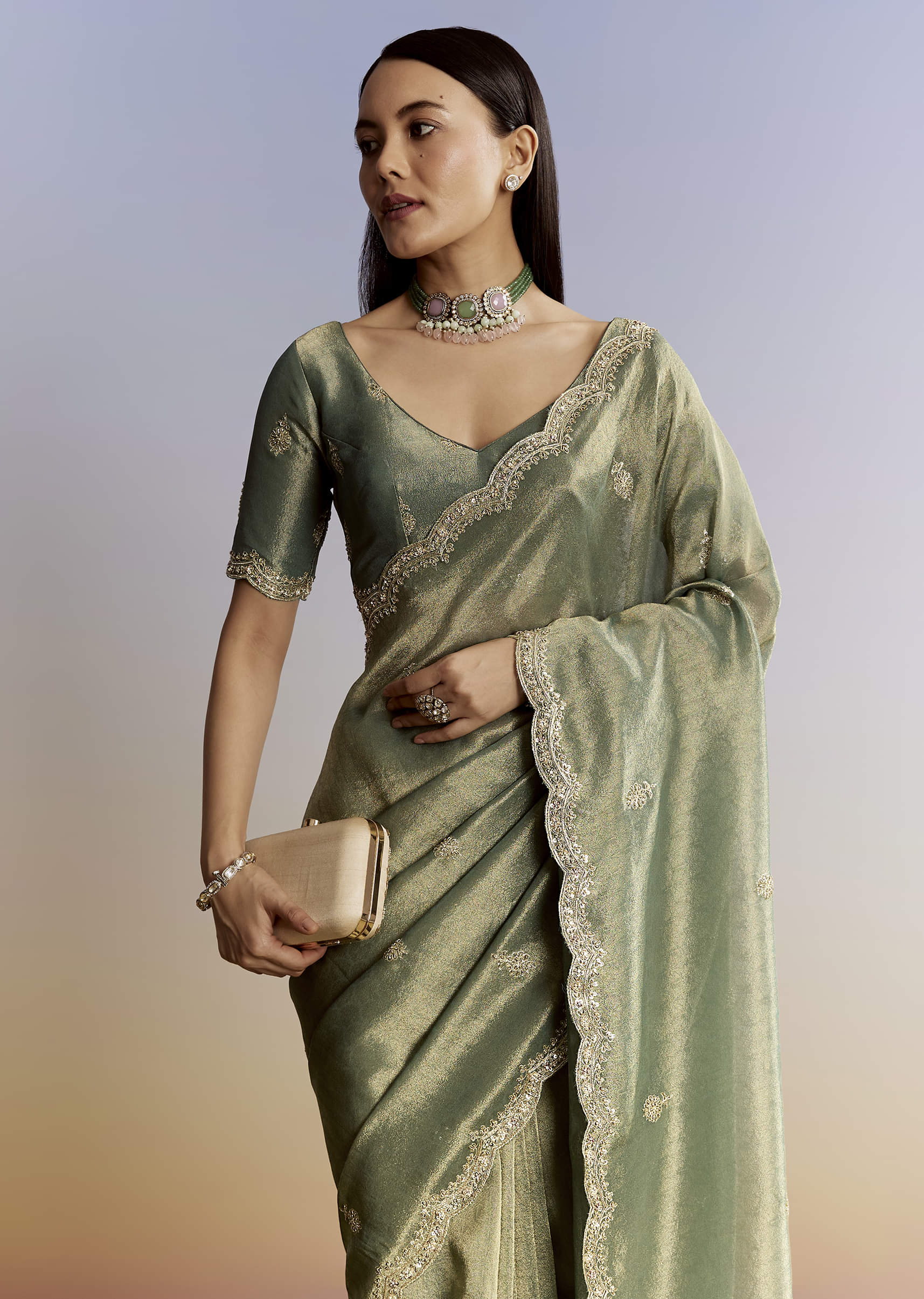 This olive green tissue saree is a forest of luxury, with zardosi, sequins, and beads entwining along scalloped borders and a coordinating blouse — rich and earthy in every fold.... More Product Details