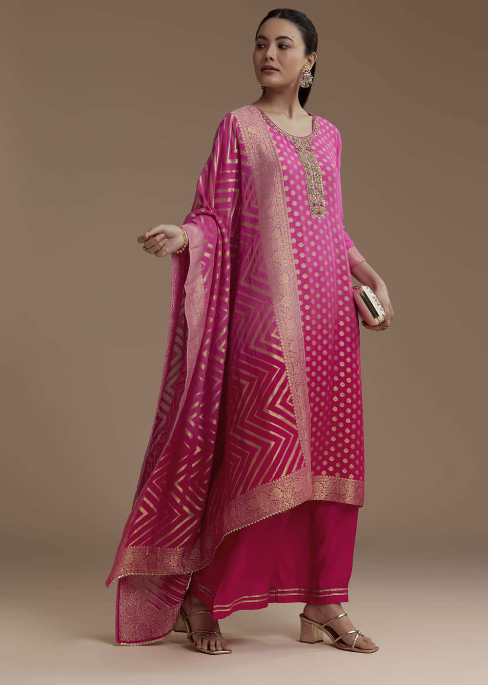 Bold colours meet ombre hues in this vibrant georgette kurta set. The subtle transitioning effect ensures you radiate elegance and charm this festive season. Great for evening aartis or festive... More Product Details