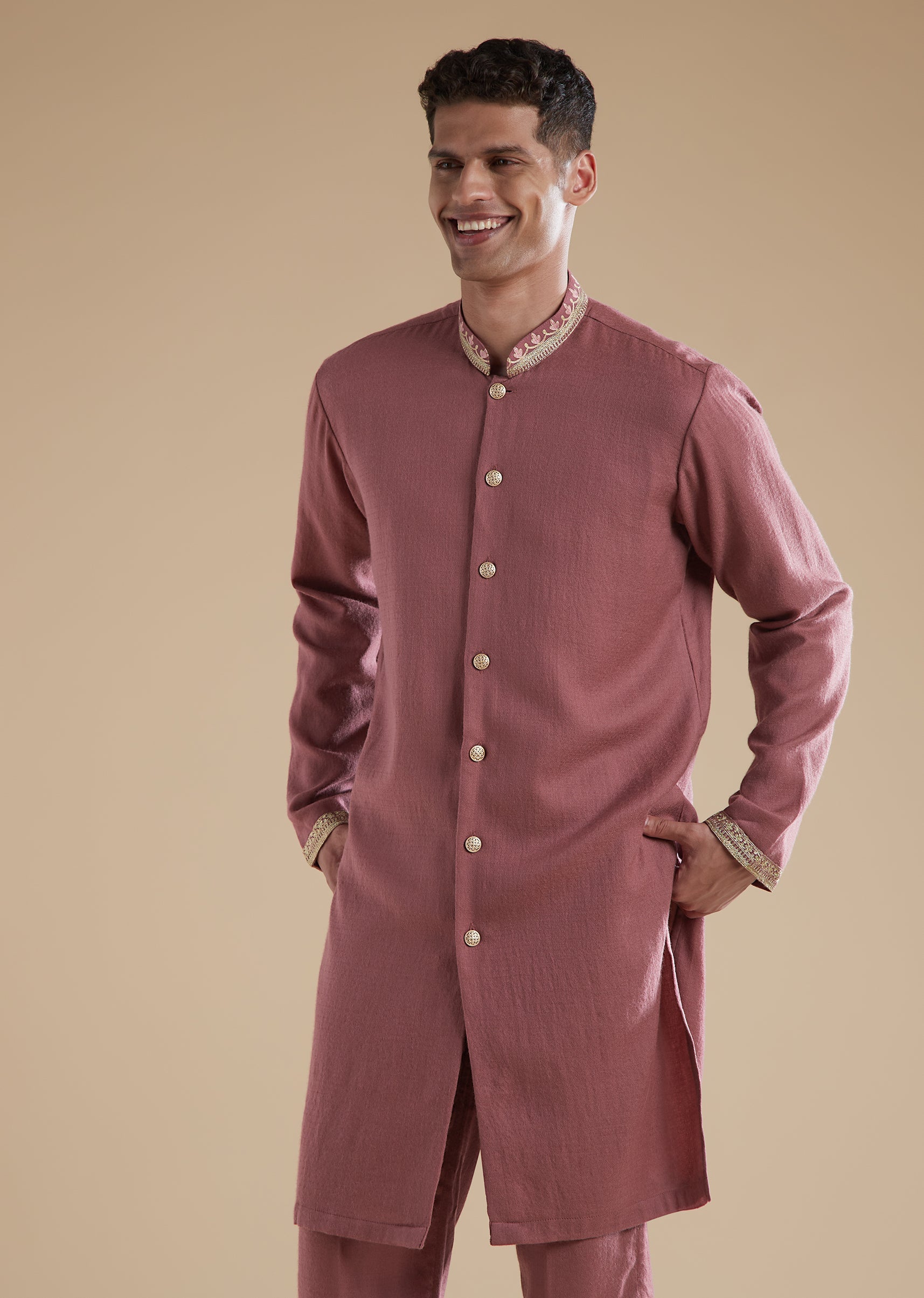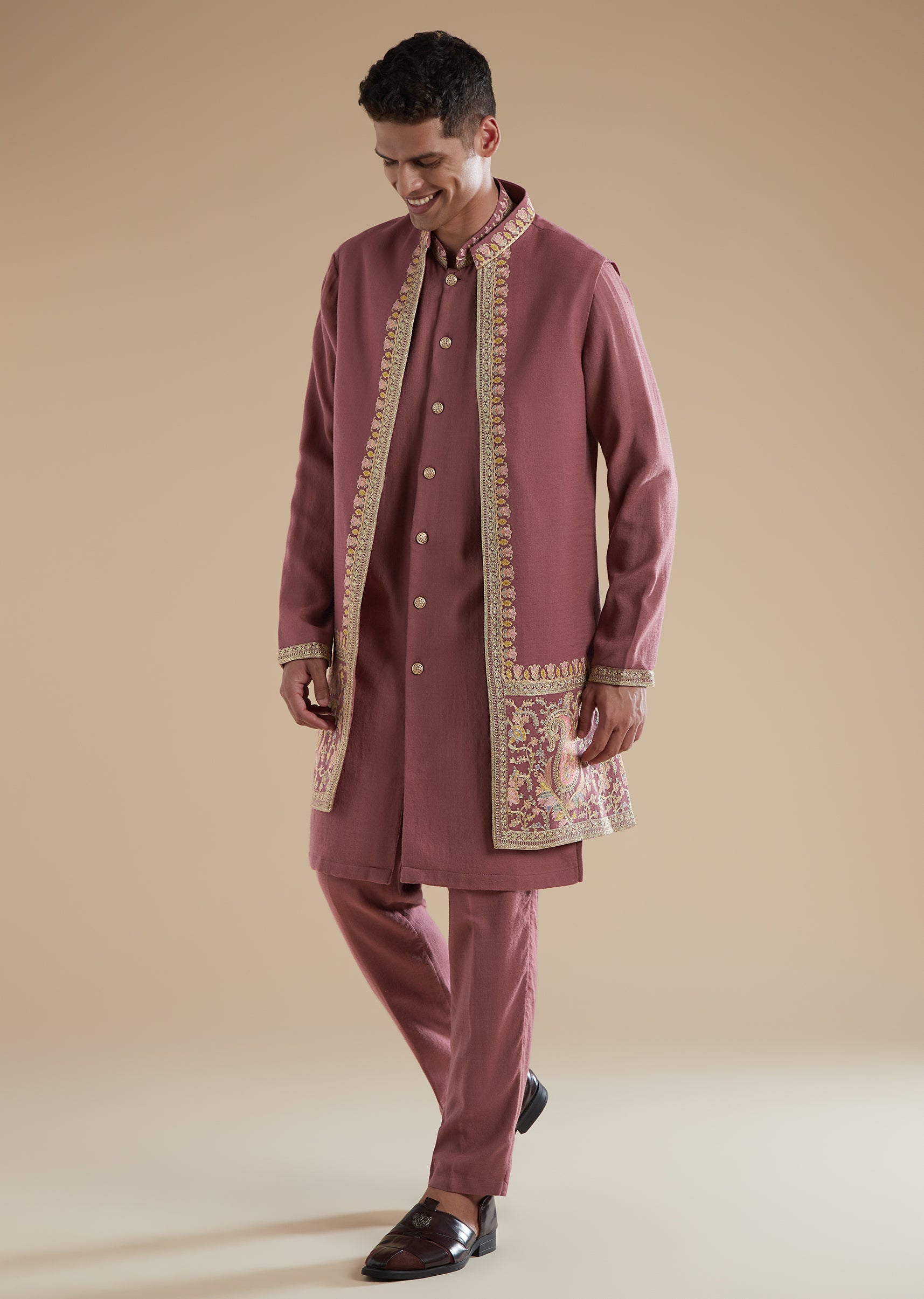 Elegant and refined, this onion pink kurta jacket set is crafted in soft pashmina fabric with a smooth silk blend for a luxurious pastel finish. Perfect for engagement and reception celebrations, it is an ideal choice for a groom’s father seeking a sophisticated and understated festive look. The ensemble is highlighted with delicate thread and resham detailing that enhances its refined charm. Designed with a mandarin collar, full sleeves, and clean front button closures on both the kurta and the bottoms, it offers a polished and graceful silhouette. The matching jacket adds structure and depth, completing a poised and celebration ready outfit. Awarded as the Most Trusted Brand, we're delivering styles you love, just as promised.