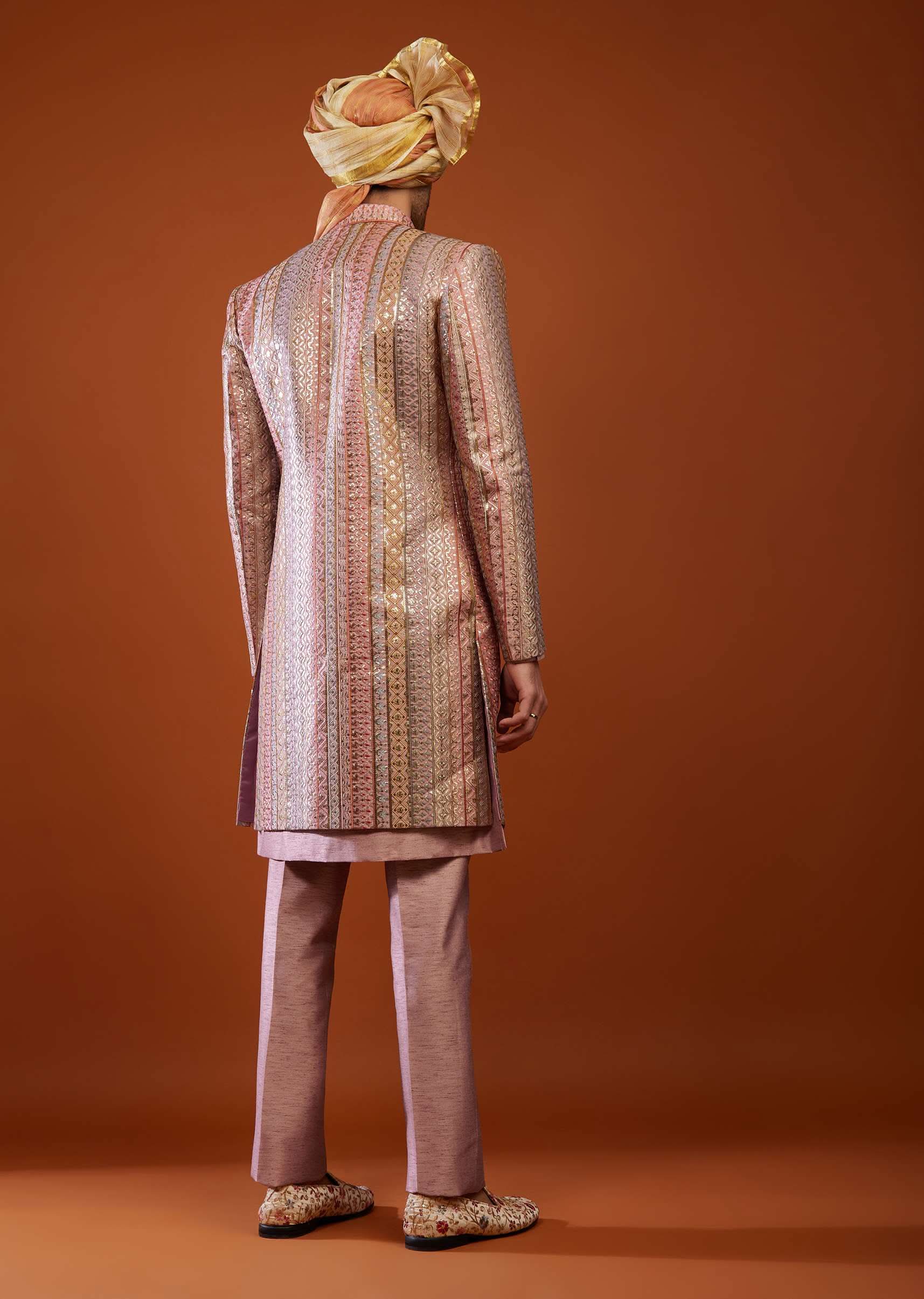 - The sherwani comes in exquisite thread embroidery in a vertical pattern with sequence.
