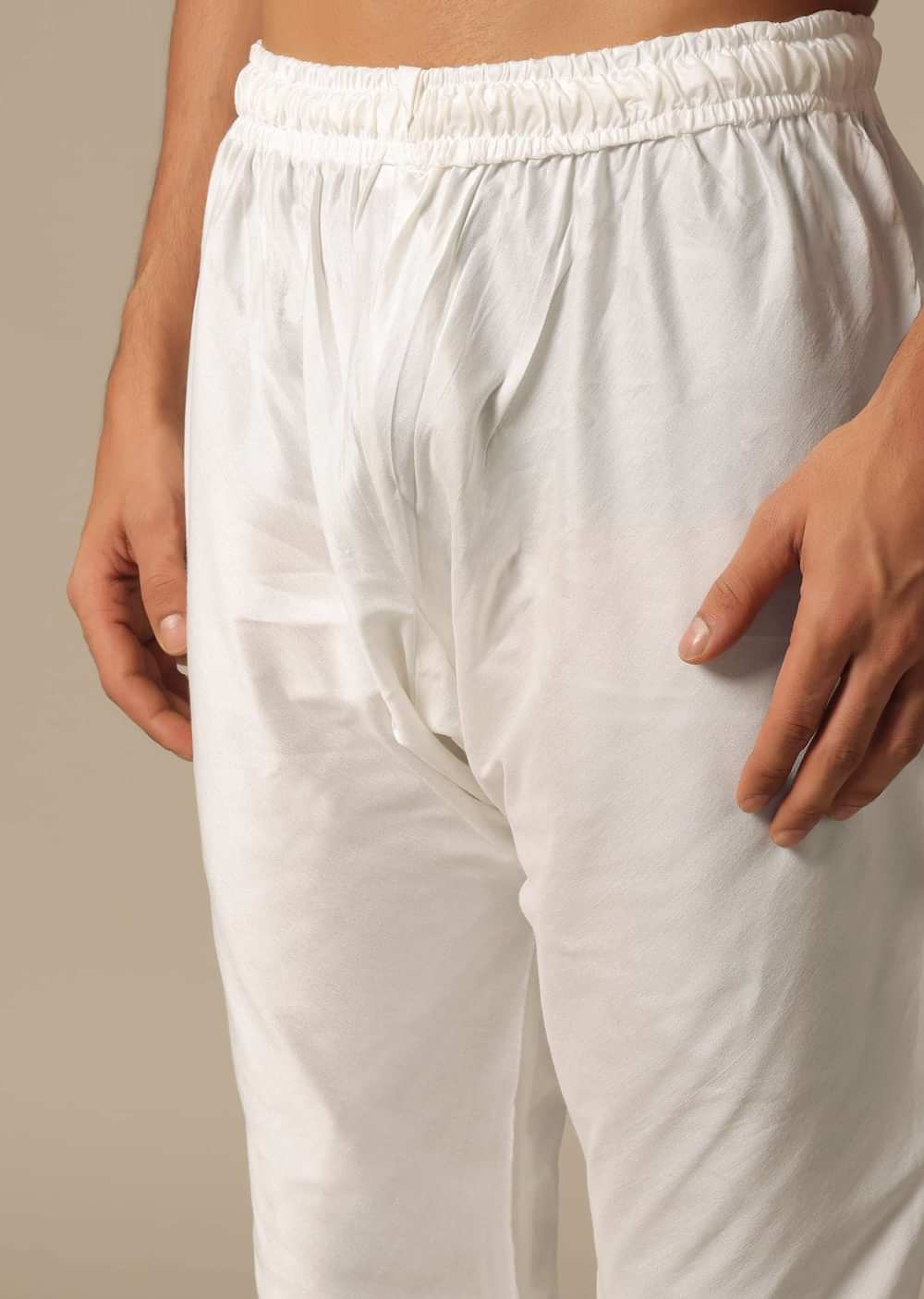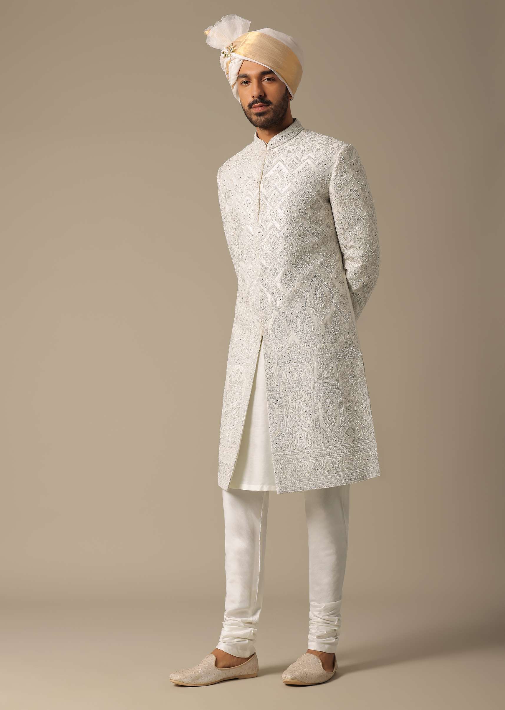 - Step into marital bliss with our Opulent White Silk Sherwani Set.