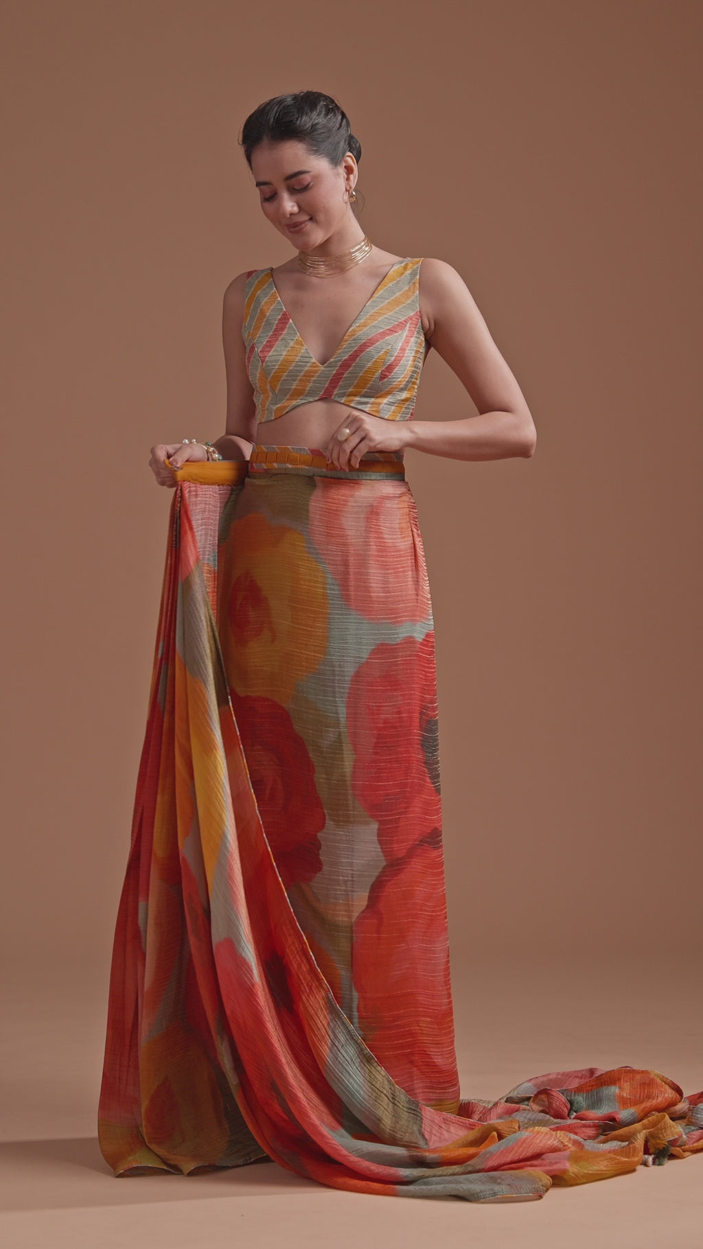 - Explore a world of vibrant elegance with the Orange Abstract Printed Crush Saree, a mesmerizing piece that exudes a sense of effortless luxury.