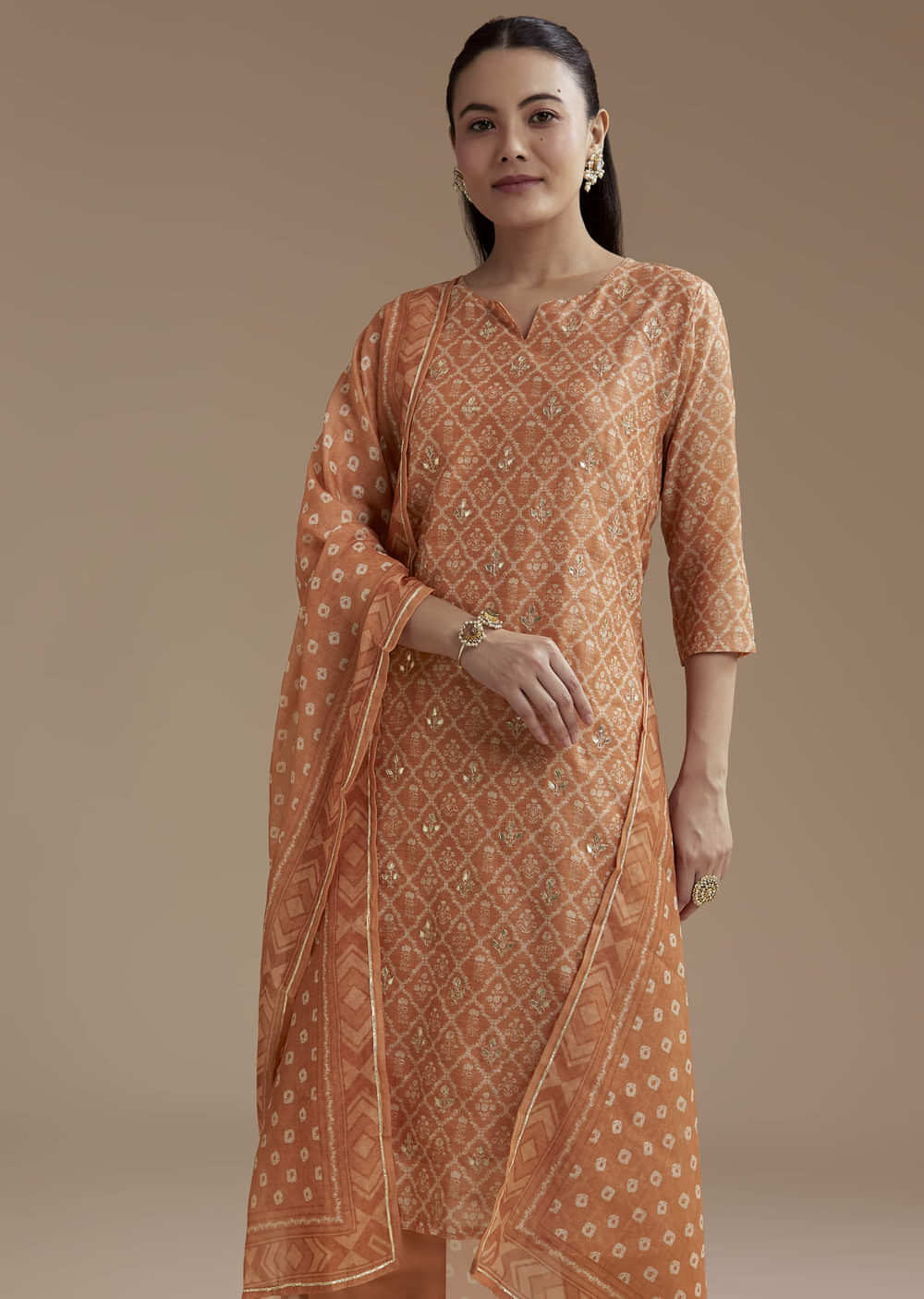 Orange Chanderi Floral Print Kurta Set with Gotta Work