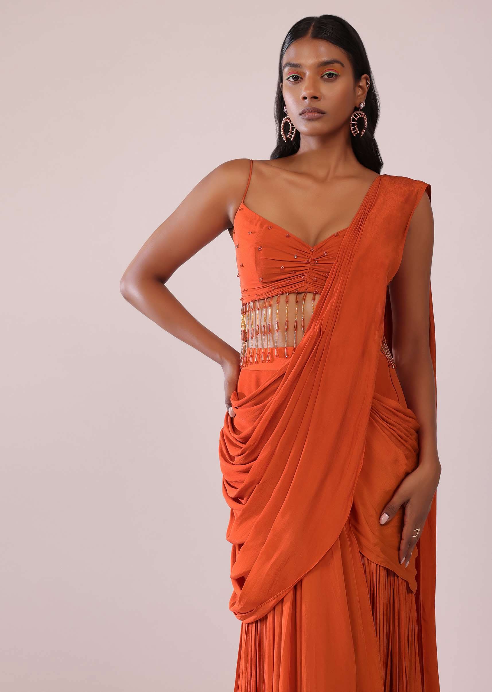 Orange Crepe Drape Saree And Blouse With Crystal Tassels All Over