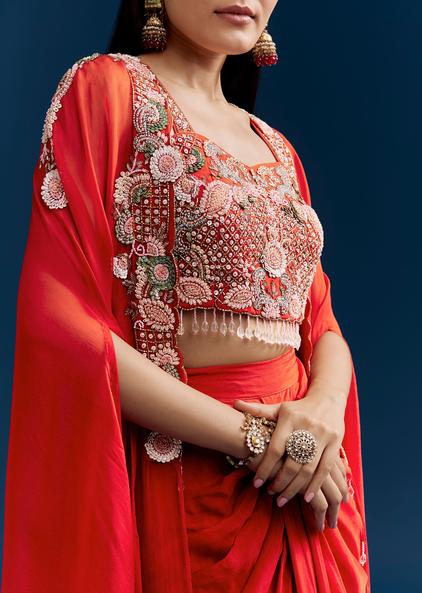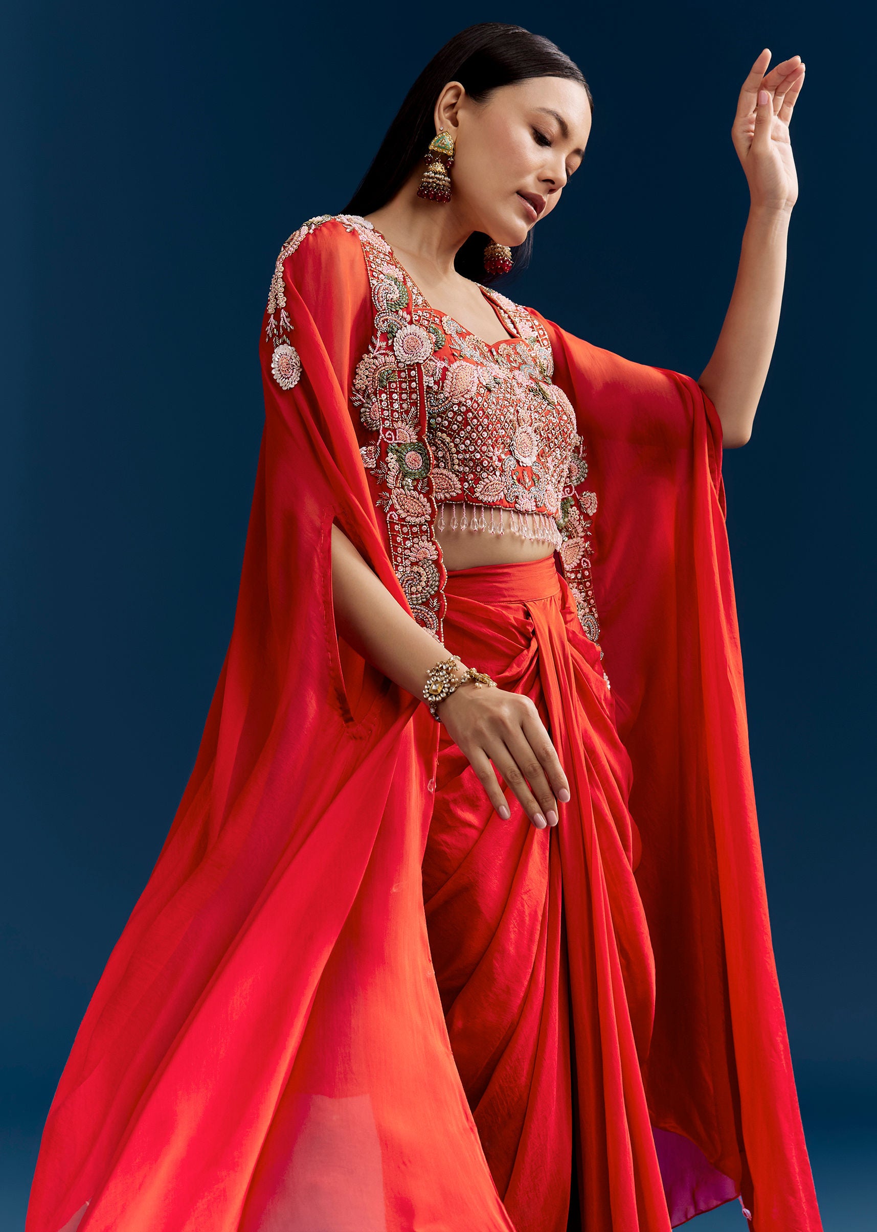 Crafted in soft organza, this rust orange crop top and skirt set is paired with an embroidered cape to bring movement and detailing to the look. The sweetheart neckline adds... More Product Details