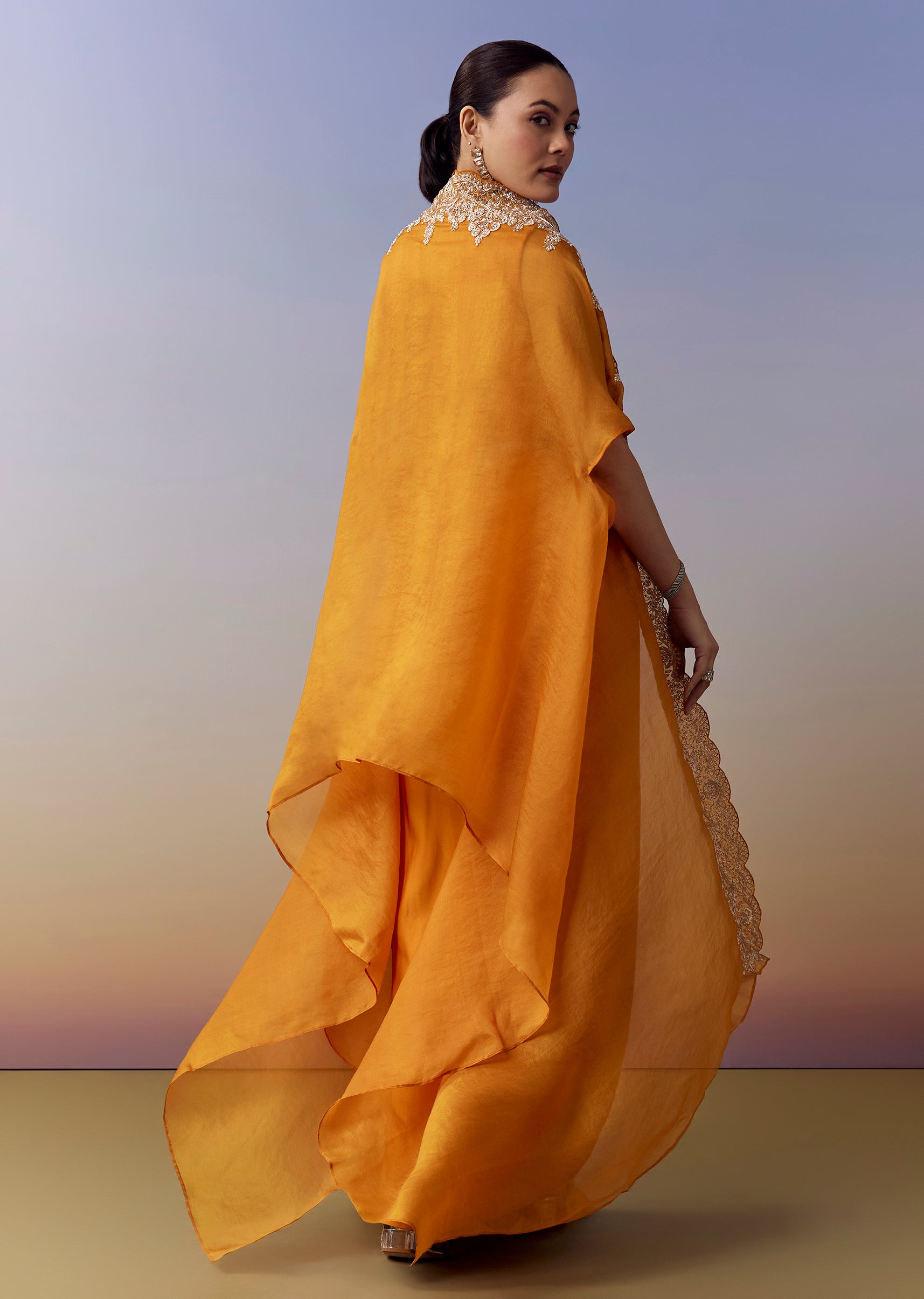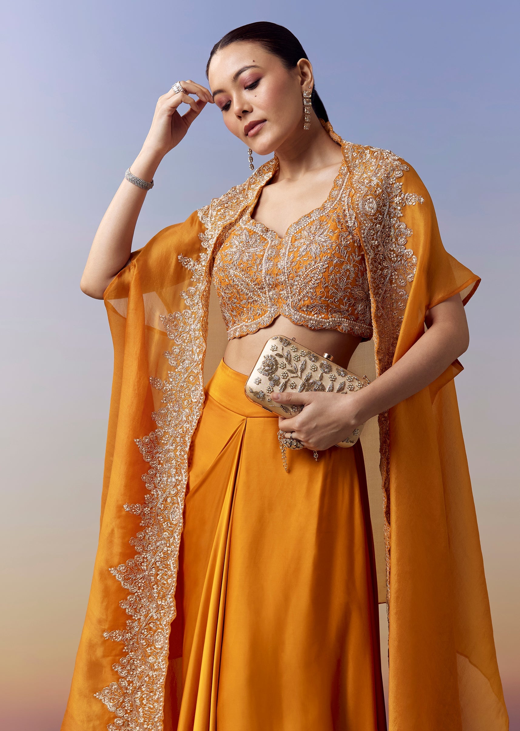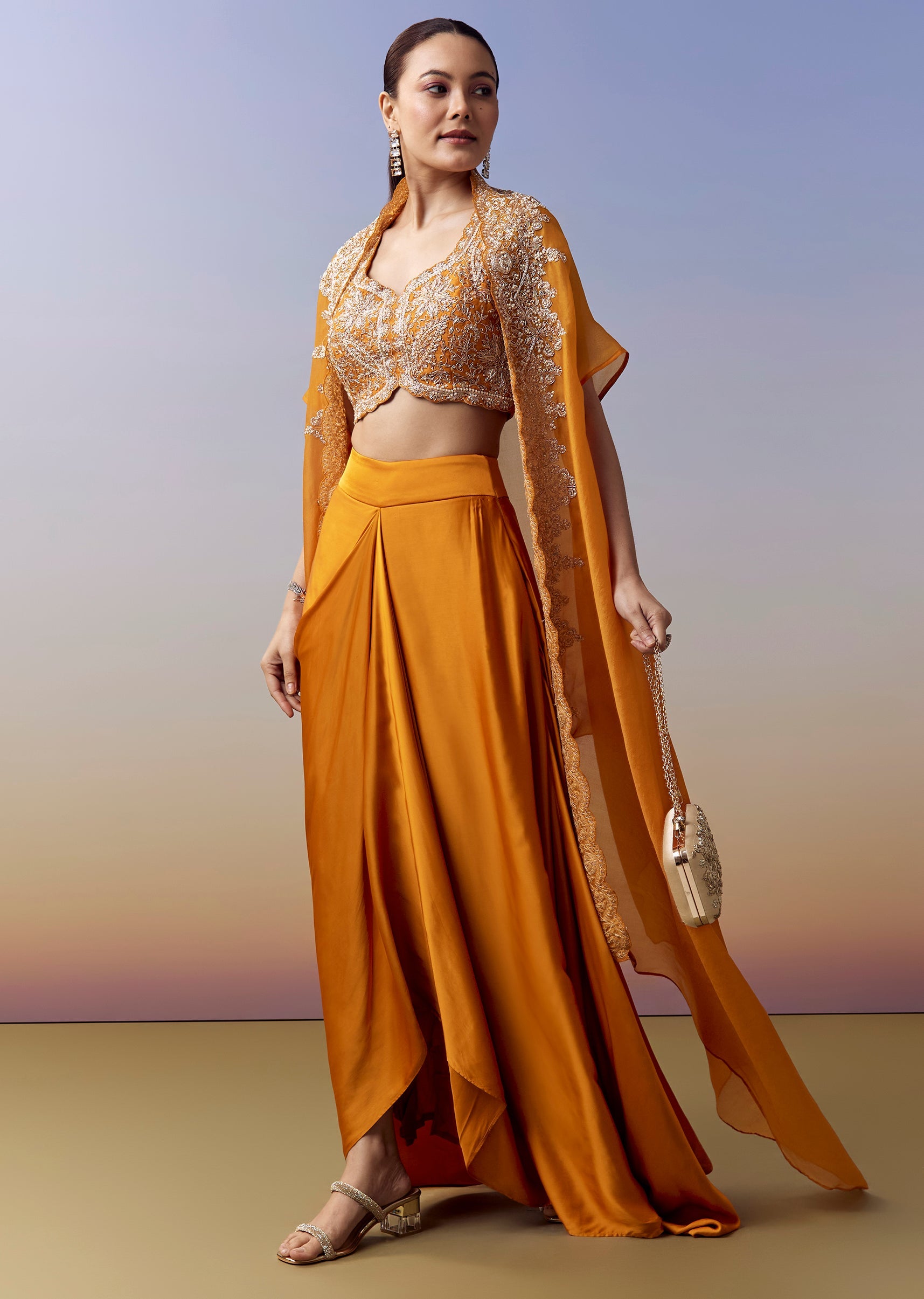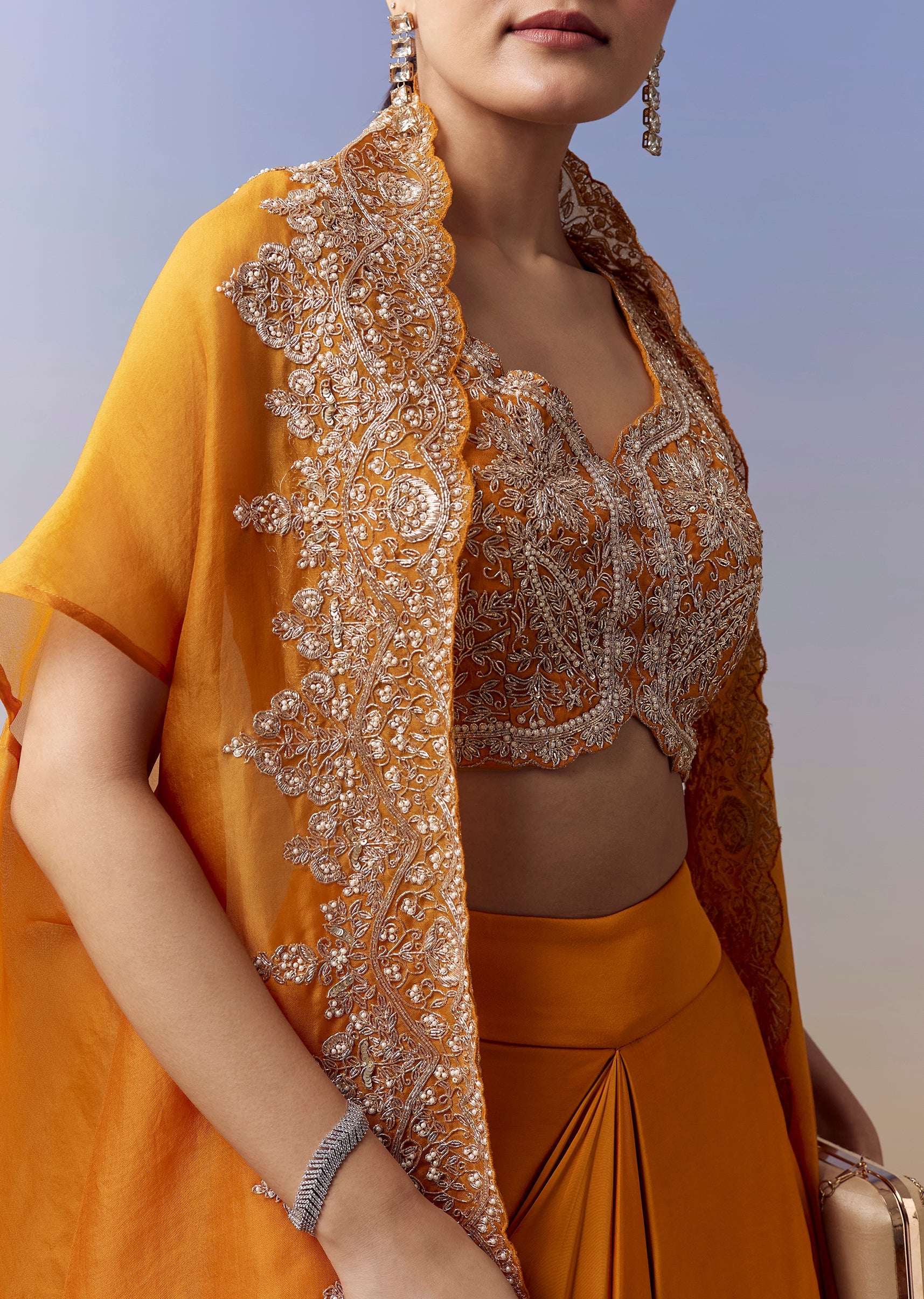 Orange Indo Western Crop Top Skirt Set With Zardosi Work And Organza Cape
