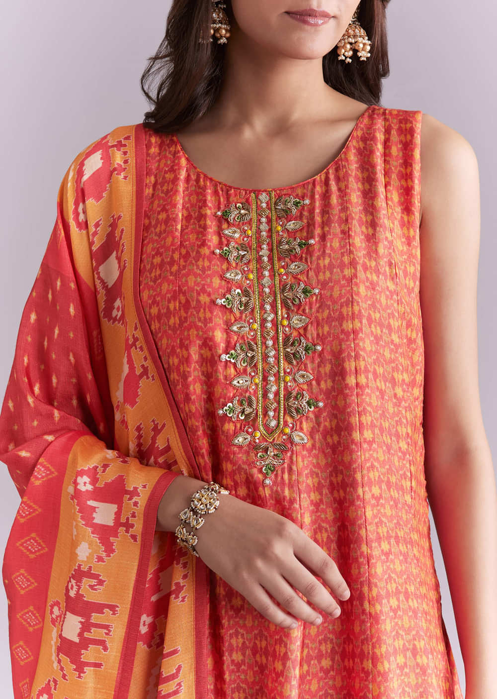 For festive mornings that move into temple visits, this orange muslin anarkali suit keeps colour upbeat and the look effortless. Indie print adds character to the flare while the soft... More Product Details