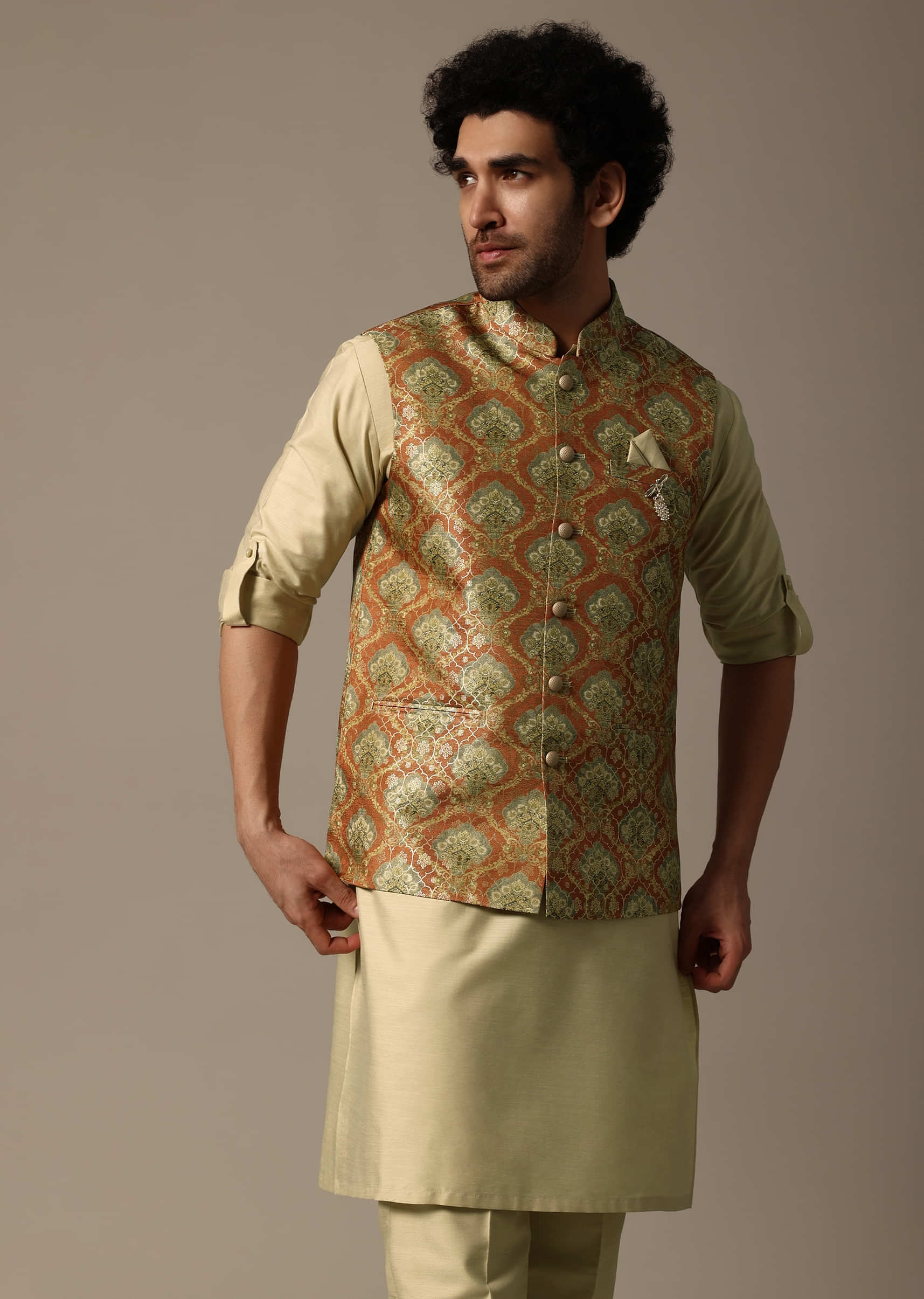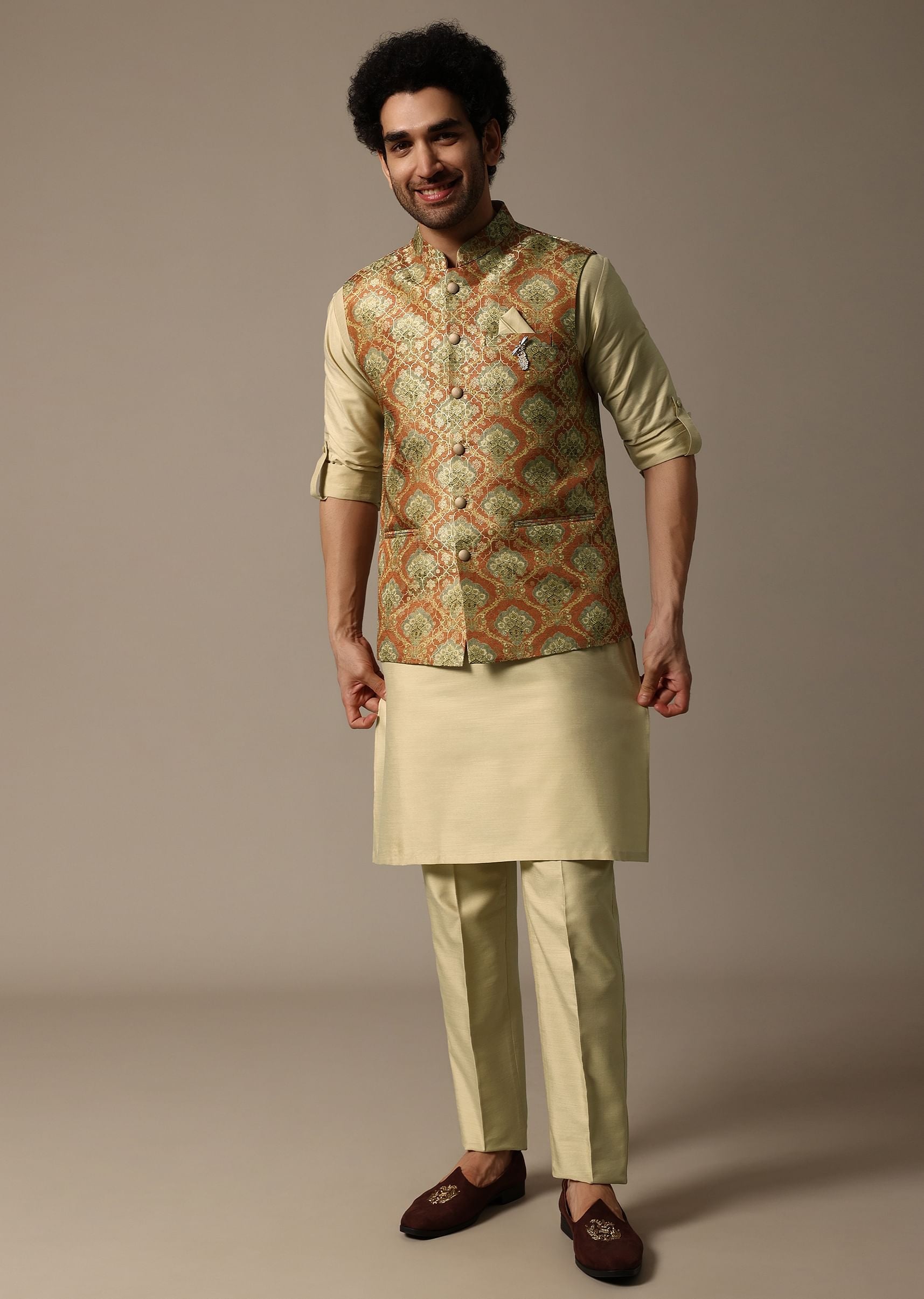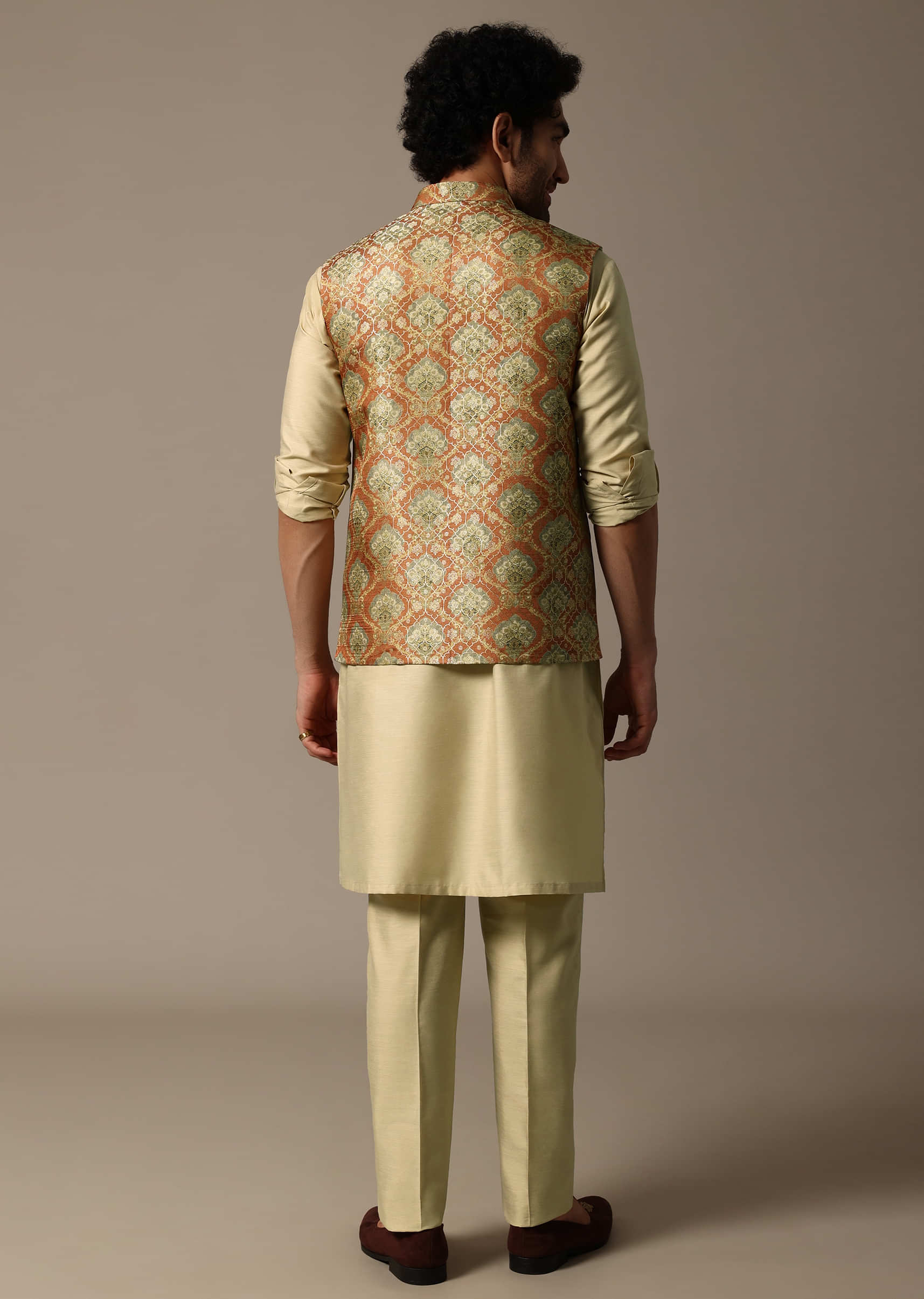 - Celebrate in style with our meticulously crafted orange kurta jacket set designed for festive opulence.