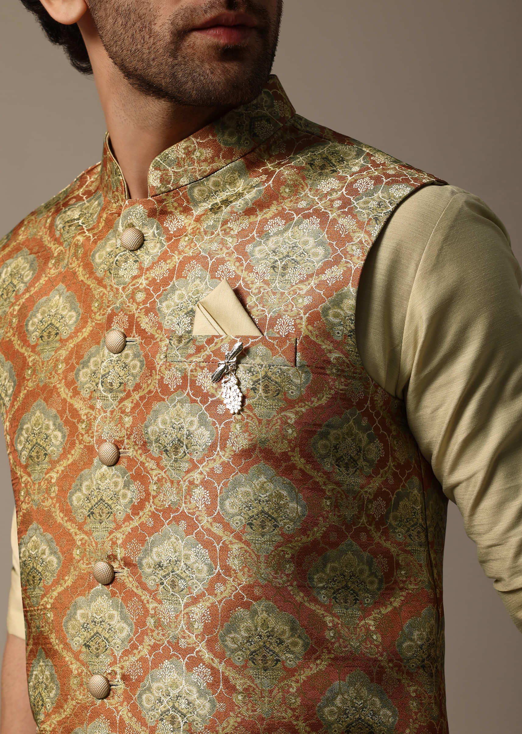 Orange Printed Jacquard Kurta Jacket Set For Men