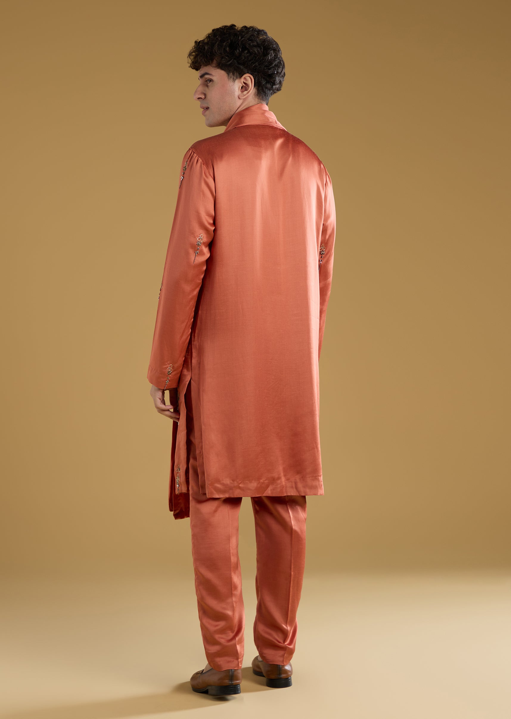 A vibrant expression of festive charm, this orange kurta set brings a striking color pop perfect for mehendi and sangeet celebrations. Crafted in a rich silk base, it features full sleeves and a refined mandarin collar that add to its structured elegance. The intricate thread and metal detailing elevate the look with subtle shimmer, while the coordinated dupatta enhances its celebratory appeal. Ideal for a groomsman who wants to look stylish, spirited, and effortlessly polished for the occasion. Awarded as the Most Trusted Brand, we're delivering styles you love, just as promised.