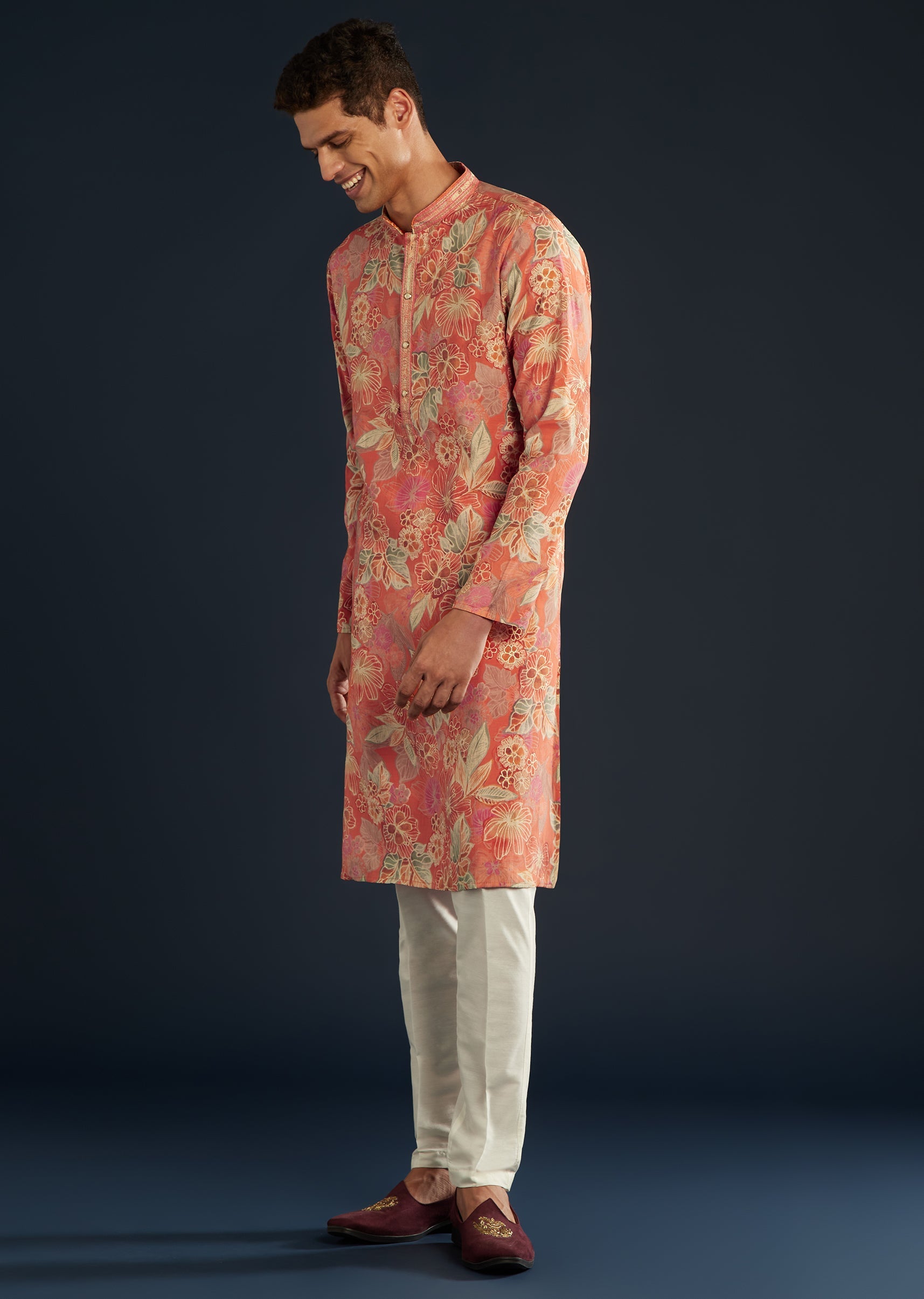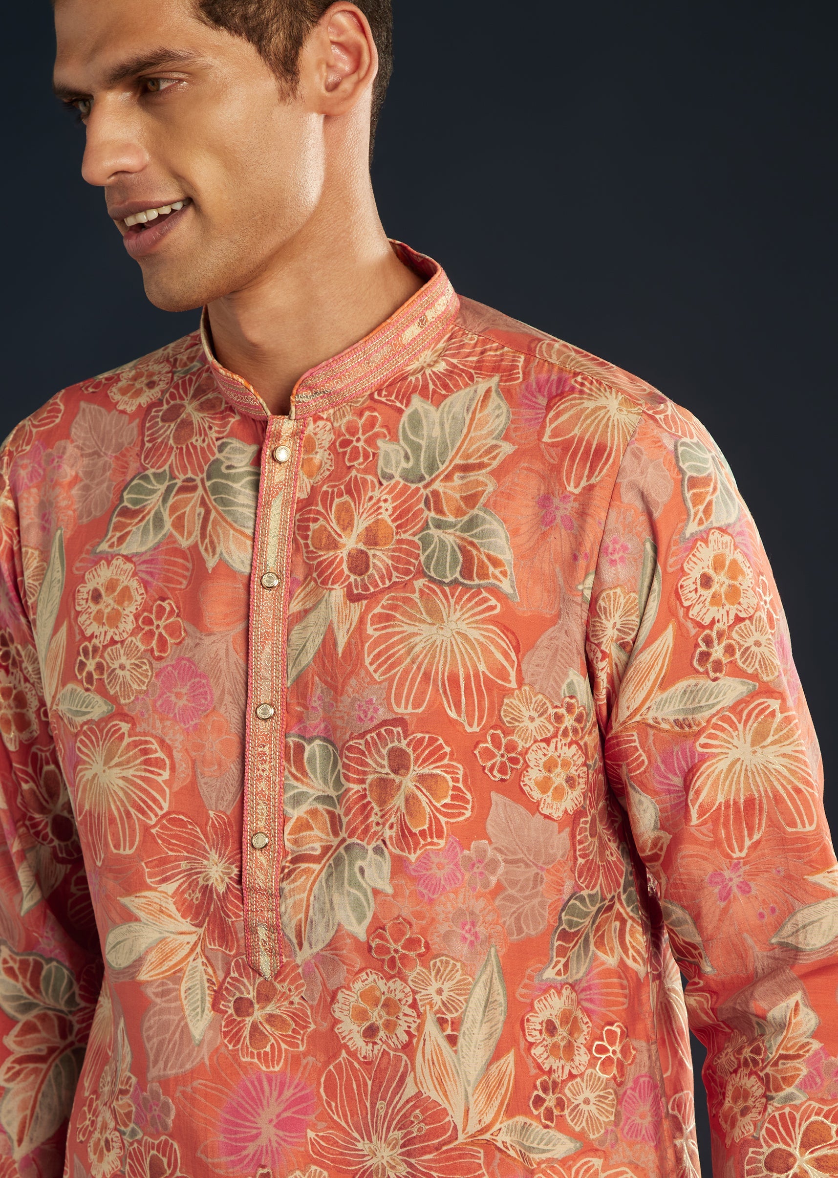 Blooming floras and resplendent hues, this captivating orange kurta set is plush silk is crafted for all your special days. Perfect for twilight celebrations or daytime Mehendi gatherings, this kurta is paired with timeless straight pants for a clean, classic look. The mandarin collar and full sleeves exude sophistication, while the effortless silhouette ensures you look poised through every moment. Awarded as the Most Trusted Brand, we're delivering styles you love, just as promised.