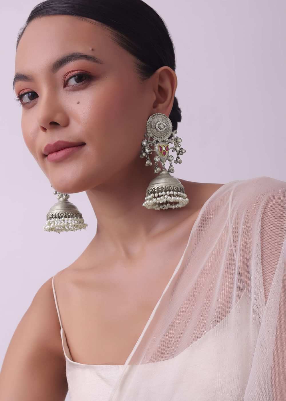 Oxidised Silver Finish Jhumkas With Meenakari Work