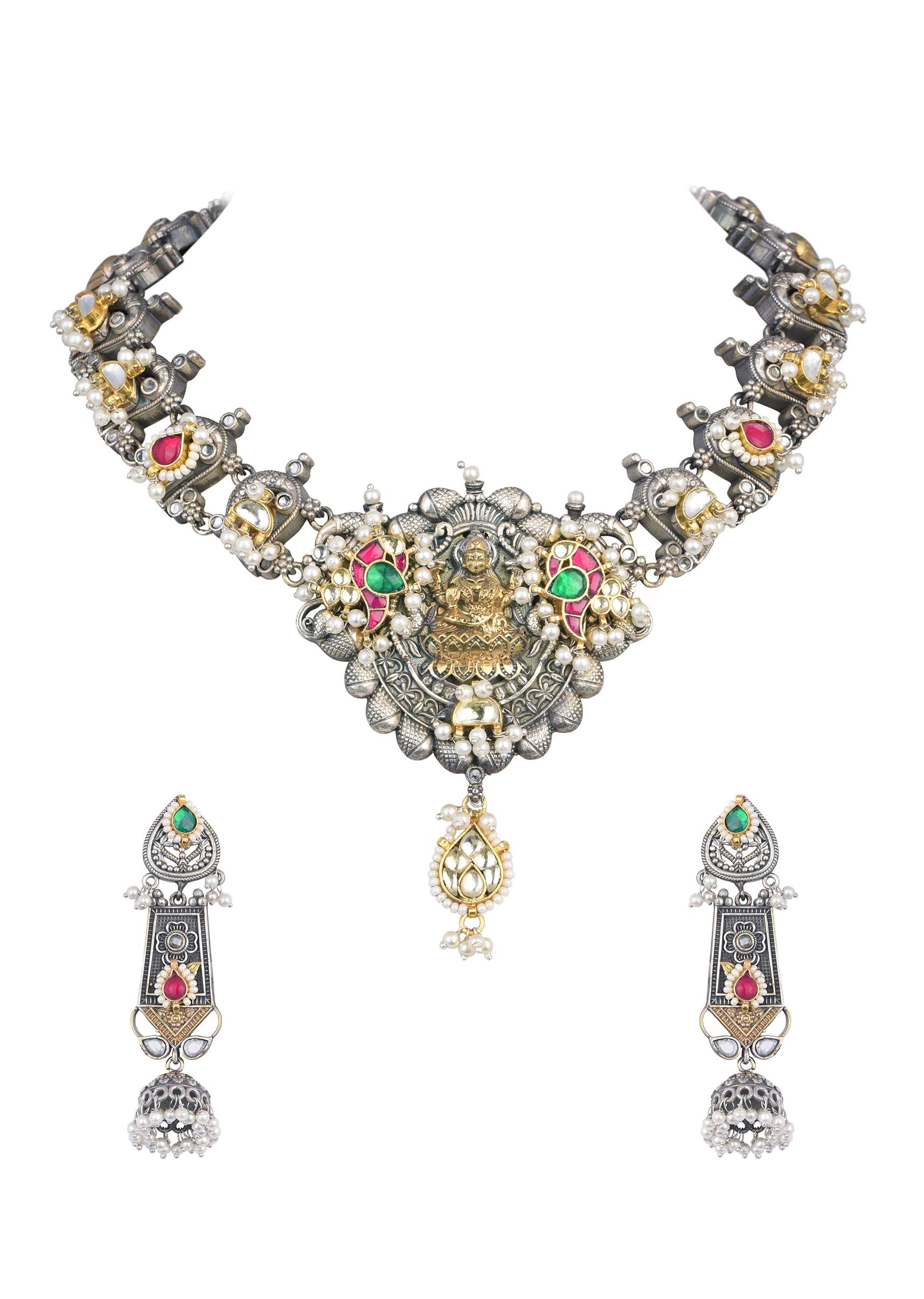 - Adorned on a mixed metal, oxidized base, the necklace is highlighted with exquisite Meenakari work.
