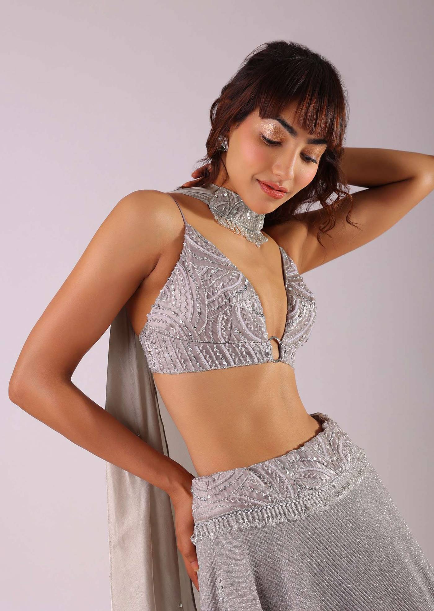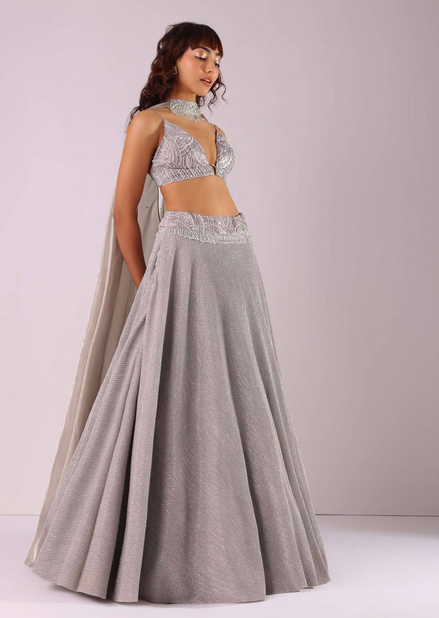 Oyster Grey Embroidered Lehenga Set In Knit With Choker Dupatta