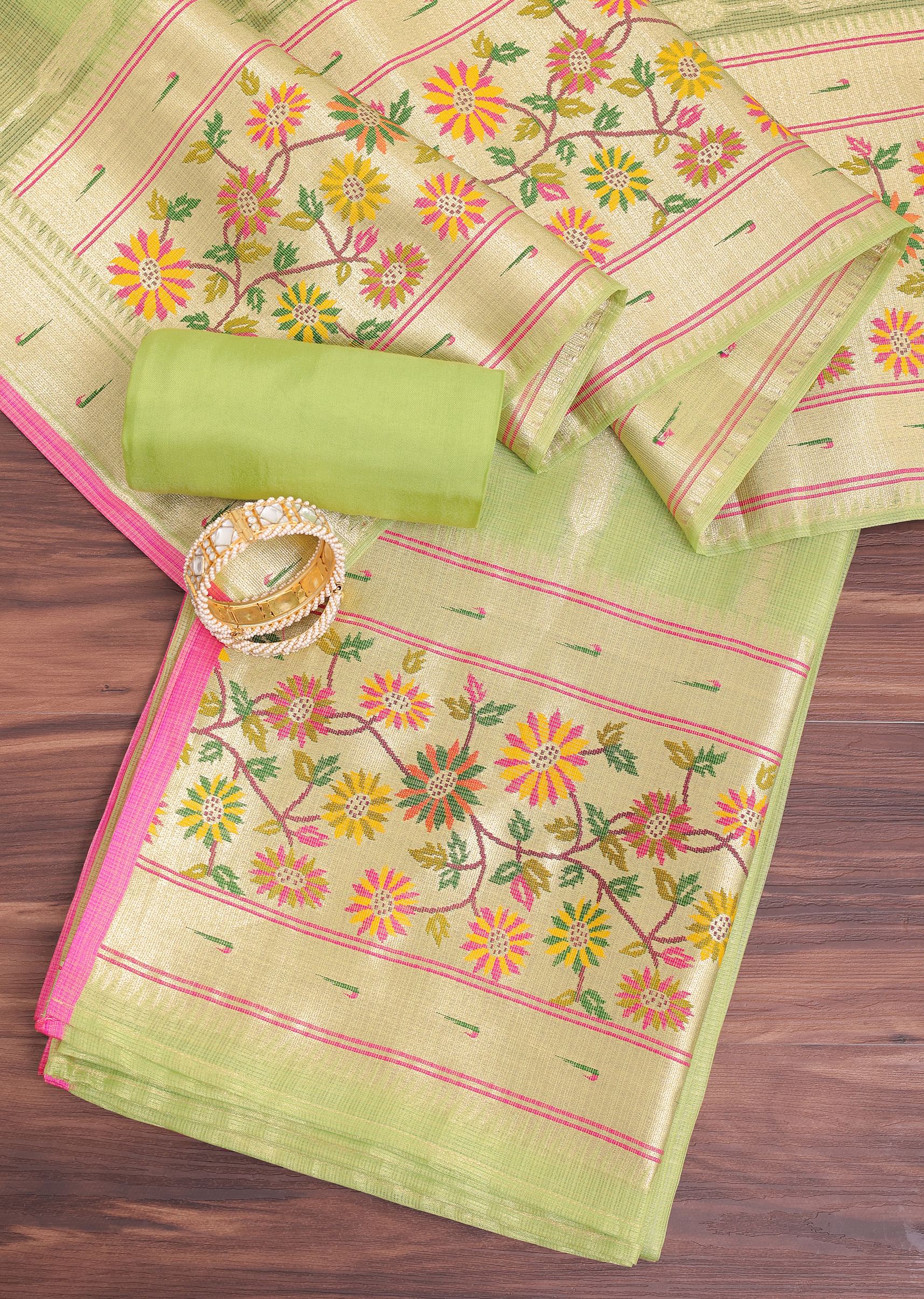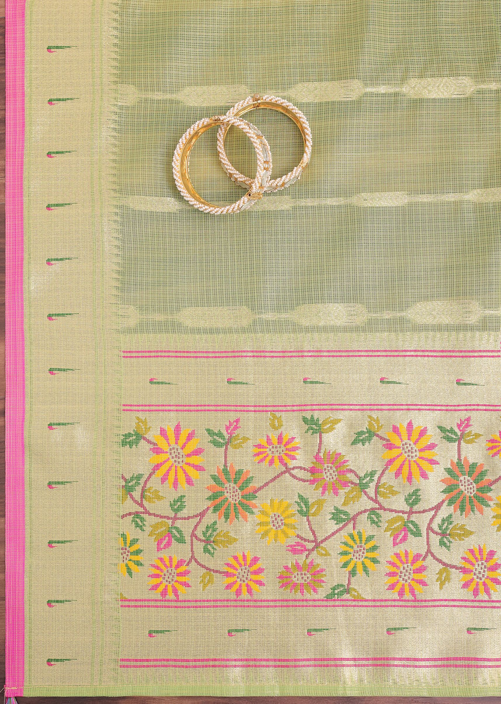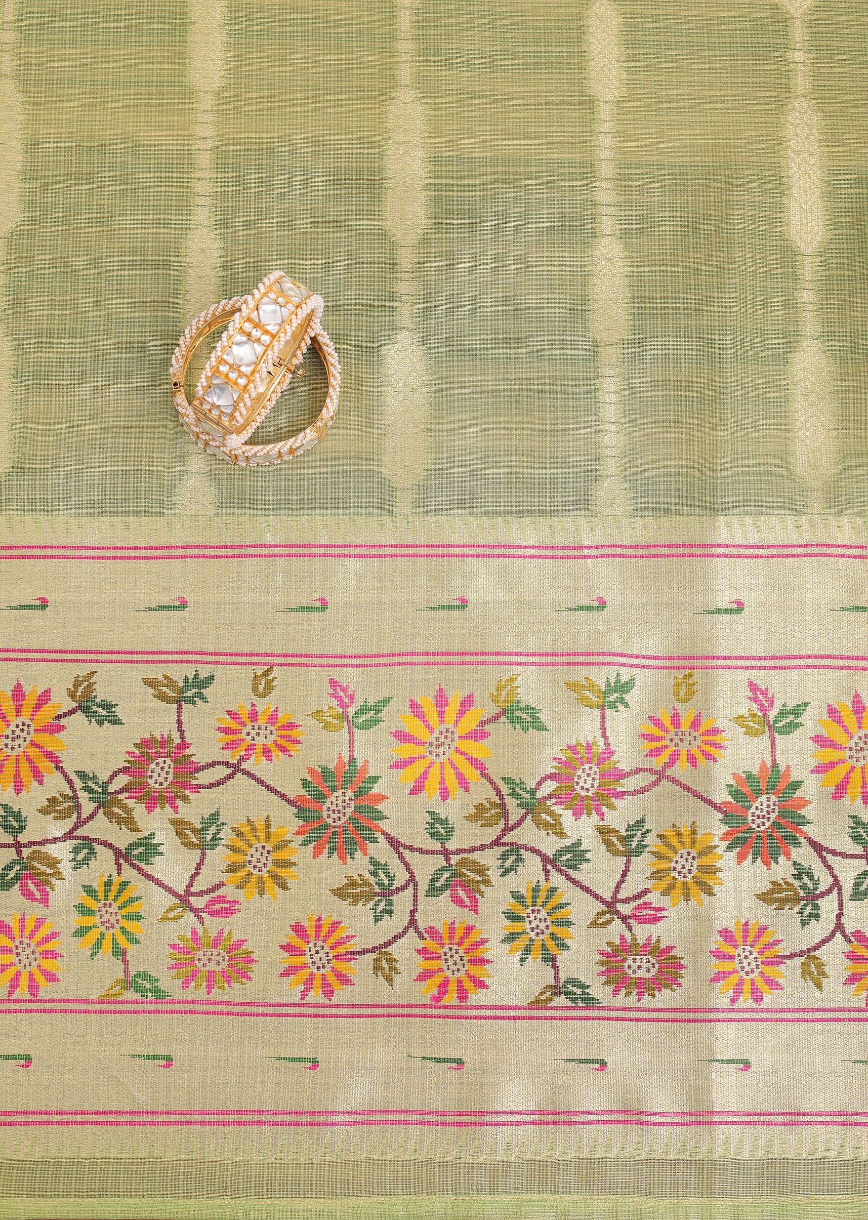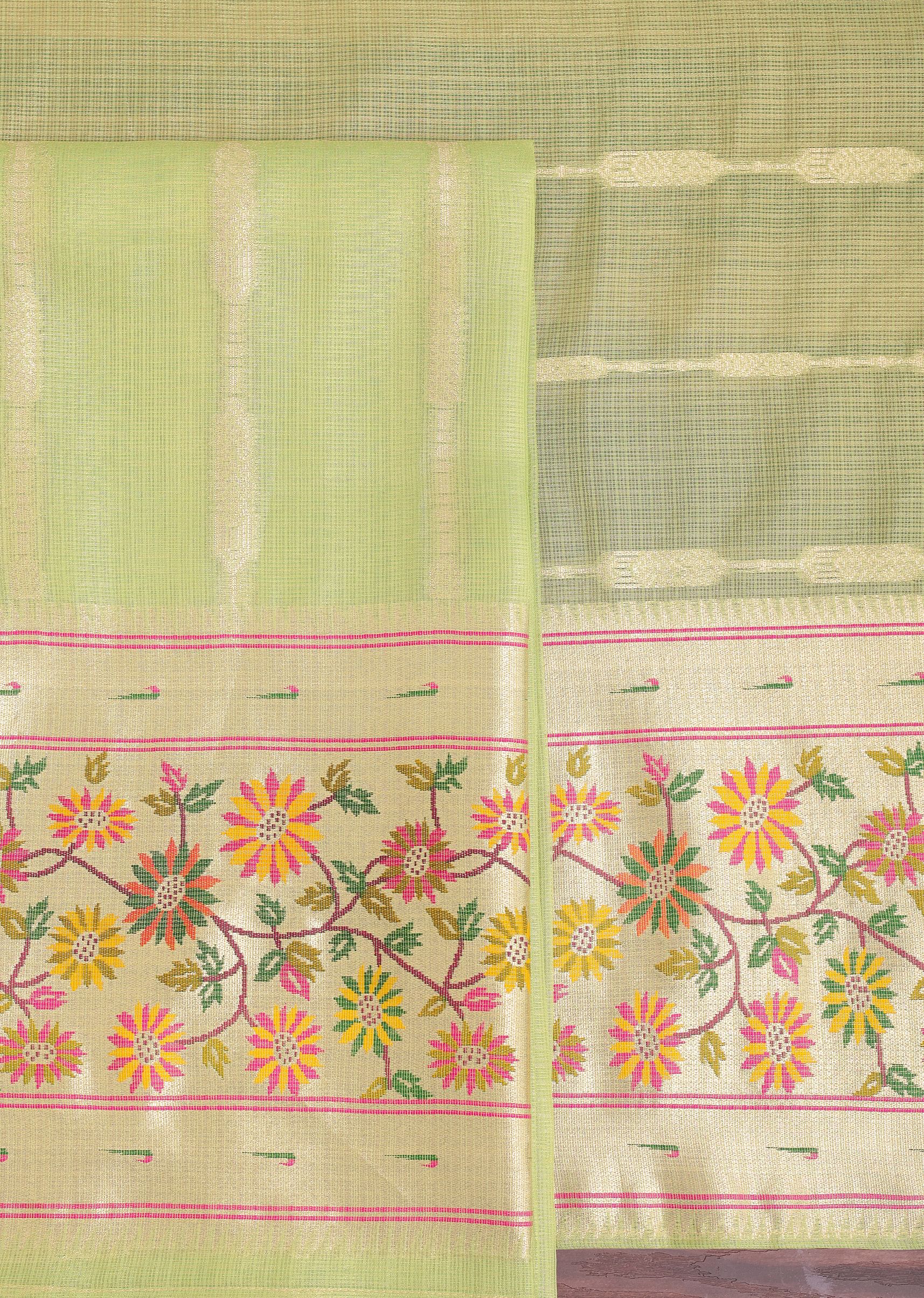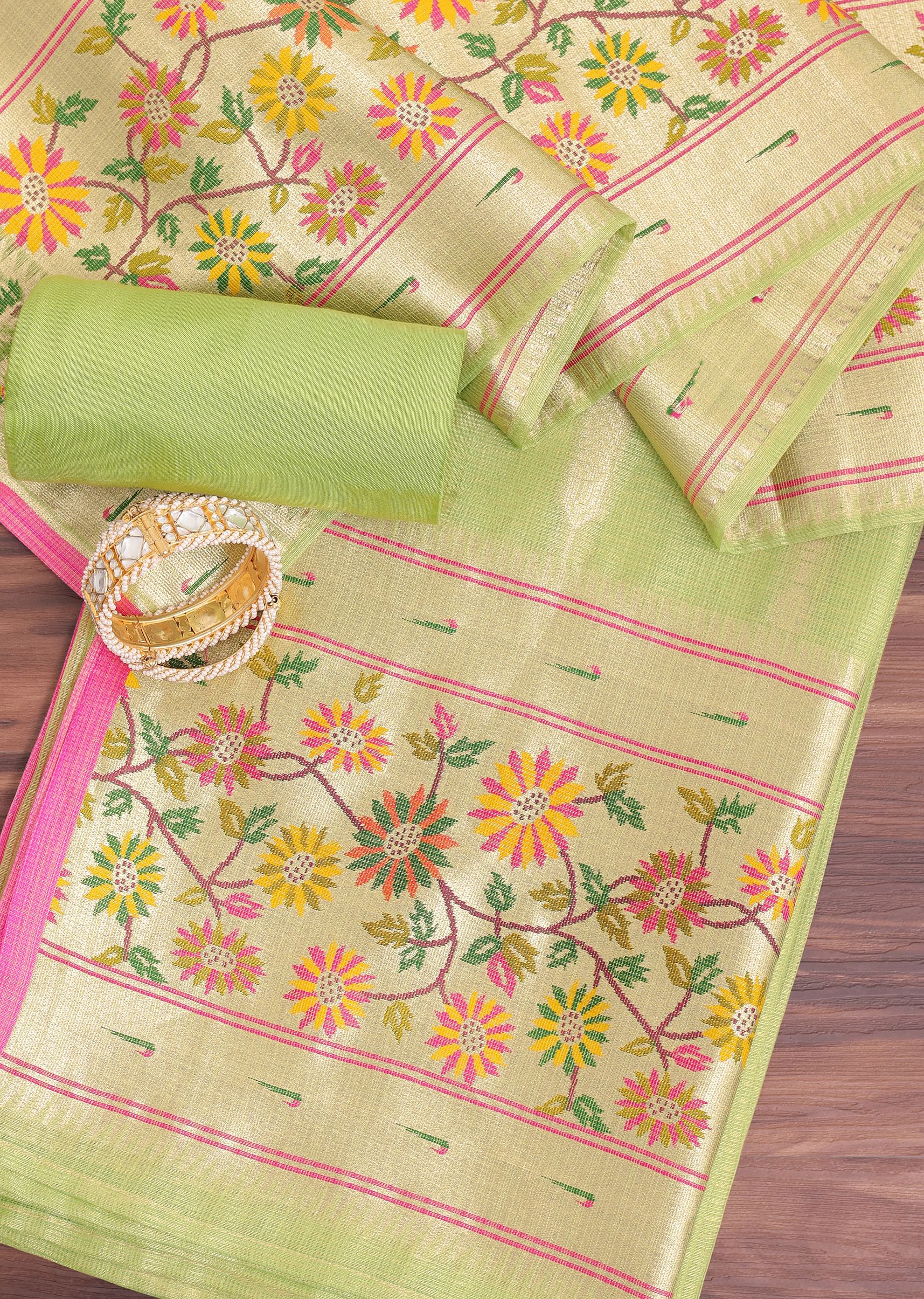 Parrot Green And Gold Paithani Woven Silk Dress Material