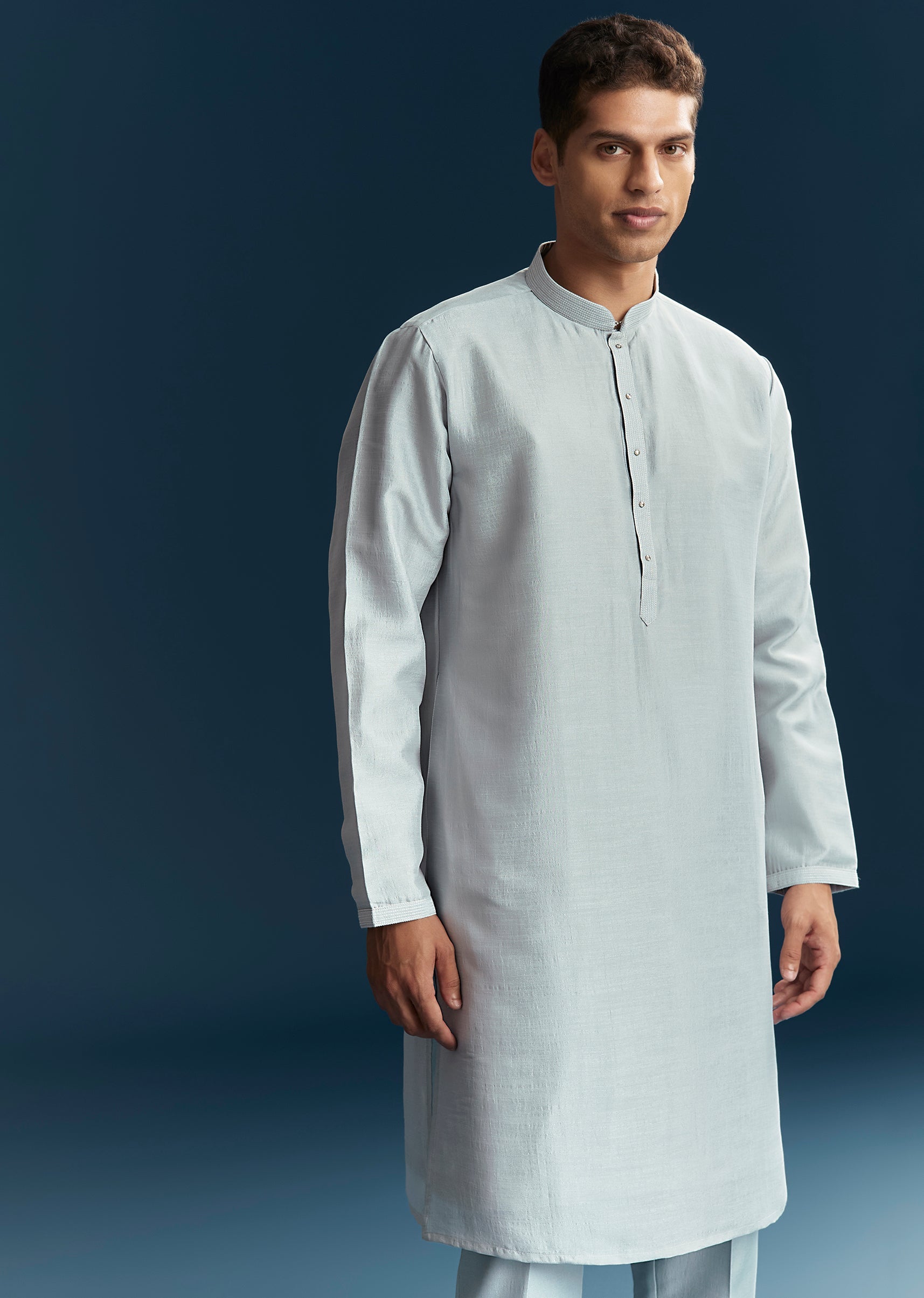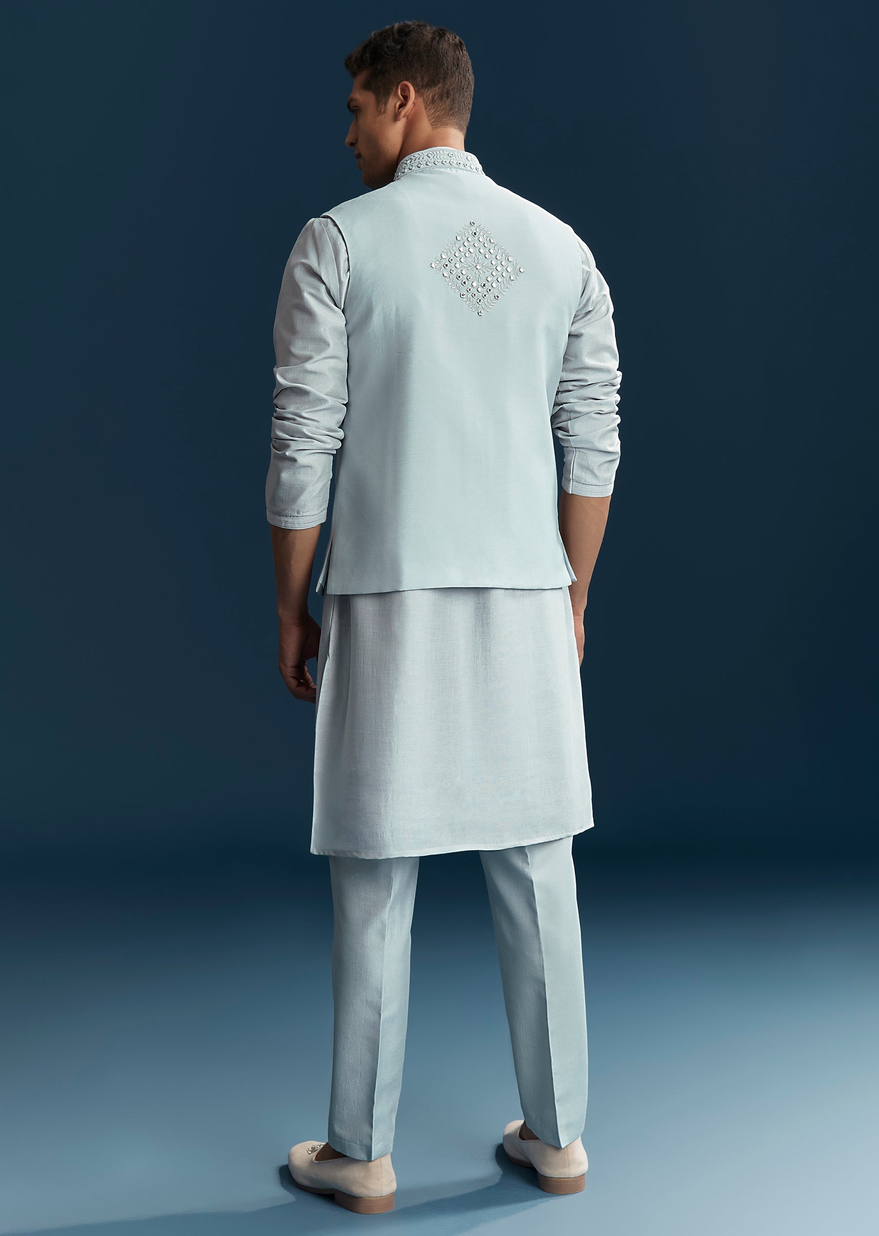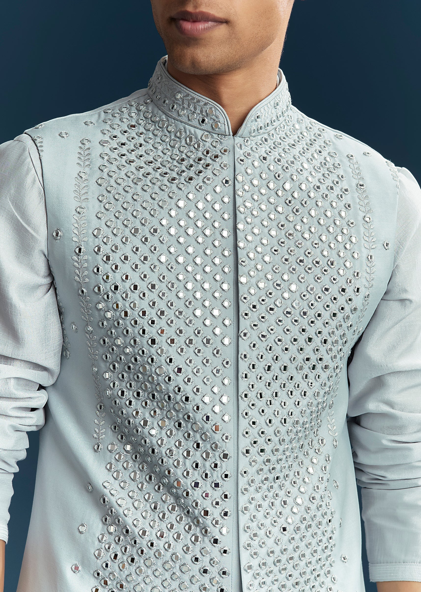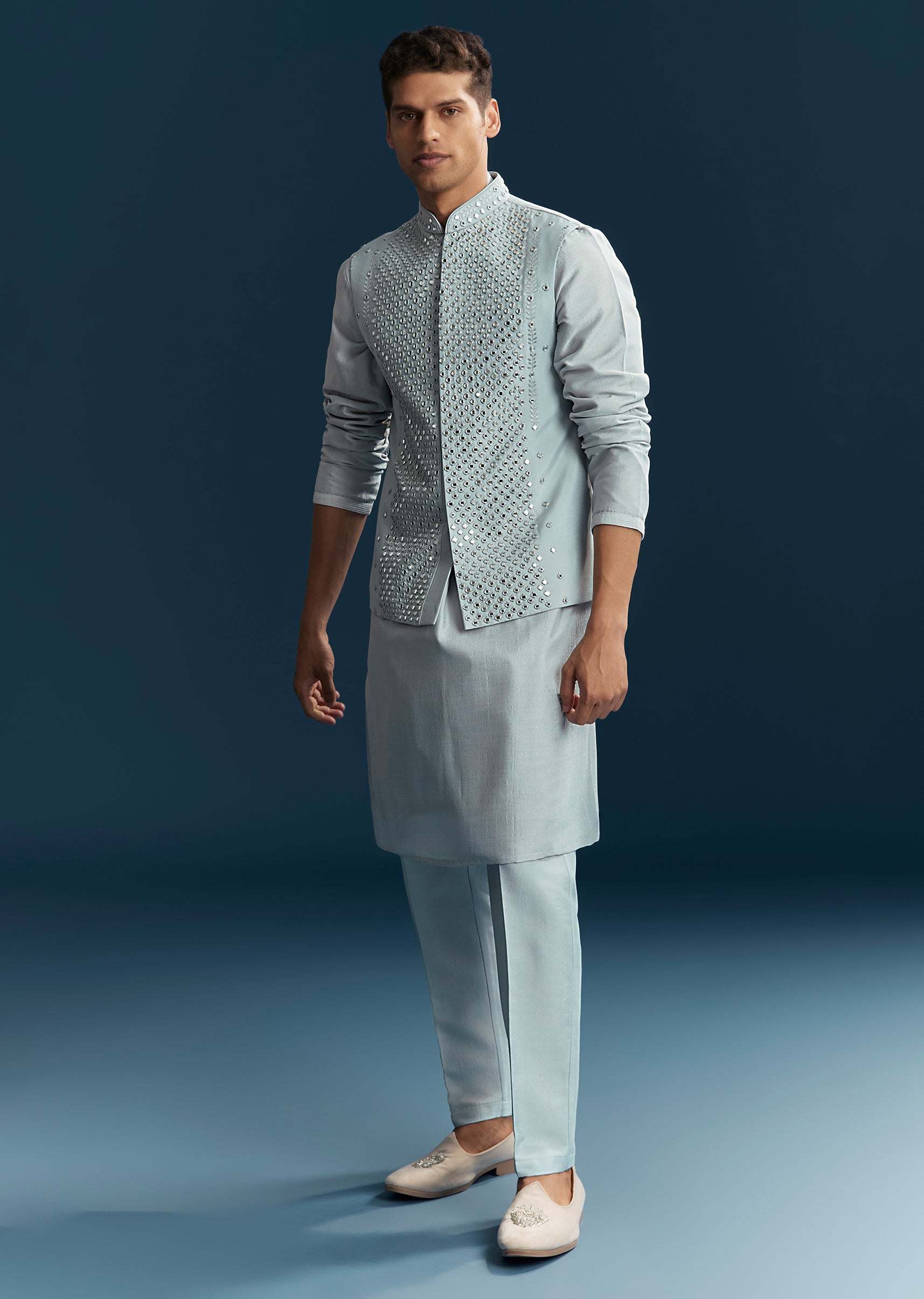 Perfect for engagement and reception celebrations, this blue kurta jacket set in soft pastels combines elegance with festive charm. Crafted in smooth silk fabric, it features intricate thread work paired with mirror detailing that adds subtle sparkle and sophistication. The mandarin collar and full sleeves create a structured and polished silhouette, making it ideal for a groomsman or the groom’s brother. Designed for comfort and style, this outfit ensures a refined and standout presence during special wedding events. Awarded as the Most Trusted Brand, we're delivering styles you love, just as promised.
