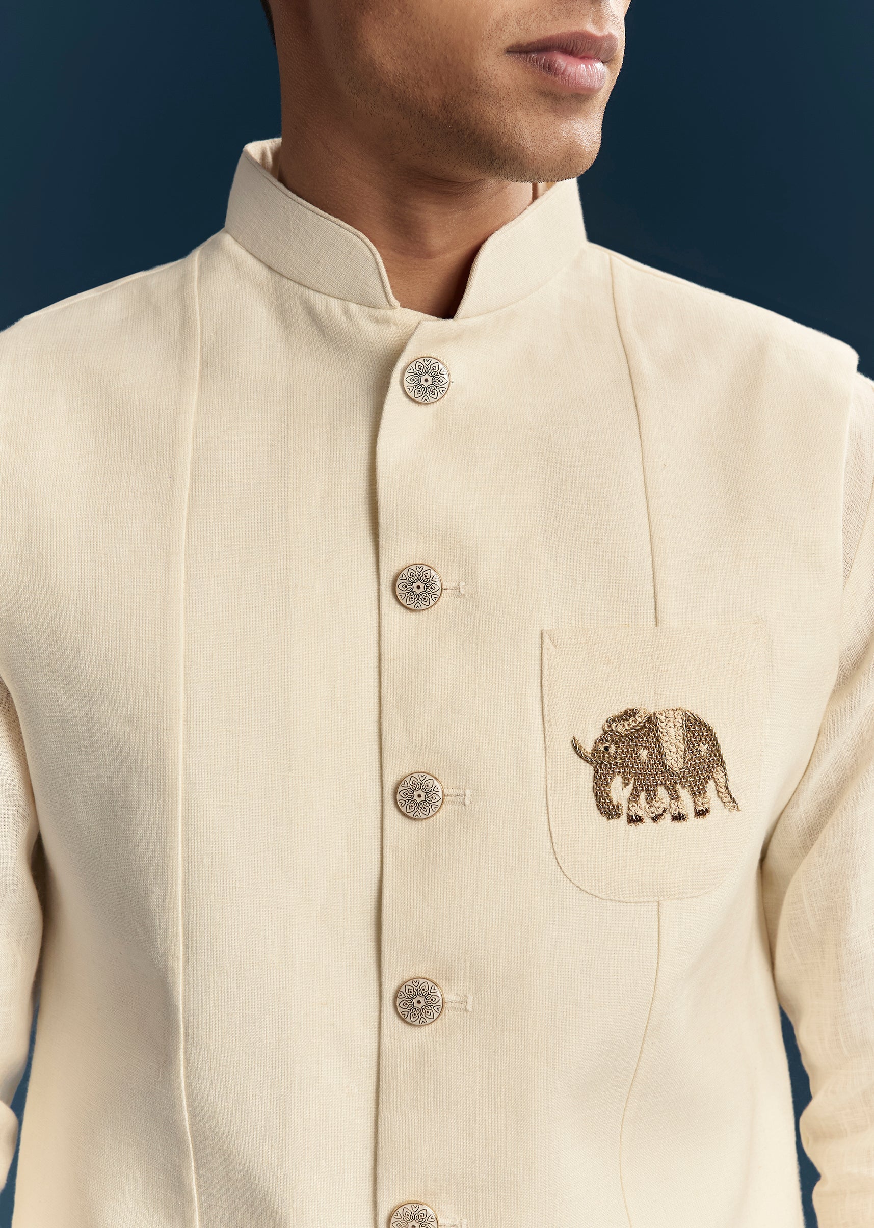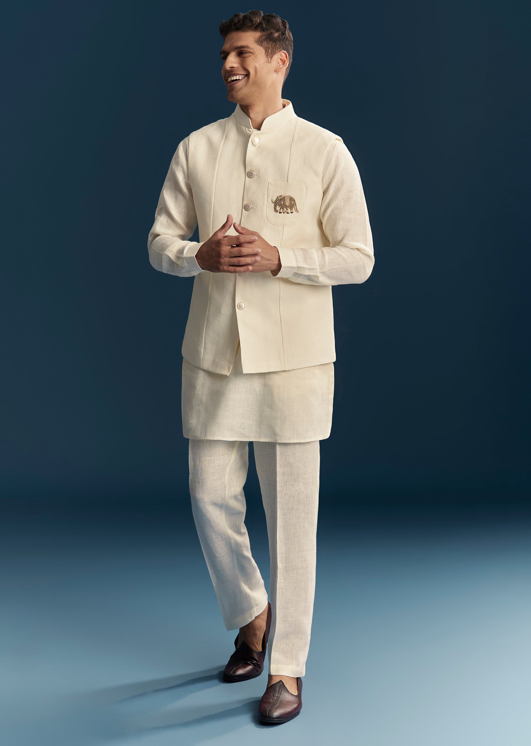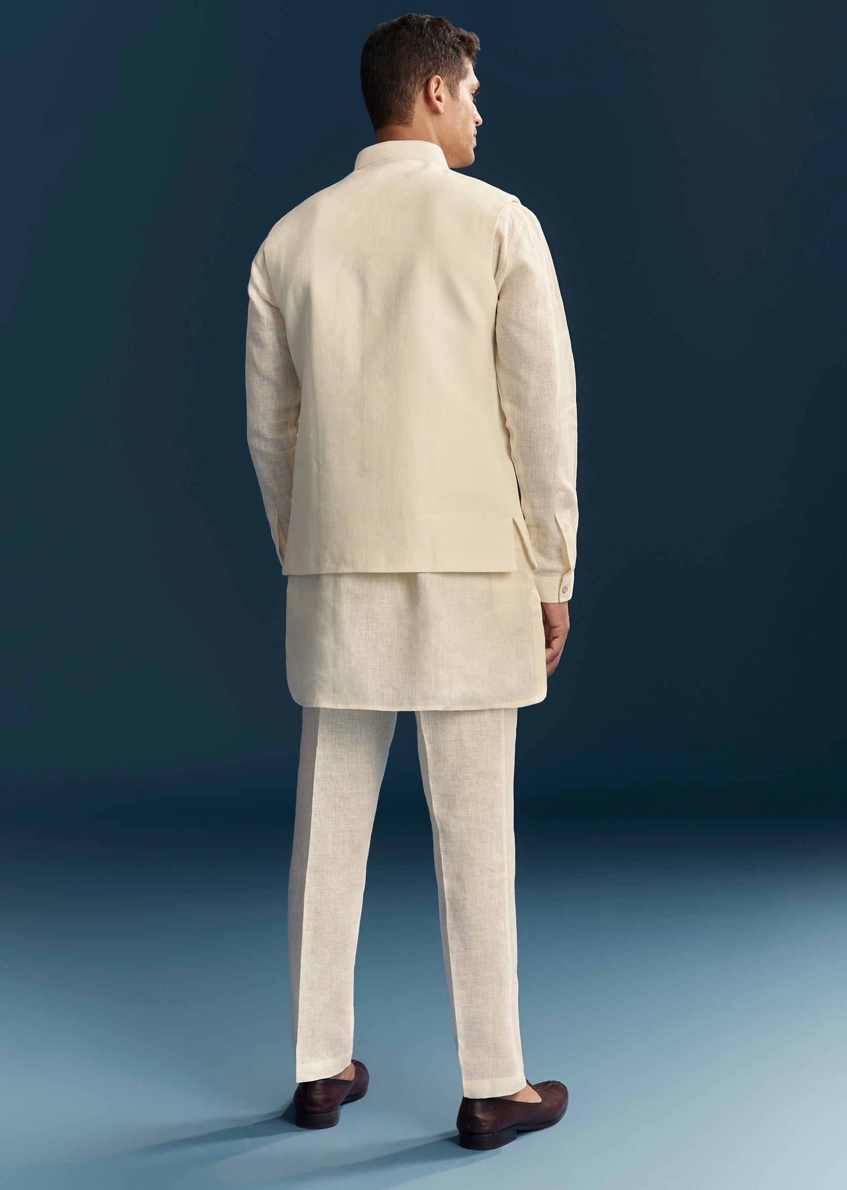 Pastel Off White Silk Kurta Jacket Set With Minimal Thread Detail