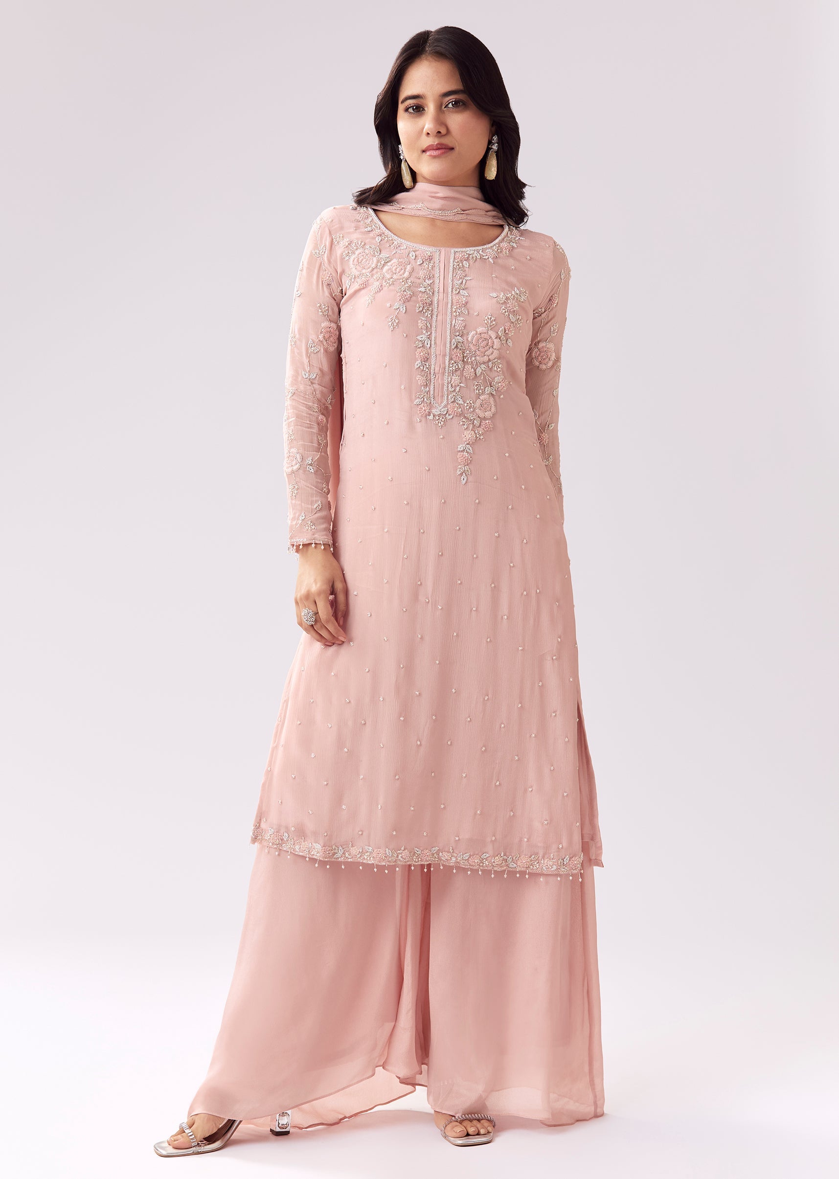 This palazzo suit is designed in a soft pink shade that suits receptions and festive events. The chinon kurta features threadwork with cut-dana accents, adding texture and gentle sparkle. A... More Product Details