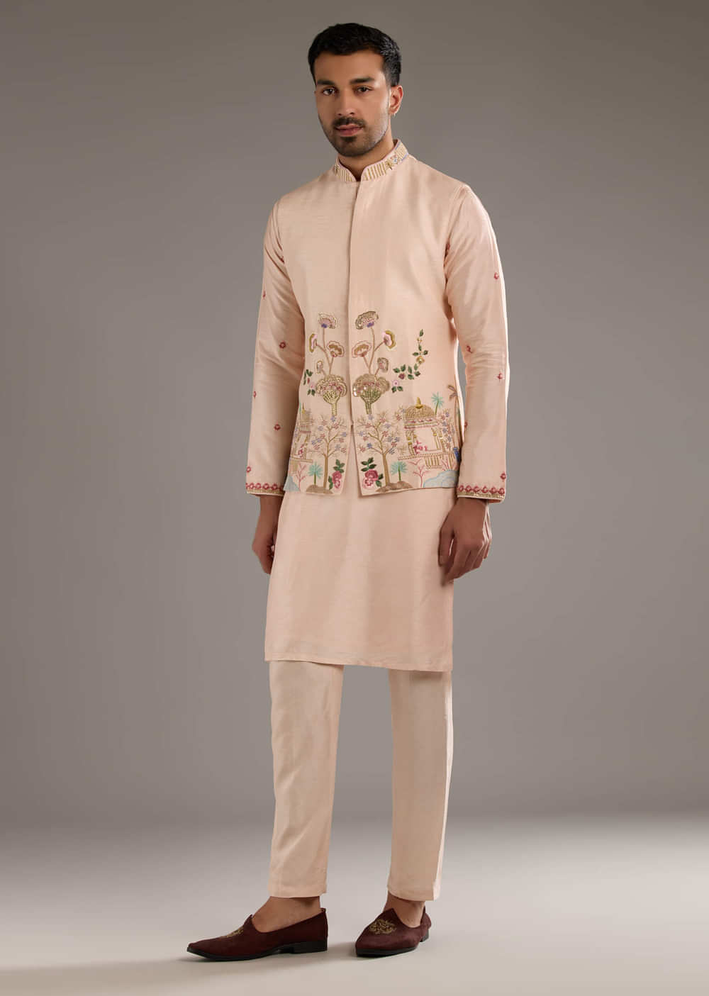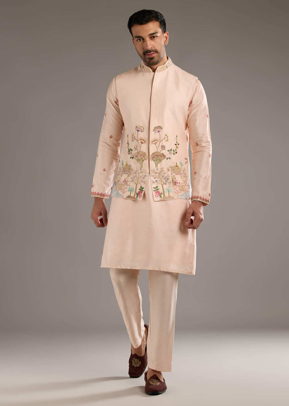 Peach Banarasi Silk Kurta Jacket Set For Men With Heavy Hand Embroidery