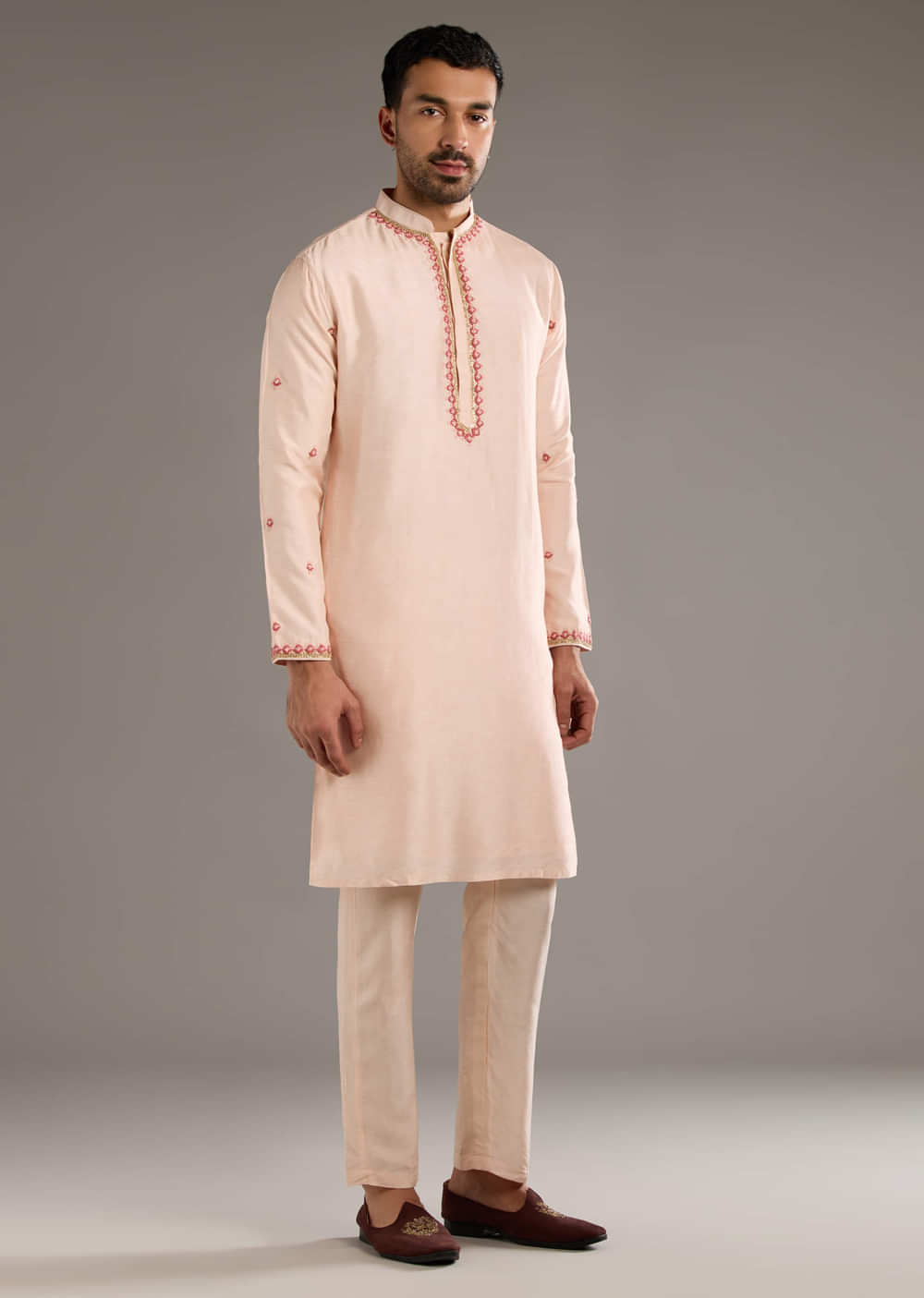 Designed for entrances, this peach kurta jacket set for men in banarasi silk combines zardosi, cutdana and resham work across the jacket for layered shine. The kurta beneath keeps the... More Product Details