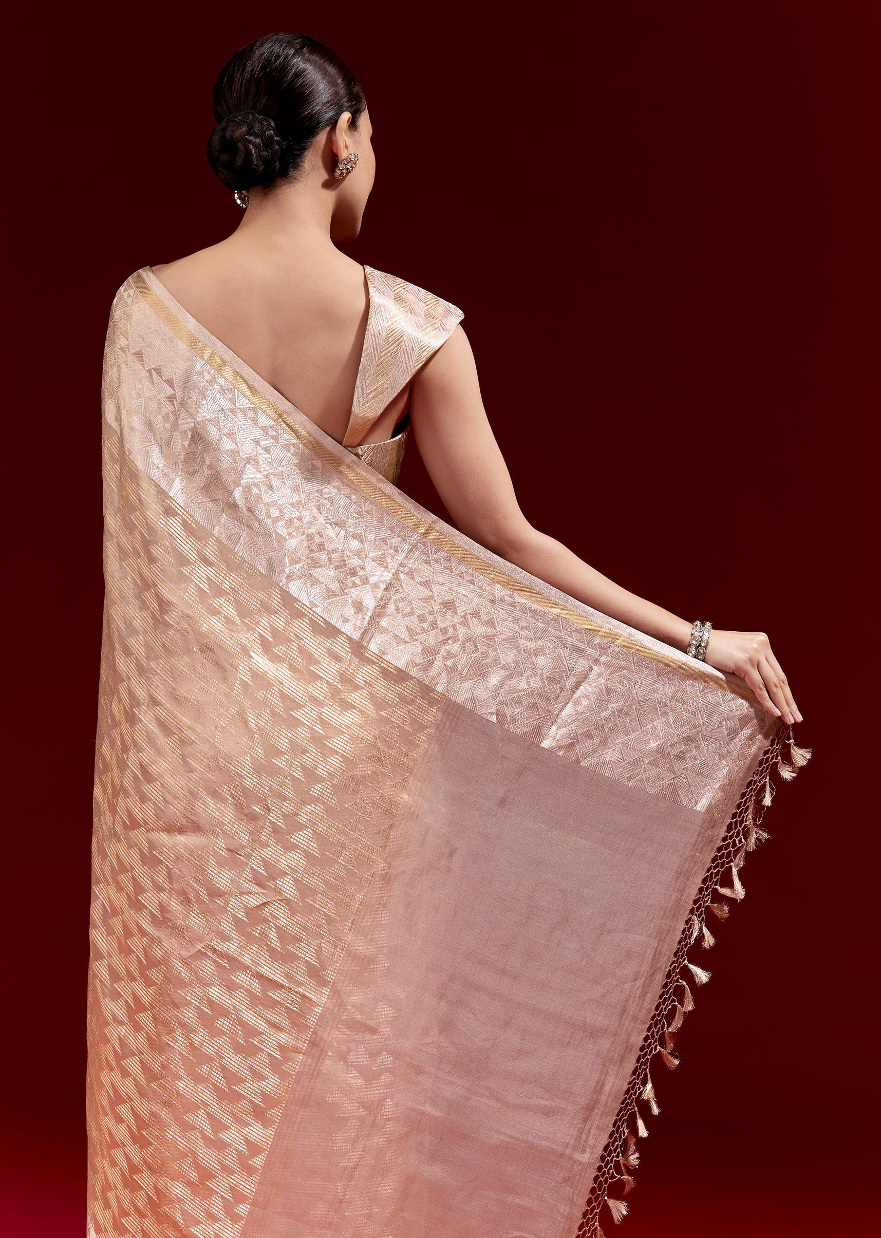 This peach Banarasi tissue saree features a broad border with chanderi and golden geometric horizontal stripes across the body. It comes with zari woven blouse fabric and a belt embroidered... More Product Details