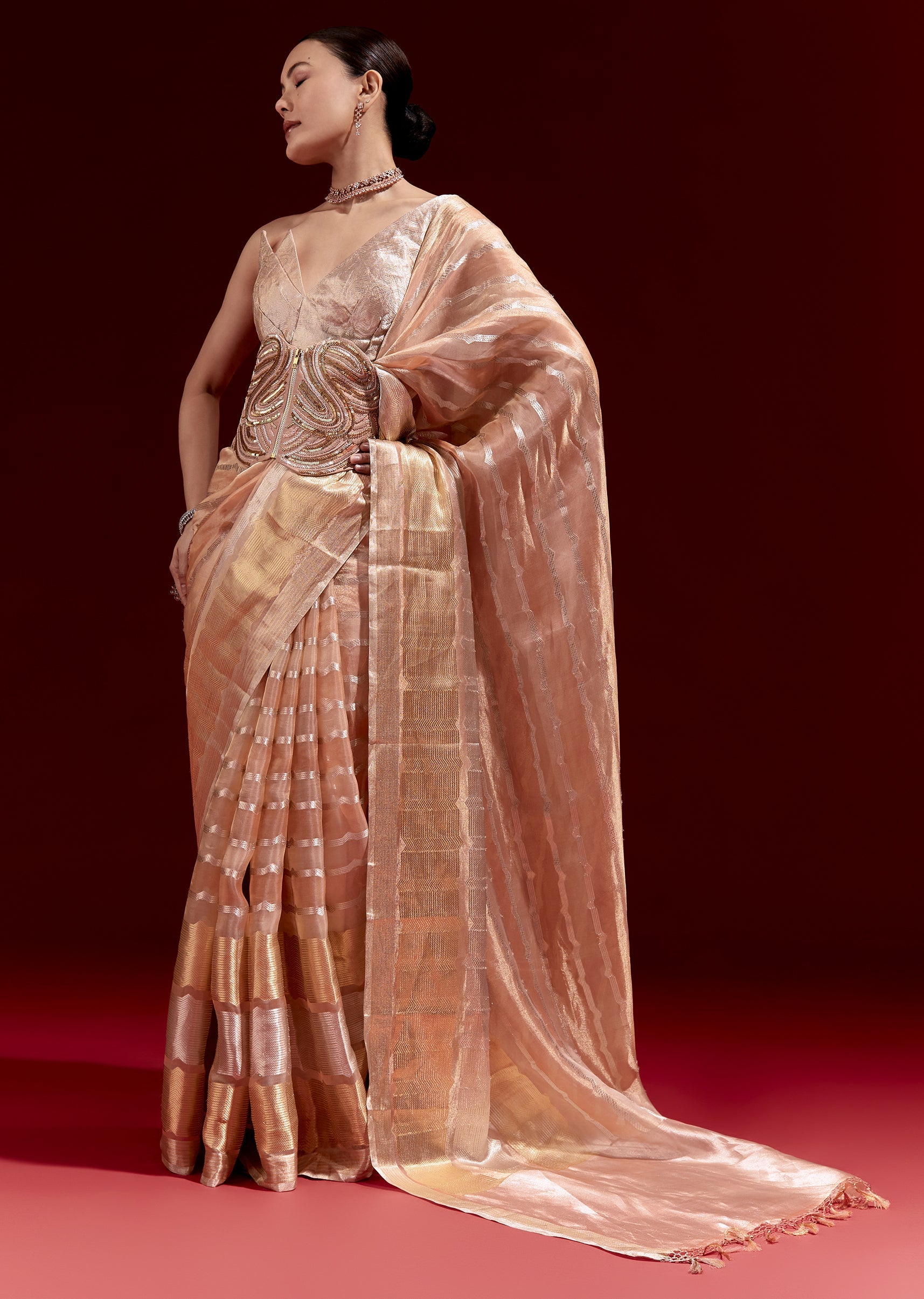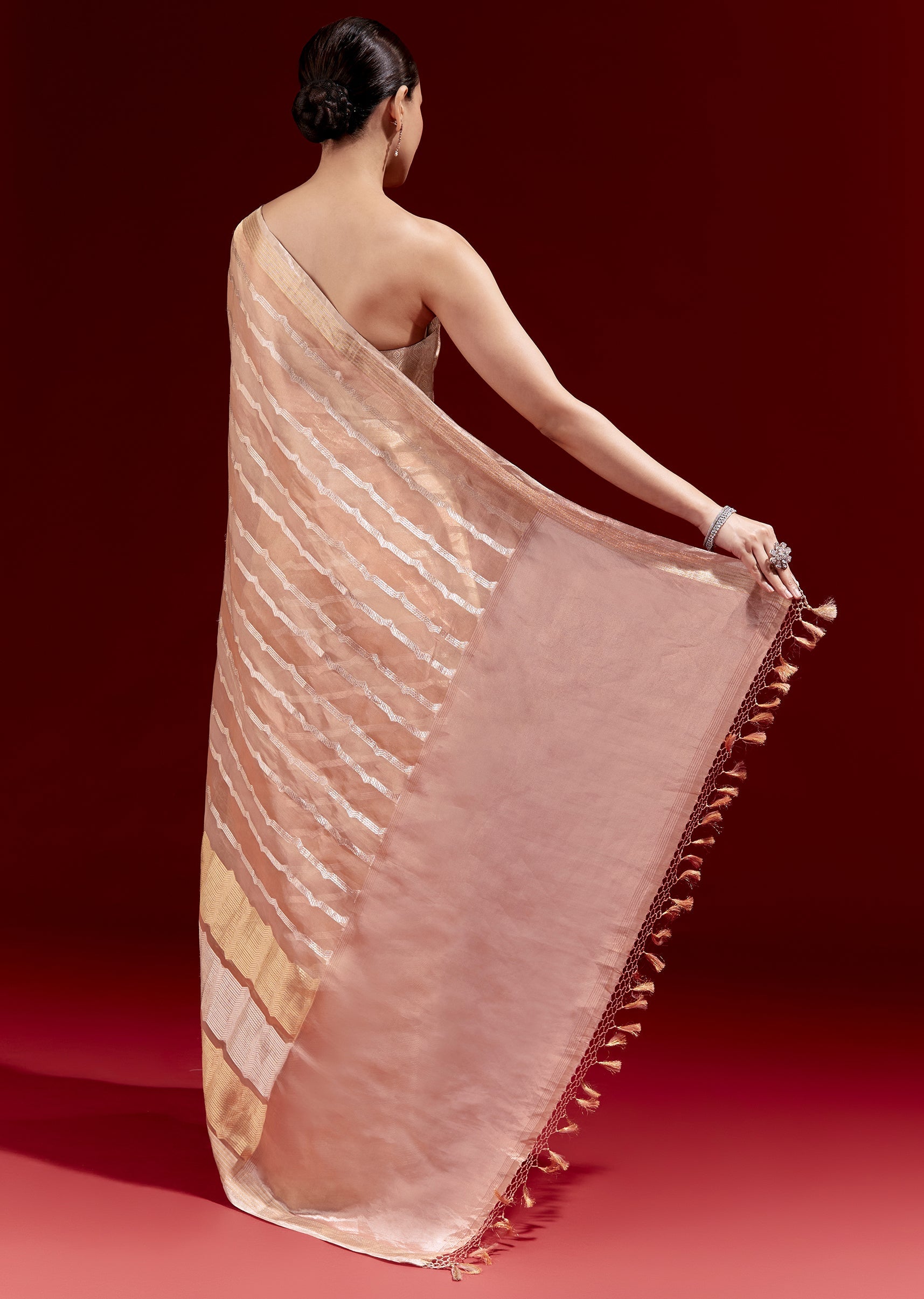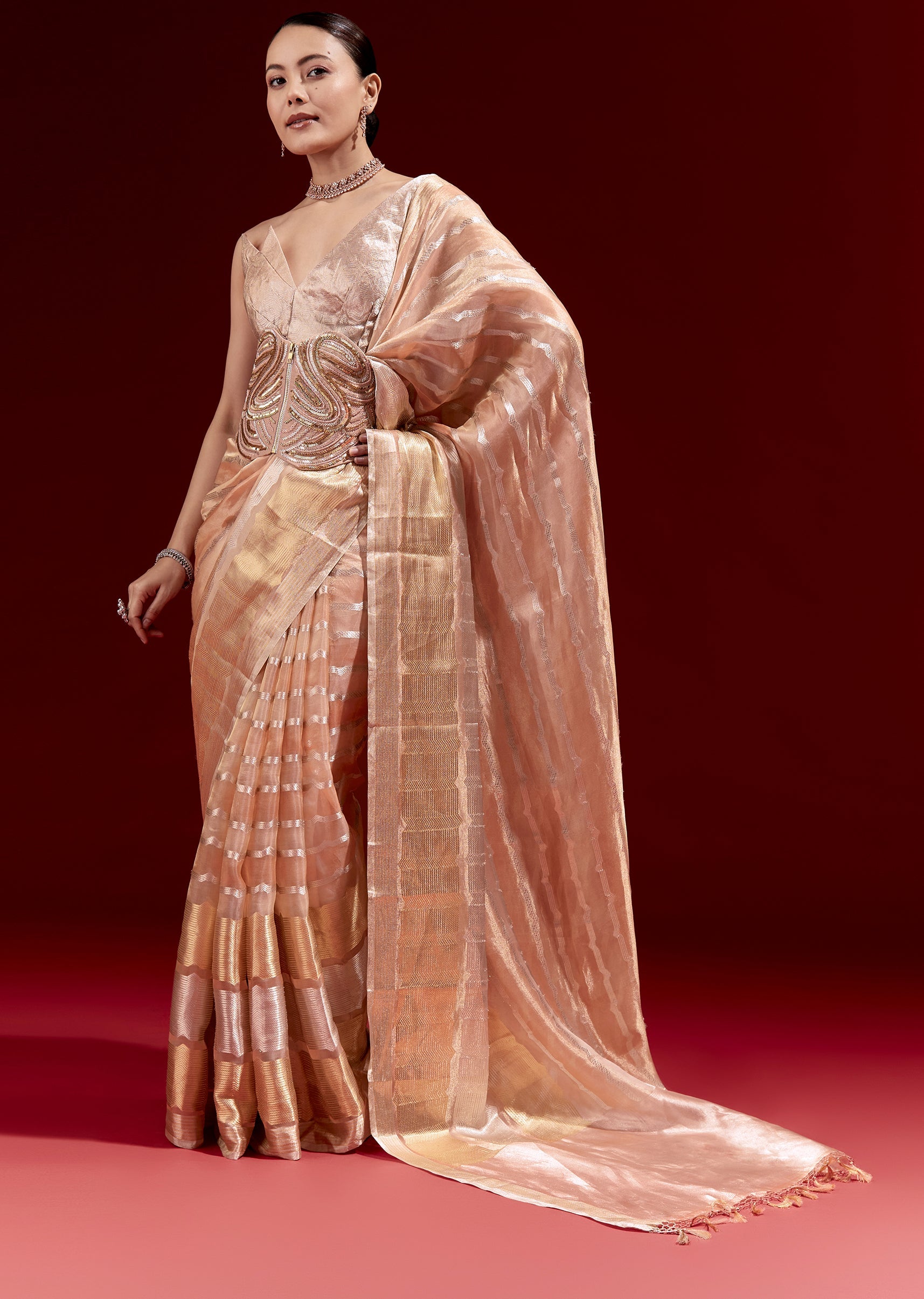 Peach Banarasi Tissue Saree With Chanderi Stripes And Embroidered Cutdana Belt