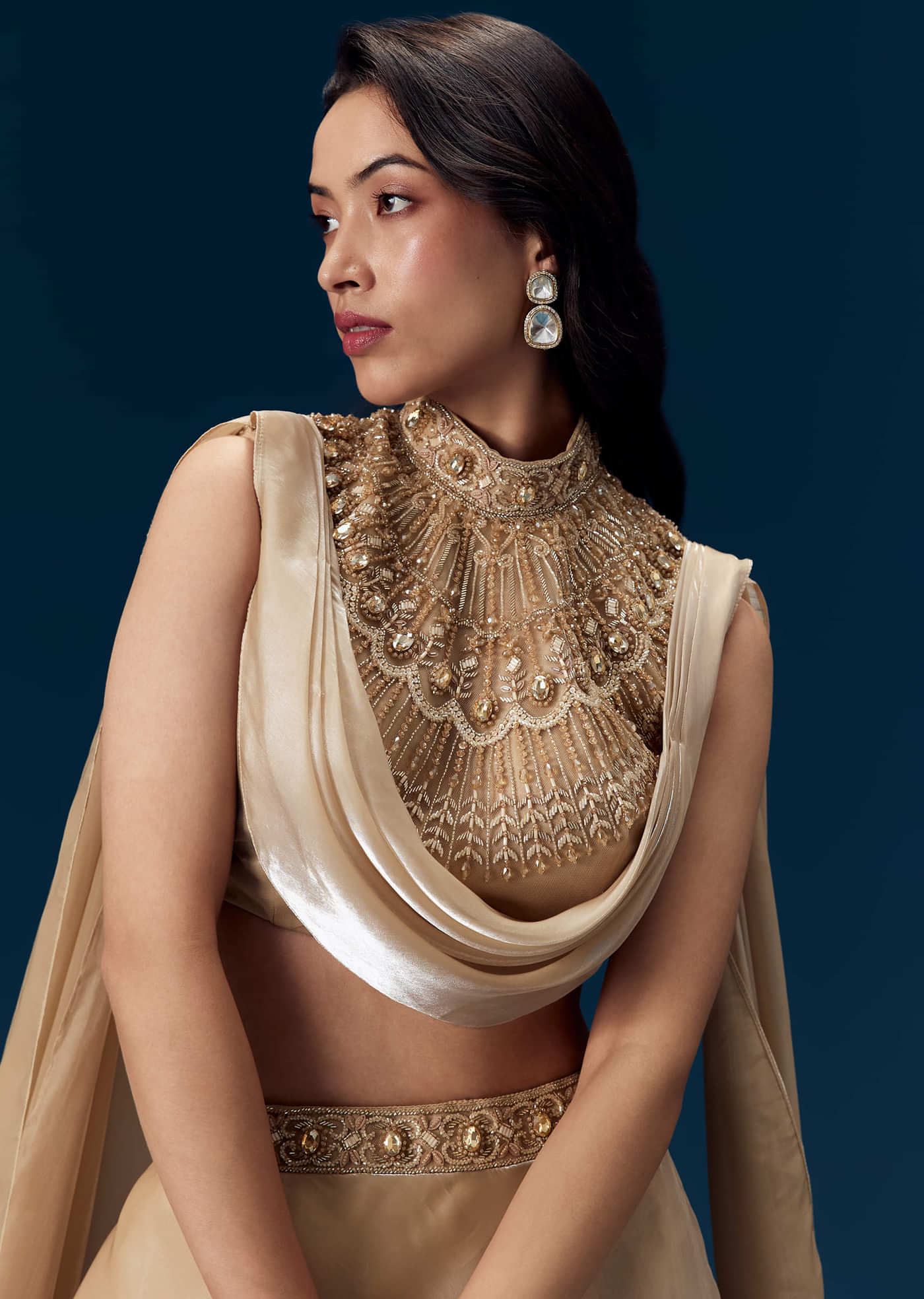 A dreamy statement for contemporary celebrations, this peach organza lehenga set features a chic cowl-draped blouse paired with elegant cape-style sleeves. The fluid silhouette adds soft movement, while the pastel... More Product Details