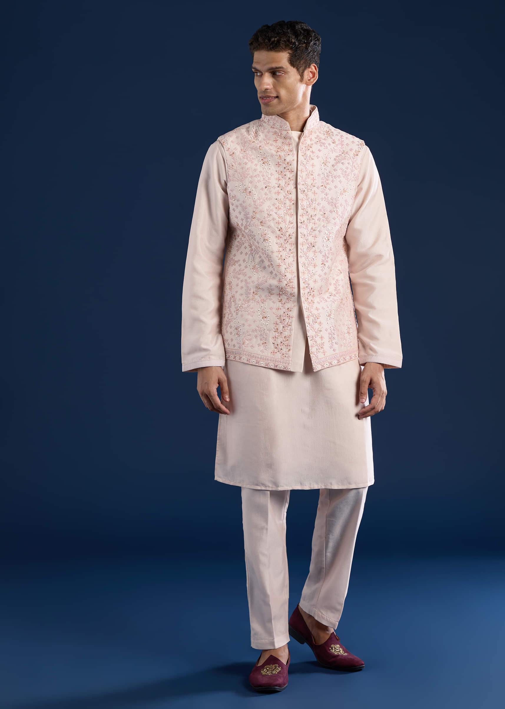 An elevated take on classic elegance, this peach cotton silk jacket and kurta set with coordinated pants embodies refined sophistication. Intricate mirror, thread, and resham lend depth and delicate shimmer... More Product Details
