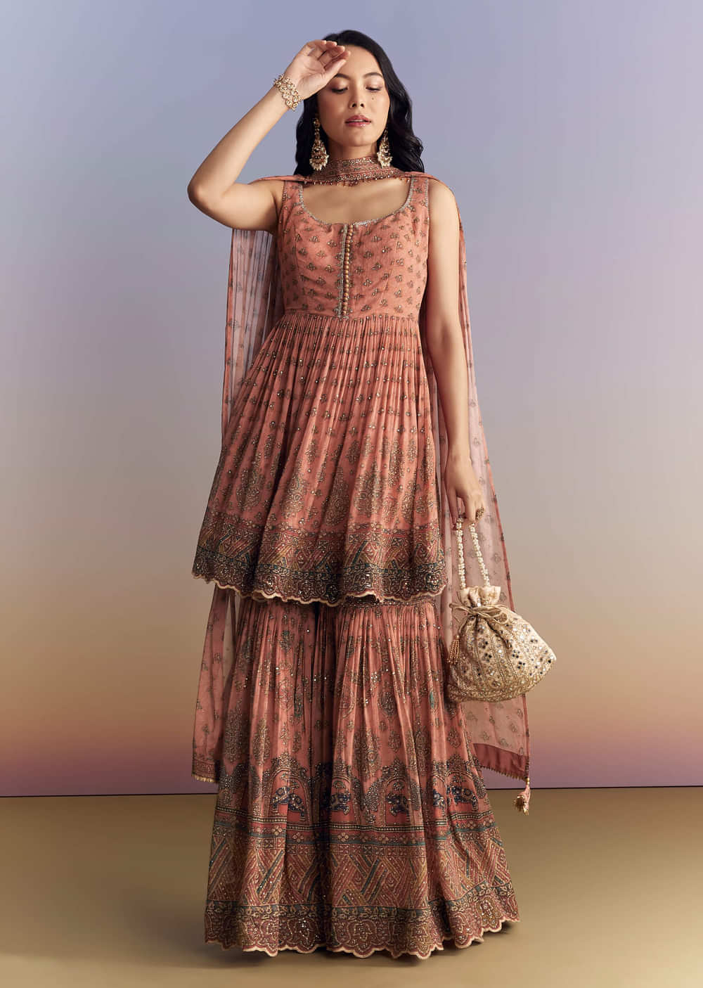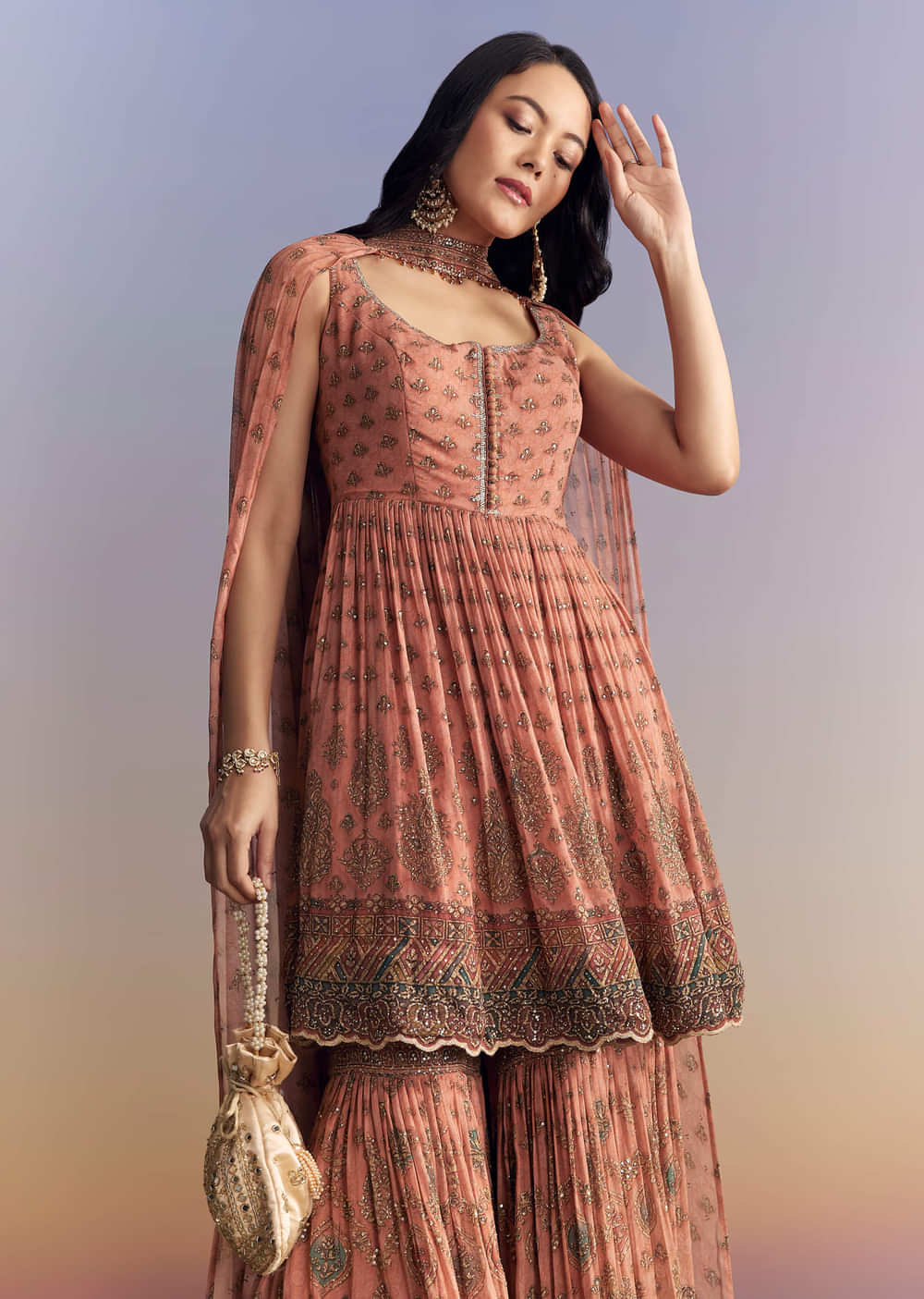 Peach Crepe Sharara Suit With Indie Print And Stone Work